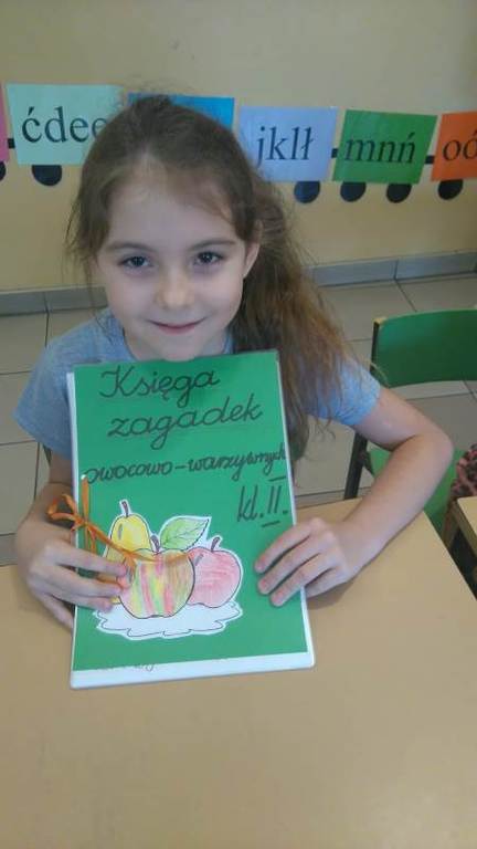 Wykonane przez uczniów prace posłużyły do wykonania Klasowej Księgi Zagadek Owocowo – Warzywnych. Dzieci były bardzo zadowolone ze swojego dzieła. Książka będzie wykorzystana na zajęciach z dziećmi w przedszkolu oraz zostanie zaprezentowana na najbliższym zebraniu rodzicom.