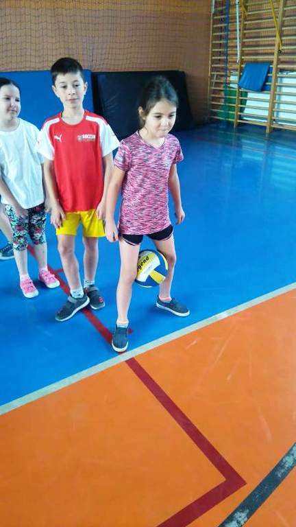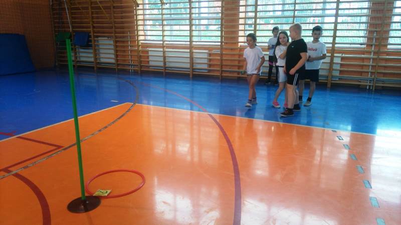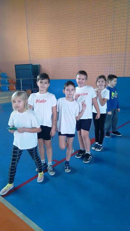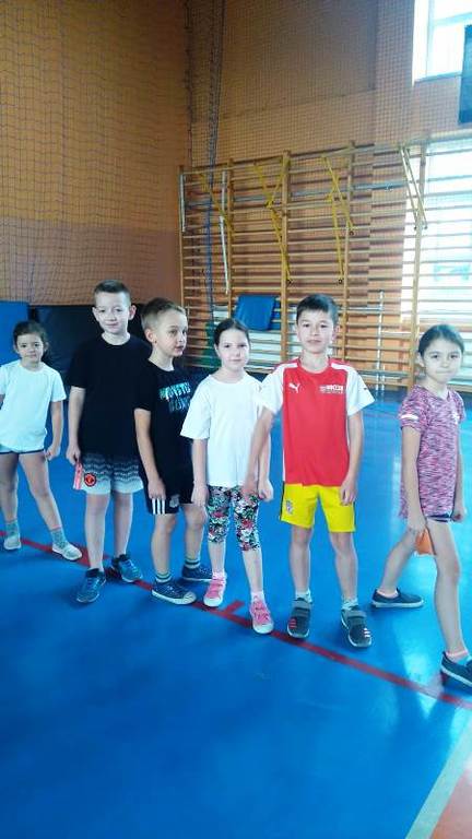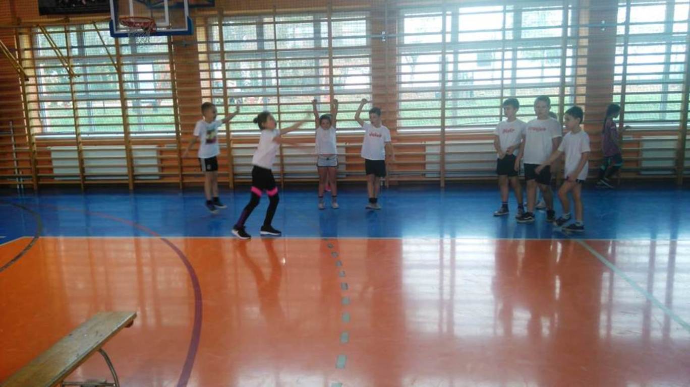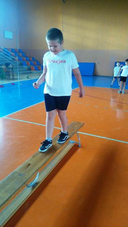 Następnie przystąpiliśmy do ćwiczeń. Na początek dzieci bawiły się w zabawę „Słońce świeci i deszcz pada”. Kolejnym wyzwaniem były już konkurencje ze współzawodnictwem. Dzieci zostały podzielone na dwie pięcioosobowe drużyny, a uczeń niećwiczący został pomocnikiem, asystentem nauczyciela.