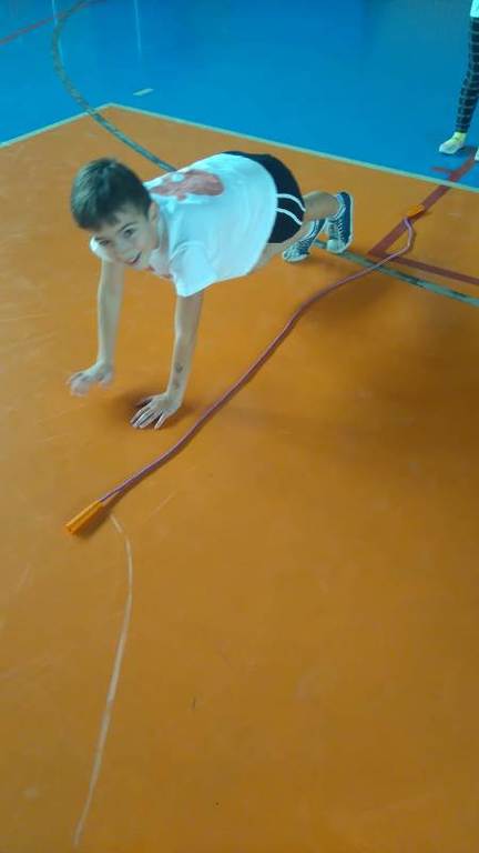 Ostatni wyścig polegał na przejściu na czworakach wzdłuż skakanki, przeskoku przez przeszkodę (plastikowe klocki) i przejściu przez szarfę od dołu. Ten tor przeszkód wymagał największej sprawności od dzieci. Każda wygrana była głośno manifestowana przez małych sportowców.