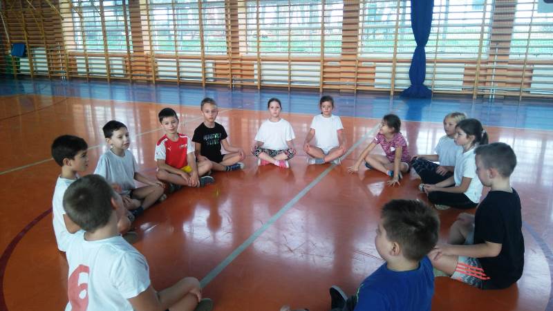 Podczas siadu skrzyżnego w kole przeprowadzono z dziećmi pogadankę na temat: Znaczenia aktywności fizycznej wśród uczniów. Uczniowie zgłaszali się z różnymi odpowiedziami np. dzięki temu, że się ruszamy jesteśmy sprawniejsi, szczuplejsi, szybciej potrafimy reagować na sygnały, jesteśmy zdrowsi, mamy lepszą kondycję. Po wspólnej dyskusji nauczyciel podsumował najważniejsze informacje o roli aktywności fizycznej w życiu każdego ucznia.
