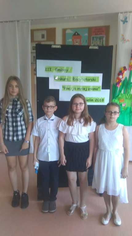 4 czerwca 2018 r. w Szkole Podstawowej w Mycielinie odbył się III Gminny Konkurs Recytatorski „Poezja mniej znana”. W w/w konkursie naszą placówkę reprezentowali: Natalia Langa, Kacper Wojtasik, Majka Durkiewicz oraz Eliza Dorabiała. W kategorii klas IV-VI III miejsce zajął uczeń klasy piątej Kacper Wojtasik, który ujął jury swoją interpretacją wiersza Franka Kulki pt. „Uparty dureń”. Wszystkim uczniom gratulujemy wspaniałego występu i życzymy sukcesów w kolejnych konkursach.