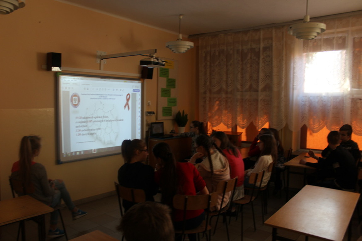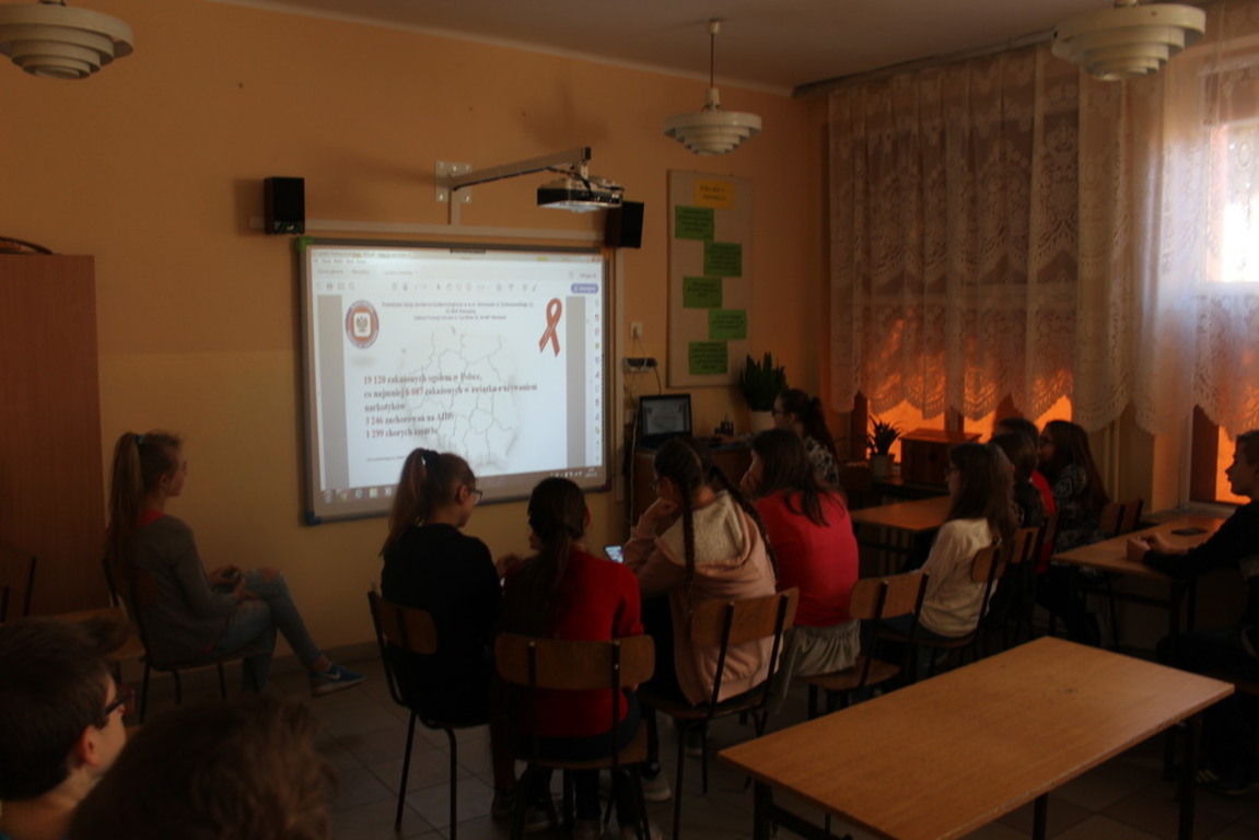 W dniu 5 grudnia 2018 r. uczniowie klasy VII i VIII podczas godziny z wychowawcą obejrzeli prezentację multimedialną przygotowaną przez Samorząd Uczniowski n/t: Światowy Dzień Walki z AIDS.