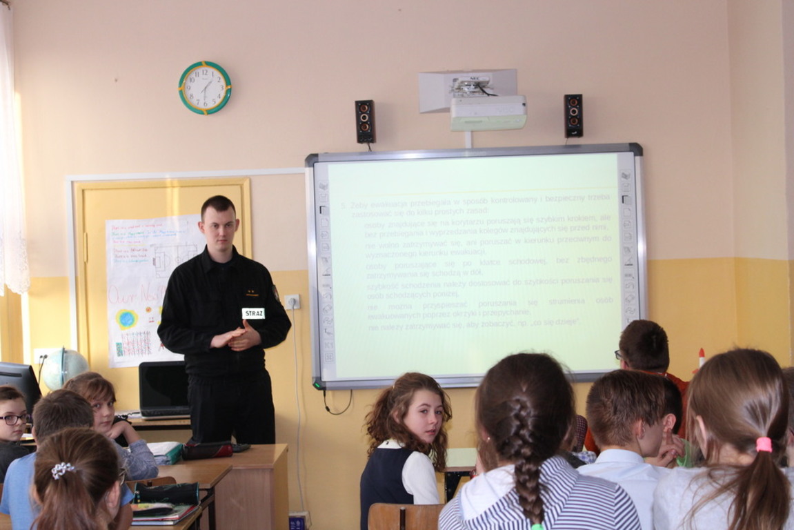 W dniu 17 grudnia naszą Szkołę odwiedził przedstawiciel Państwowej Straży Pożarnej w Kaliszu. Podczas spotkania z uczniami klas IV - VIII przedstawił on bardzo ciekawą prezentację na temat zasad postępowania podczas ewakuacji. Uczestnicy spotkania utrwalili podstawowe zasady obowiązujące w czasie ewakuacji. Mieli także okazję usłyszeć wiele ciekawych wskazówek i przykładów z codziennej pracy strażaków.