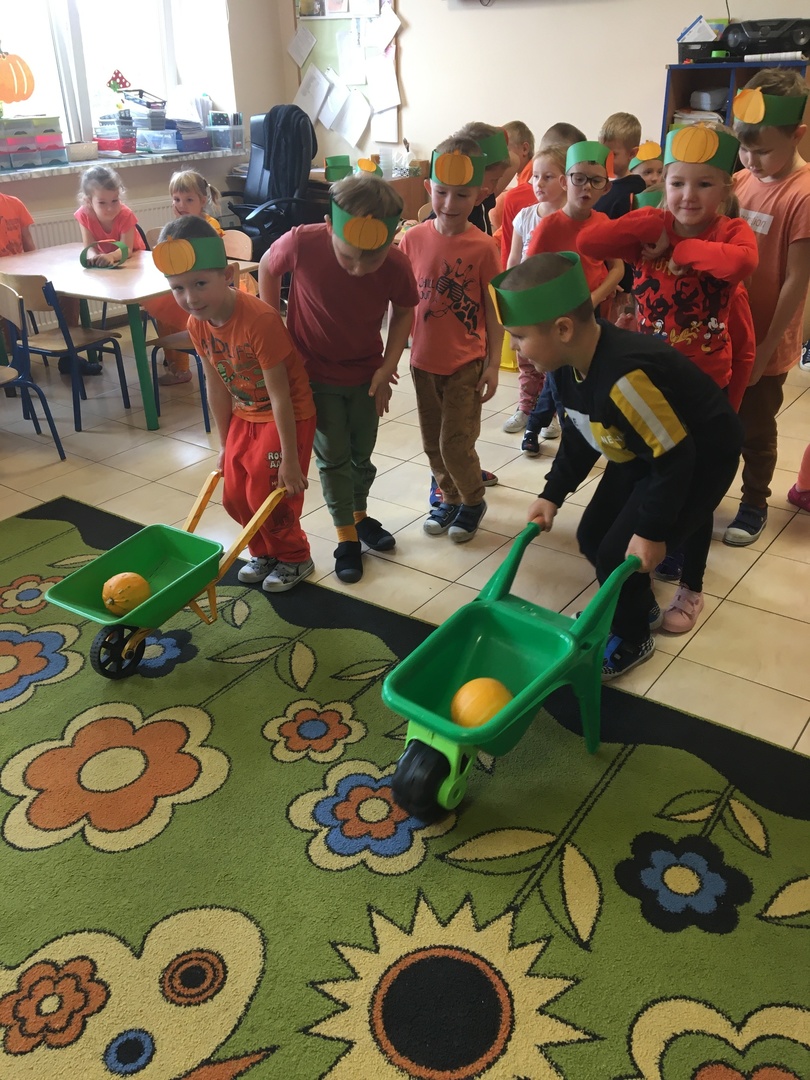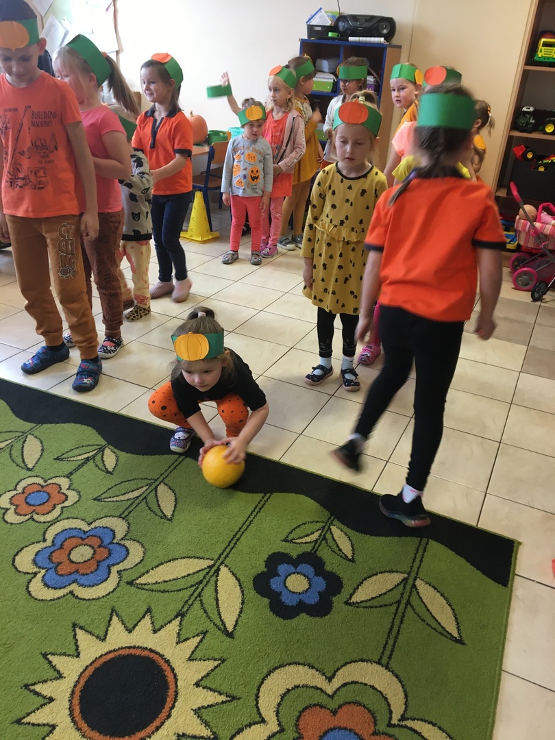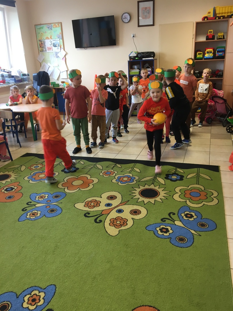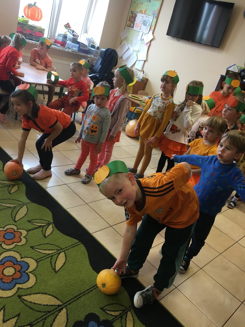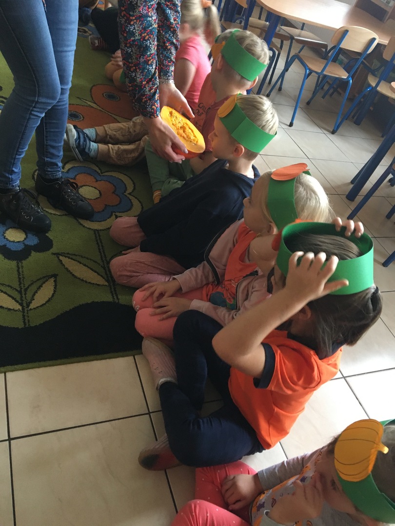 26 października obchodziliśmy w Naszym Przedszkolu Dzień Dyni. Tego dnia wszyscy przyszli do przedszkola ubrani na pomarańczowo. Chętni rodzice przynieśli dynie, których użyliśmy podczas wspólnych gier i zabaw ruchowych. Dzieci otrzymały dyniowe opaski, które chętnie, po skończonych zajęciach, zabrały do domu. Na zakończenie mogły spróbować dyniowego przysmaku - ciasta dyniowego przygotowanego przez p. Krysię
