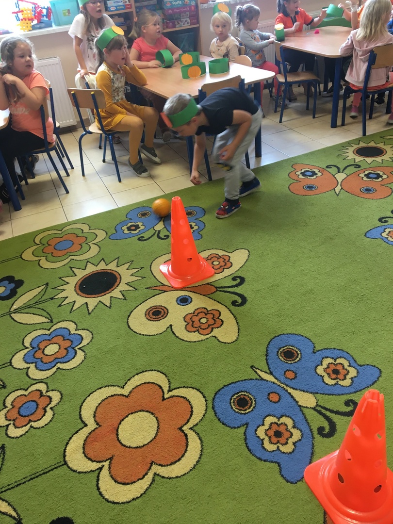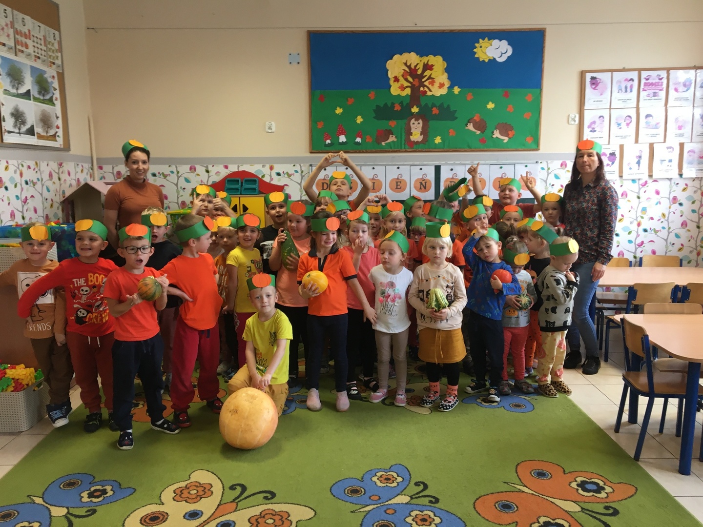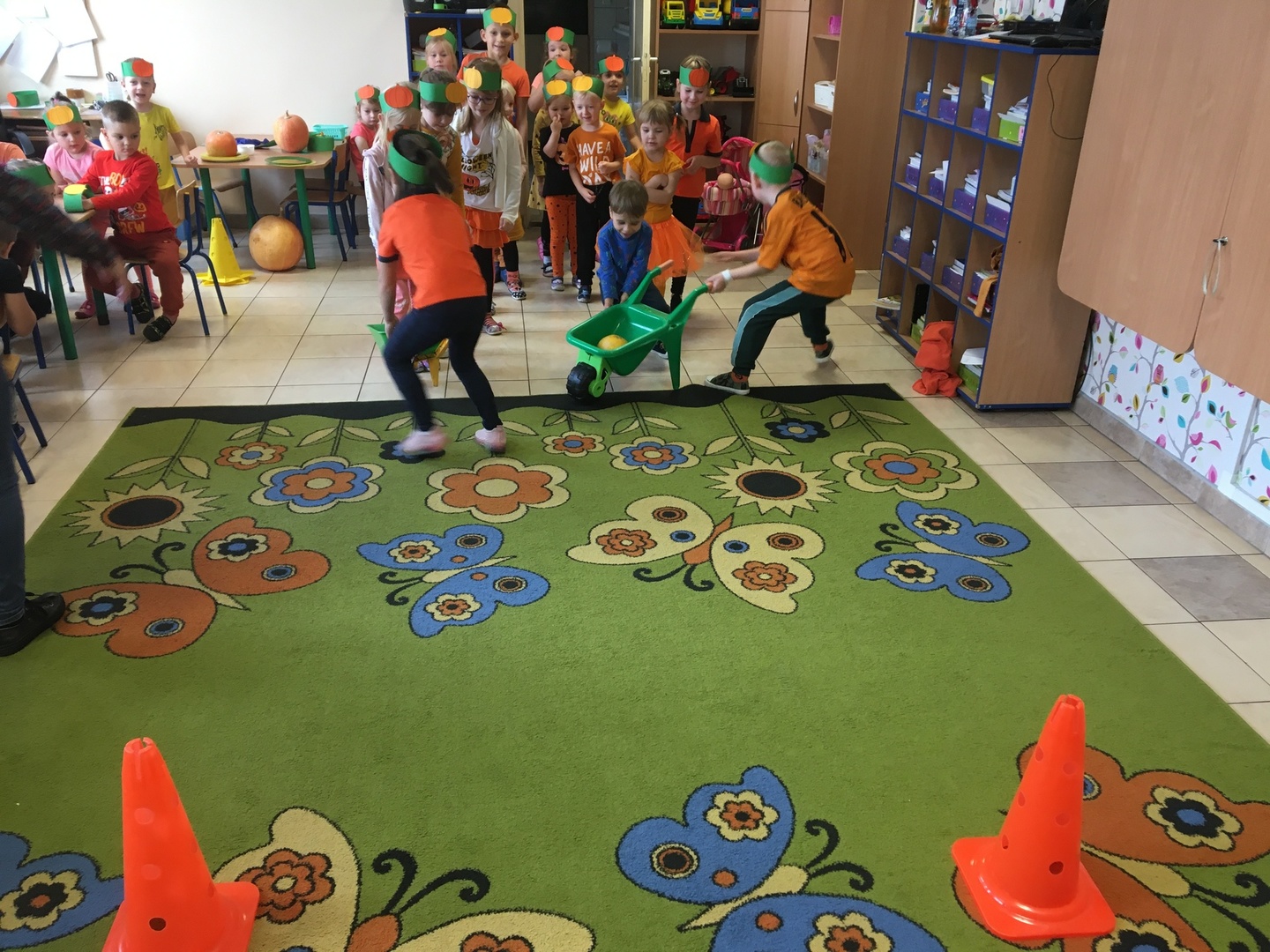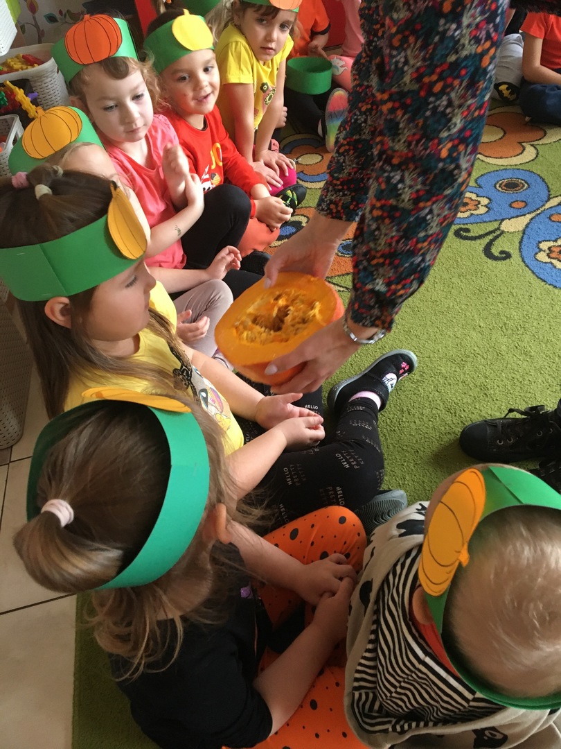26 października obchodziliśmy w Naszym Przedszkolu Dzień Dyni. Tego dnia wszyscy przyszli do przedszkola ubrani na pomarańczowo. Chętni rodzice przynieśli dynie, których użyliśmy podczas wspólnych gier i zabaw ruchowych. Dzieci otrzymały dyniowe opaski, które chętnie, po skończonych zajęciach, zabrały do domu. Na zakończenie mogły spróbować dyniowego przysmaku - ciasta dyniowego przygotowanego przez p. Krysię