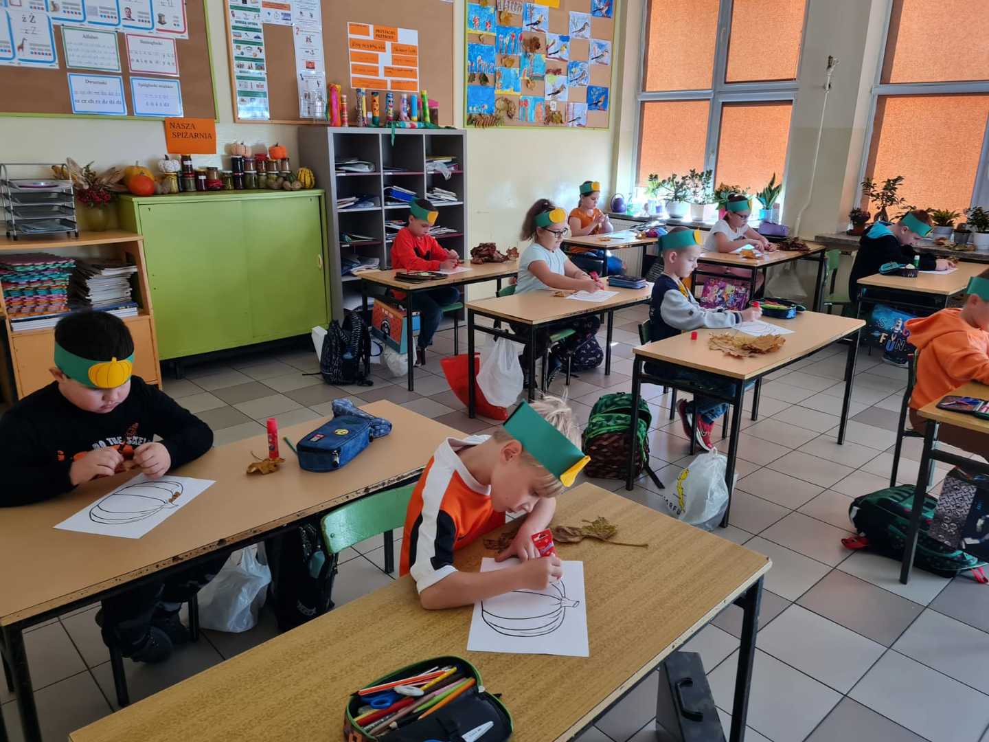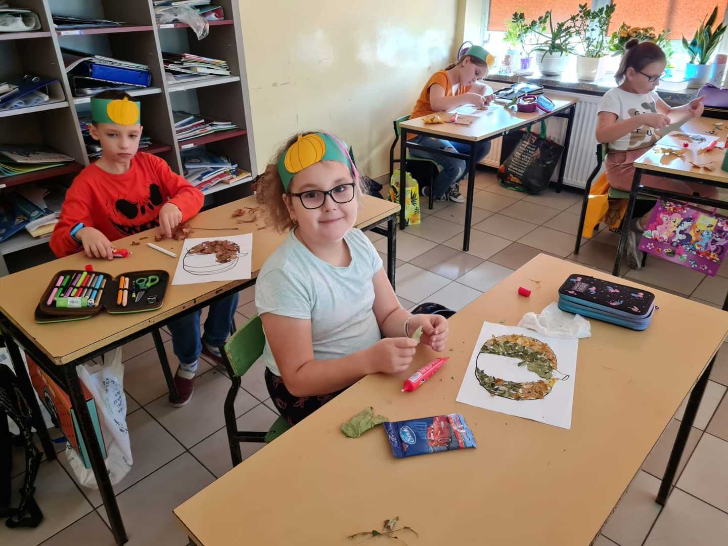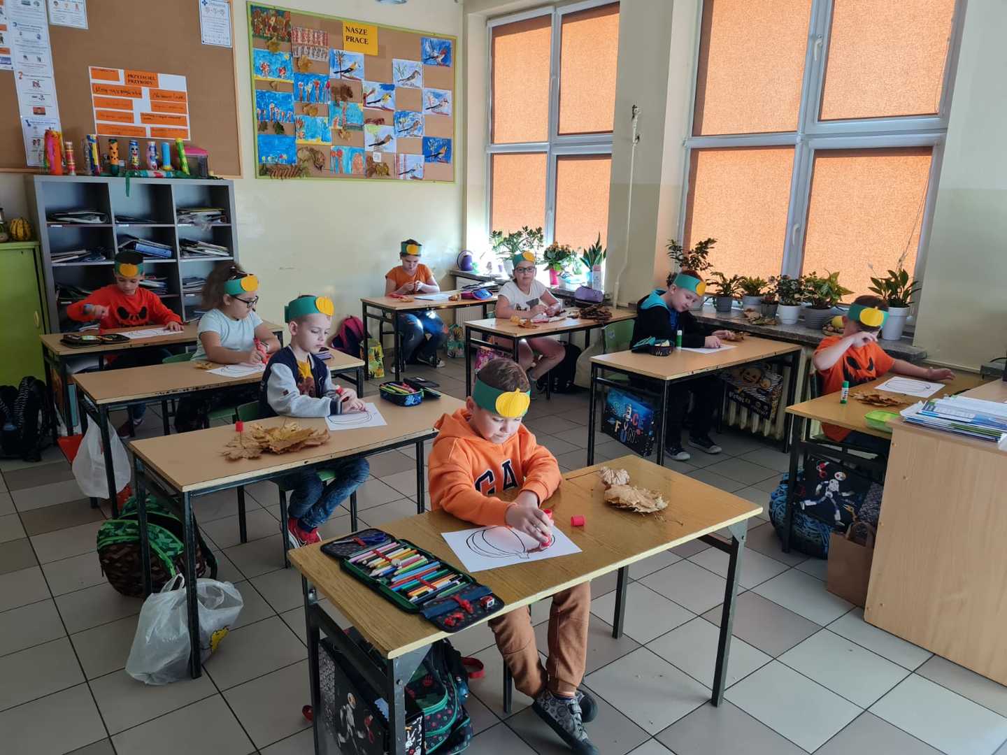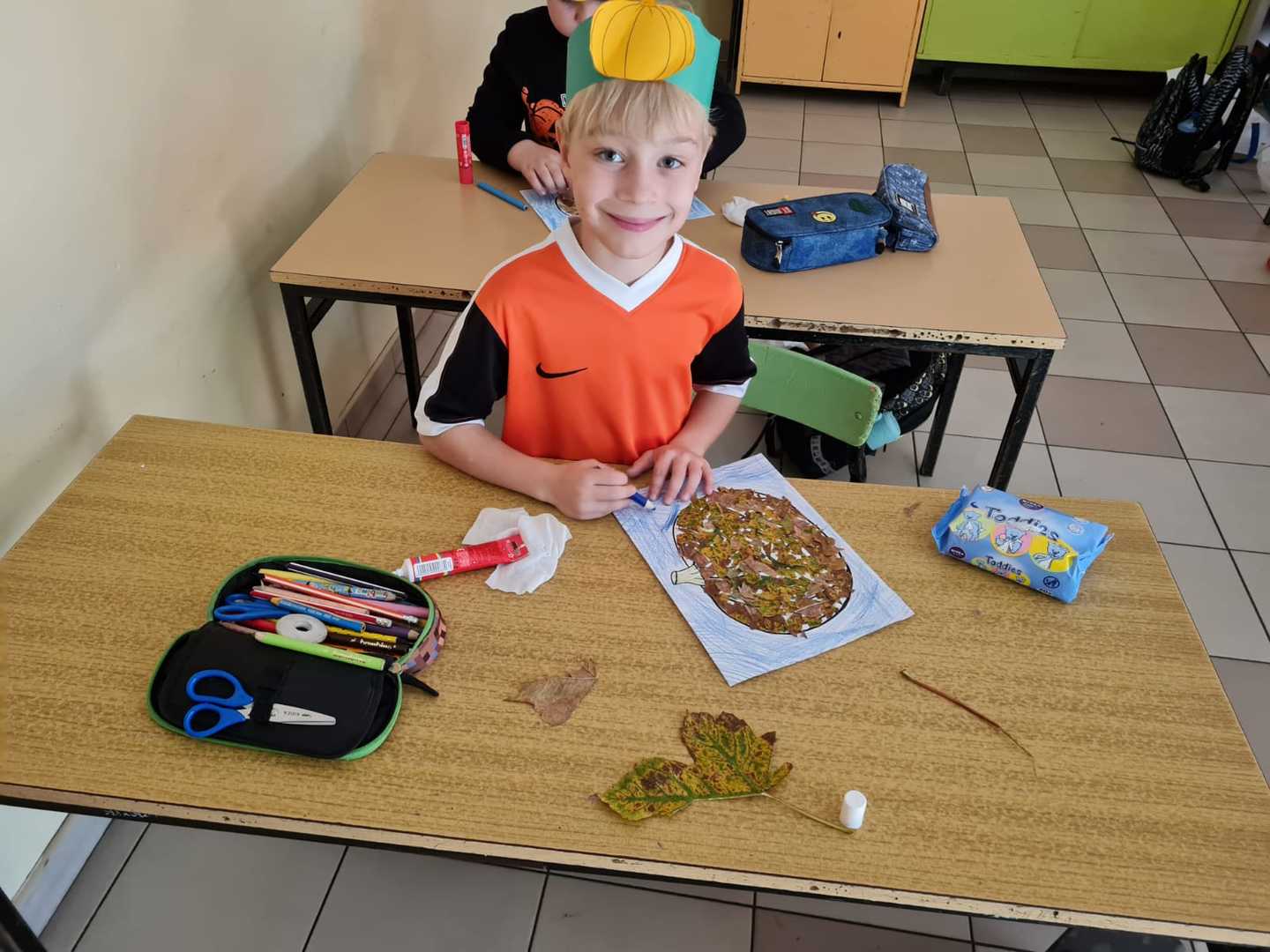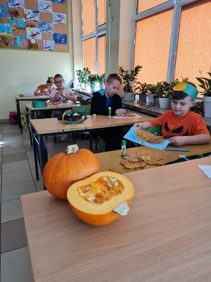 z klas wykonała dyniowe prace plastyczne. Dzieci chętnie korzystały z dyniowej fotobudki
