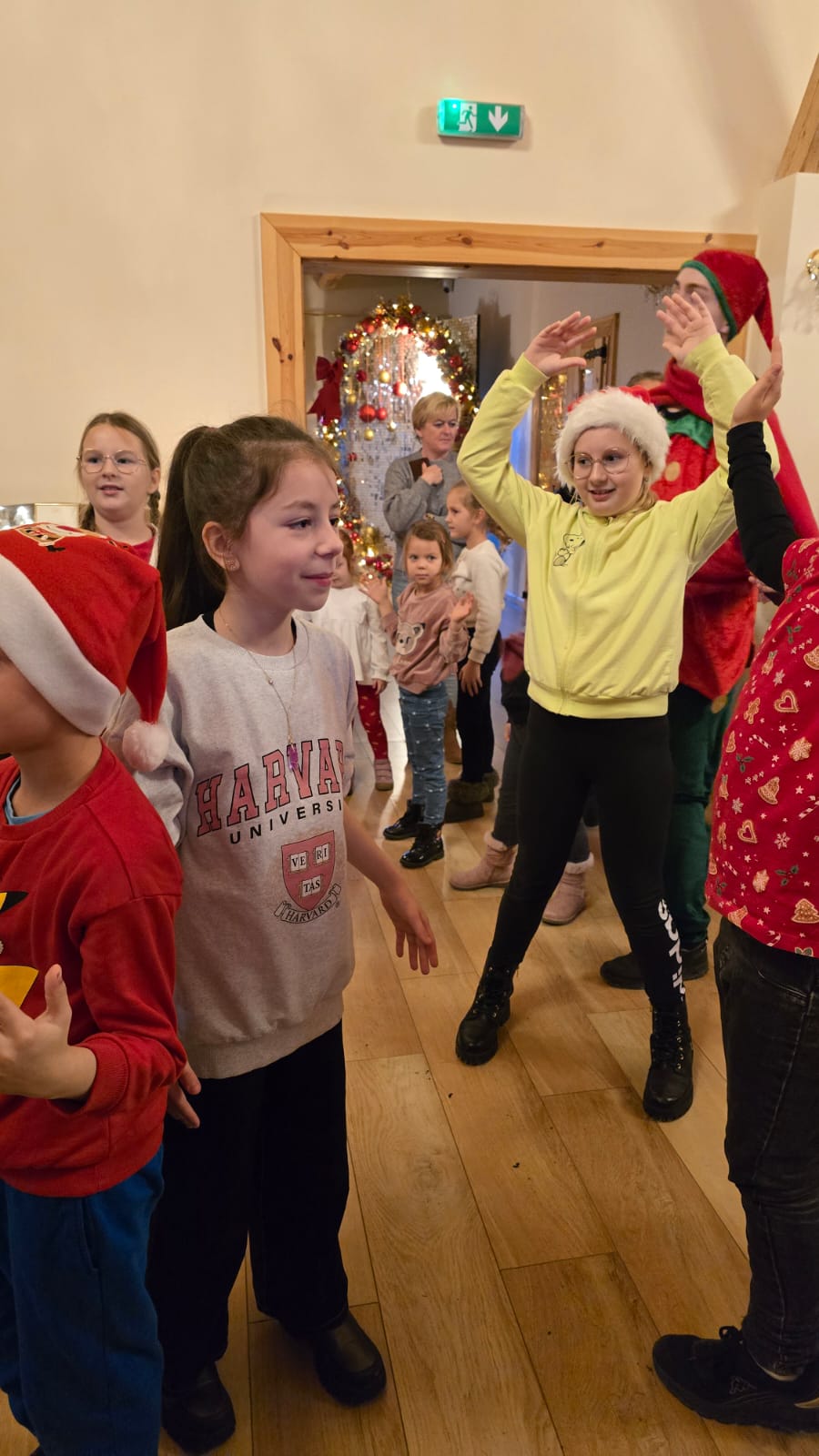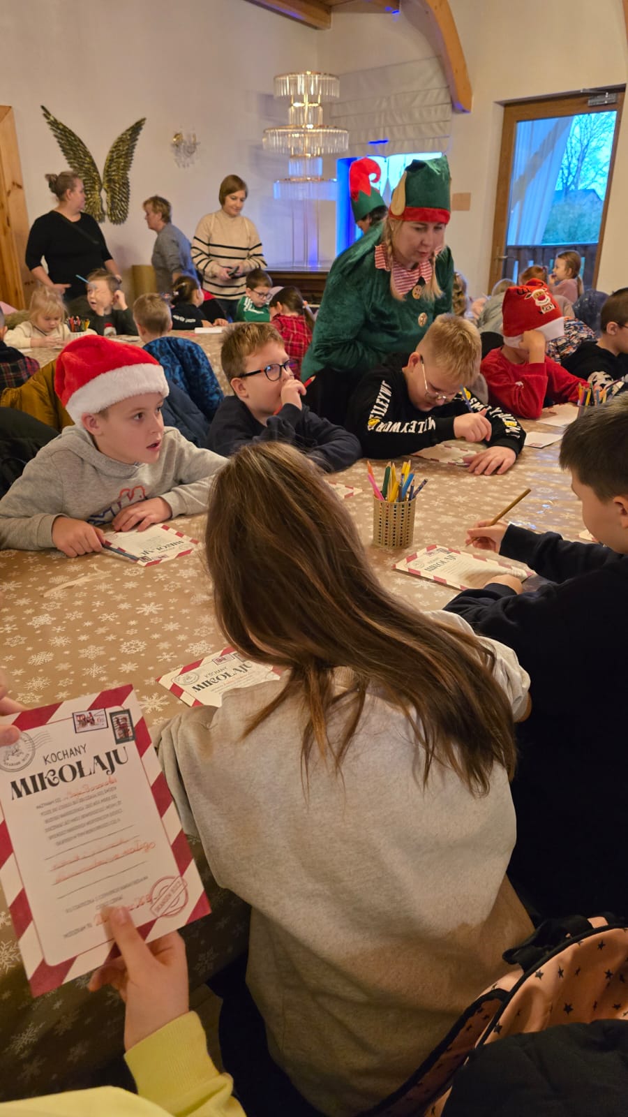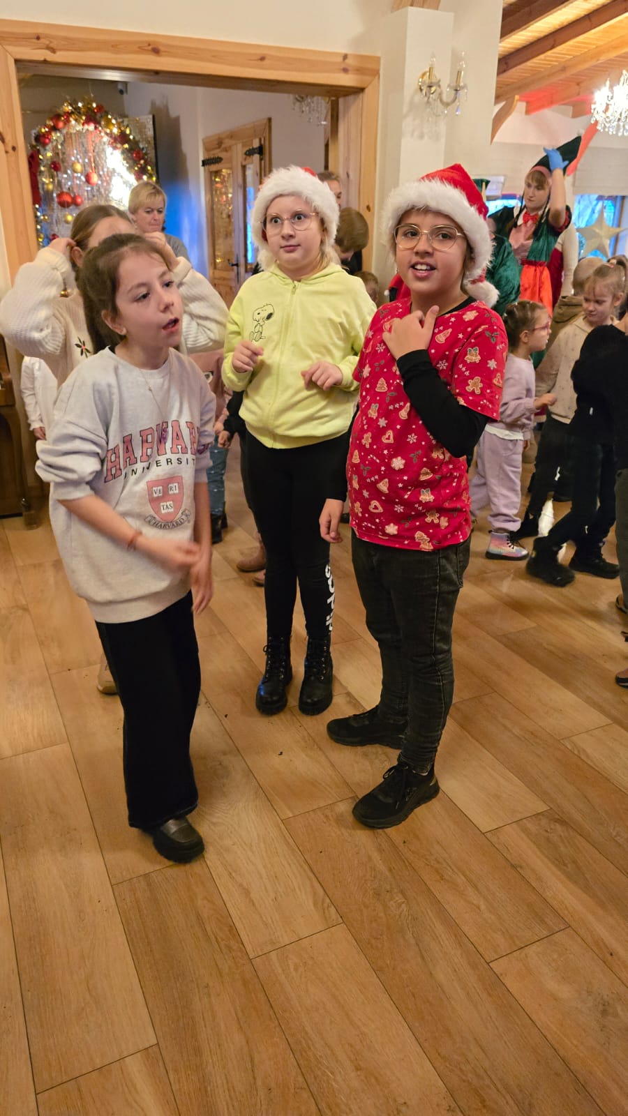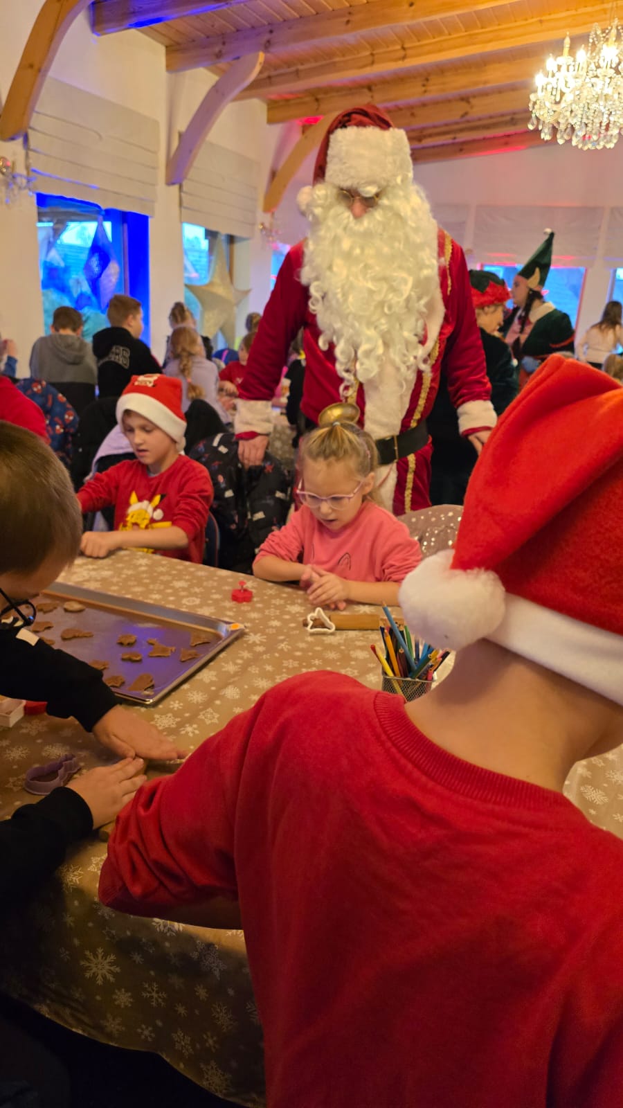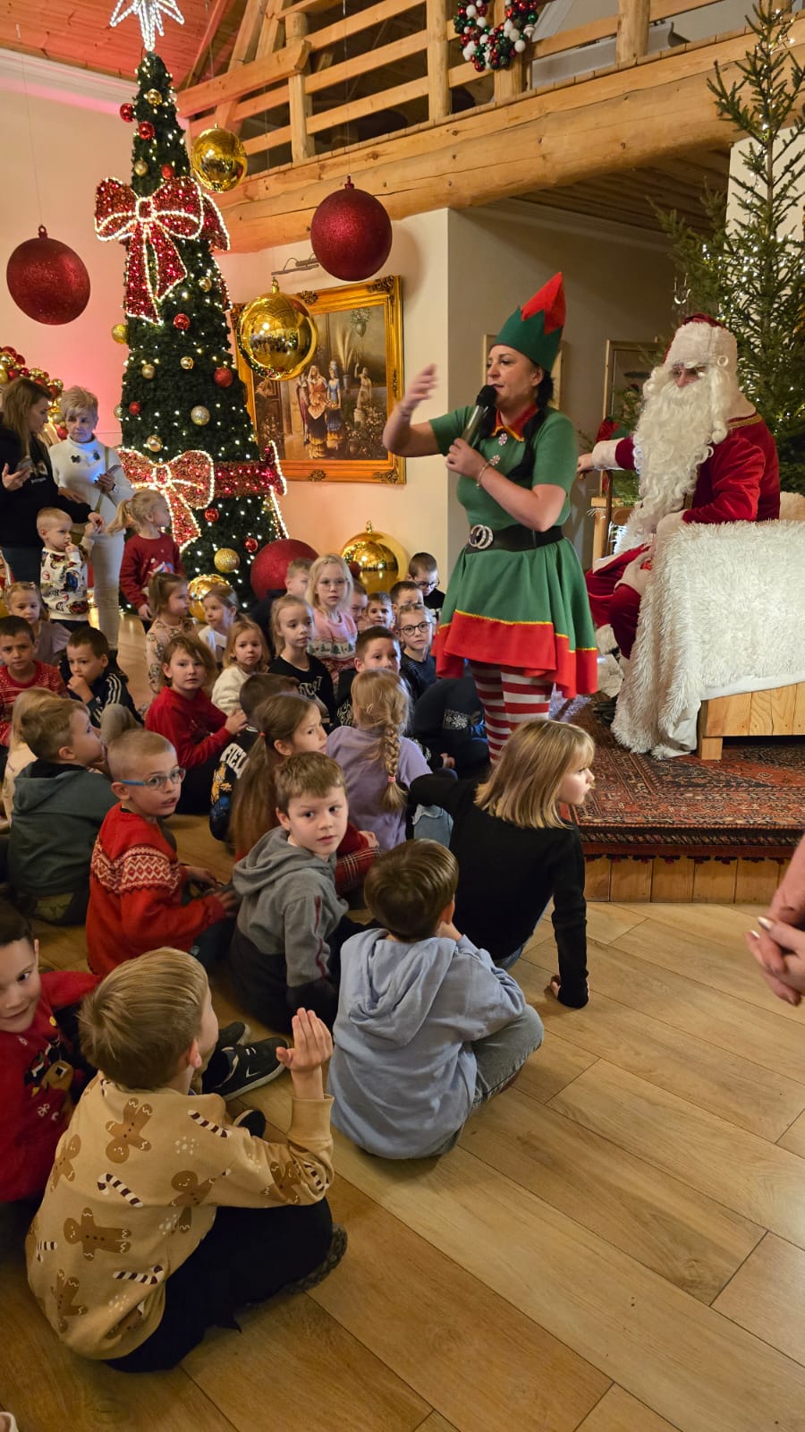 Przywitała nas Pani Mikołajowa oraz Elfy, które od tej pory towarzyszyły nam w wędrówce po magicznej krainie. Złożyliśmy wizytę w pracowni Elfów, po czym udaliśmy się do domu Mikołaja, aby zobaczyć, jak on mieszka i co porabia w wolnym czasie. Następnie udaliśmy się do Sali Diamentowej, gdzie Elfy pomogły nam napisać list do Mikołaja. Wrzuciliśmy je do skrzynki pocztowej na Poczcie Mikołaja. Mogliśmy również wykazać się talentem kulinarnym piekąc pierniczki. Oczywiście, z wielką ochotą zjedliśmy je później popijając cynamonową herbatką. Szczególną atrakcją w tym budynku było spotkanie z Mikołajem, który z nami rozmawiał, bawił się, tańczył, śpiewał kolędy i pozował do pamiątkowych zdjęć. Na zakończenie, odwiedziliśmy świąteczny sklepik, gdzie można było kupić pamiątki i gwiazdkowe prezenty dla najbliższych. w drodze powrotnej do autokaru czekała nas kolejna niespodzianka – mini ZOO...