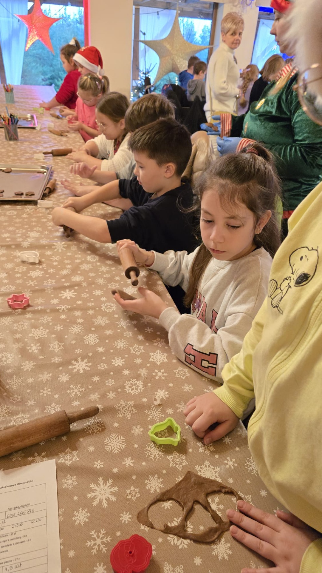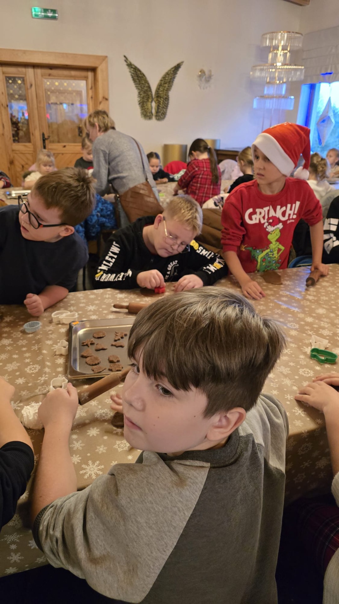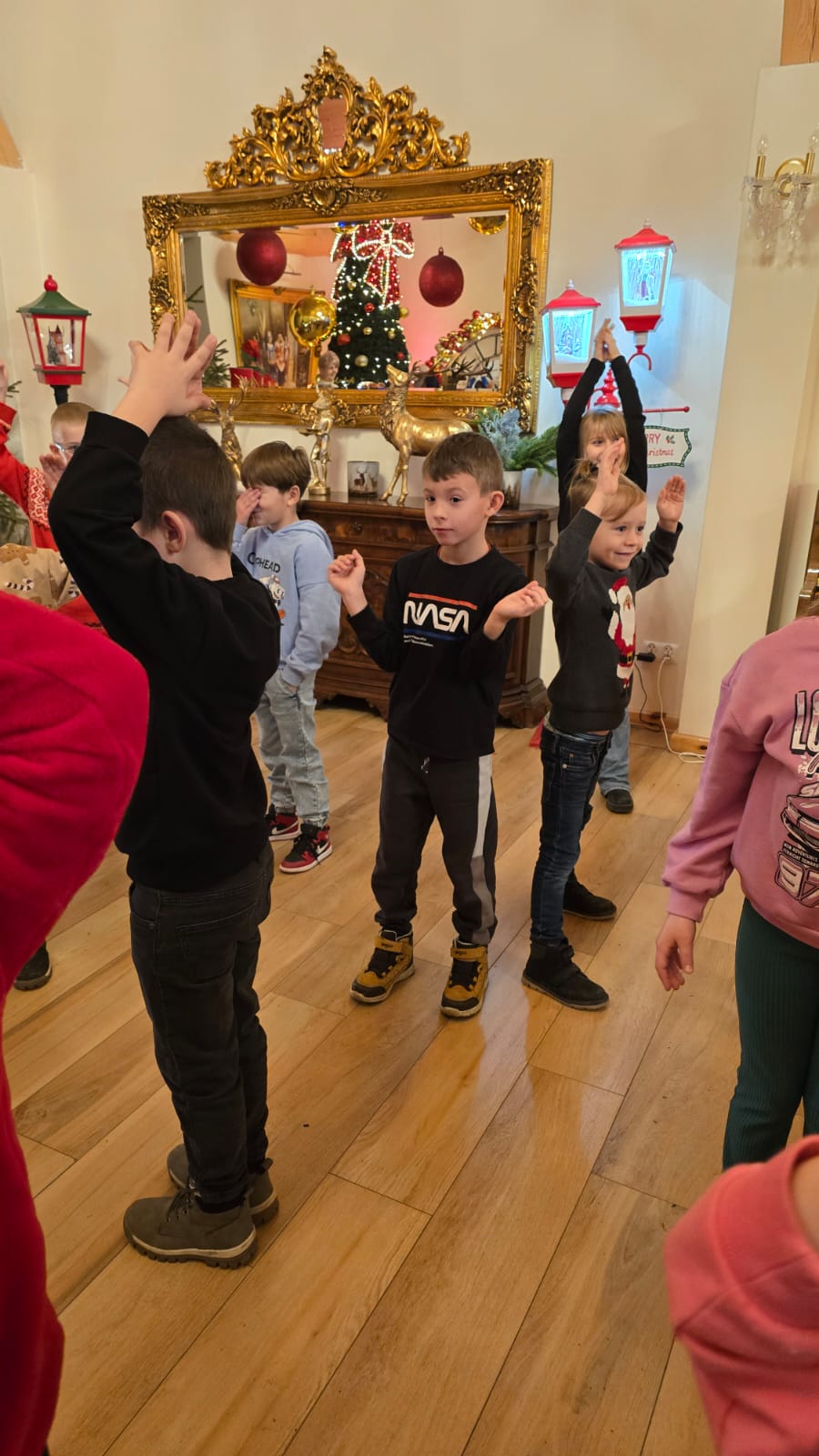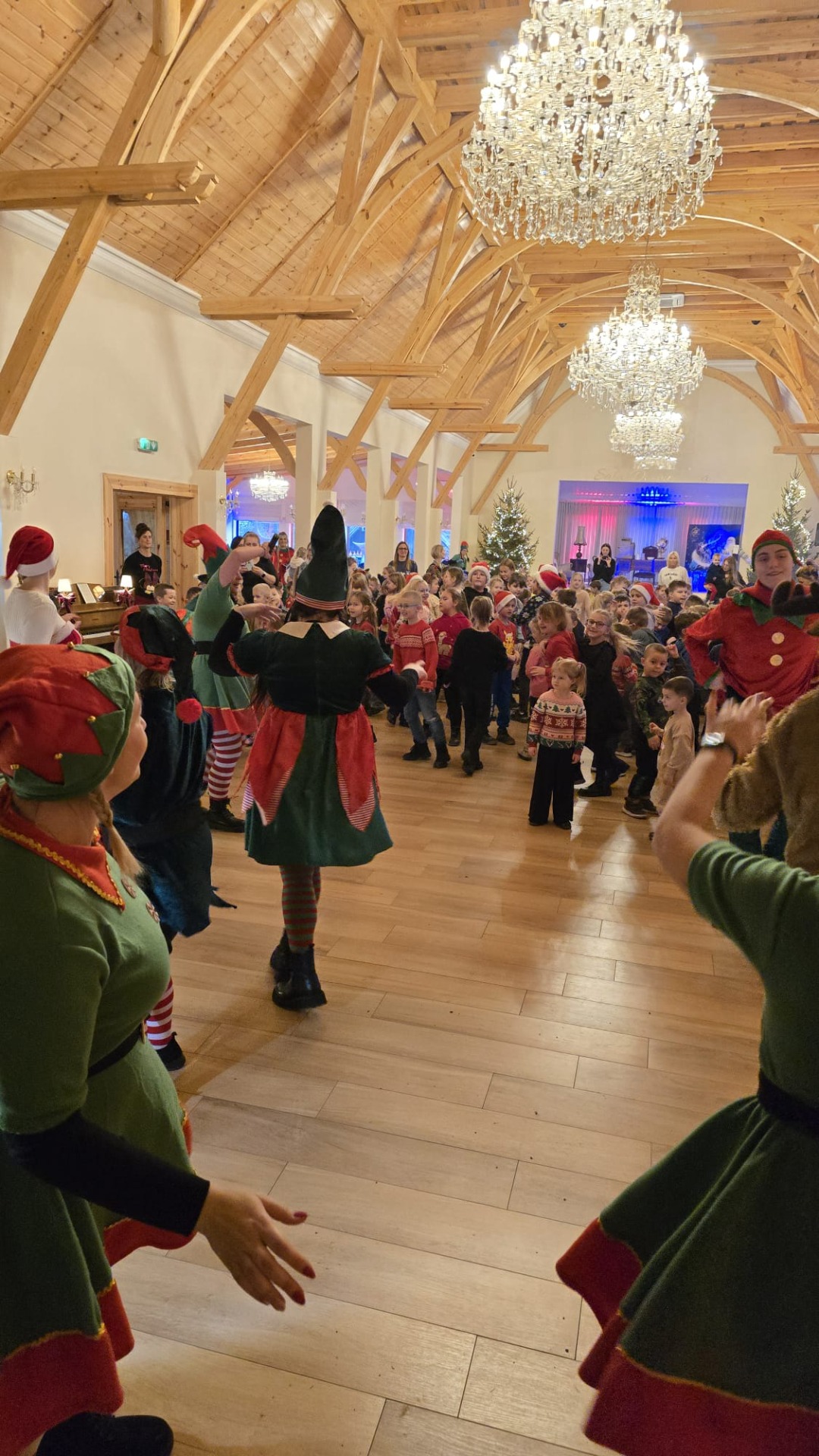 Przywitała nas Pani Mikołajowa oraz Elfy, które od tej pory towarzyszyły nam w wędrówce po magicznej krainie. Złożyliśmy wizytę w pracowni Elfów, po czym udaliśmy się do domu Mikołaja, aby zobaczyć, jak on mieszka i co porabia w wolnym czasie. Następnie udaliśmy się do Sali Diamentowej, gdzie Elfy pomogły nam napisać list do Mikołaja. Wrzuciliśmy je do skrzynki pocztowej na Poczcie Mikołaja. Mogliśmy również wykazać się talentem kulinarnym piekąc pierniczki. Oczywiście, z wielką ochotą zjedliśmy je później popijając cynamonową herbatką. Szczególną atrakcją w tym budynku było spotkanie z Mikołajem, który z nami rozmawiał, bawił się, tańczył, śpiewał kolędy i pozował do pamiątkowych zdjęć. Na zakończenie, odwiedziliśmy świąteczny sklepik, gdzie można było kupić pamiątki i gwiazdkowe prezenty dla najbliższych. w drodze powrotnej do autokaru czekała nas kolejna niespodzianka – mini ZOO...