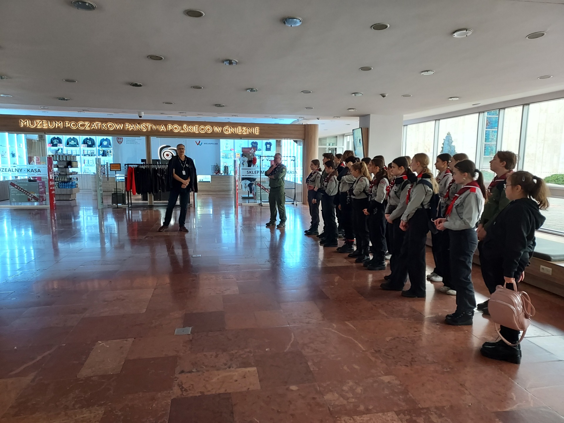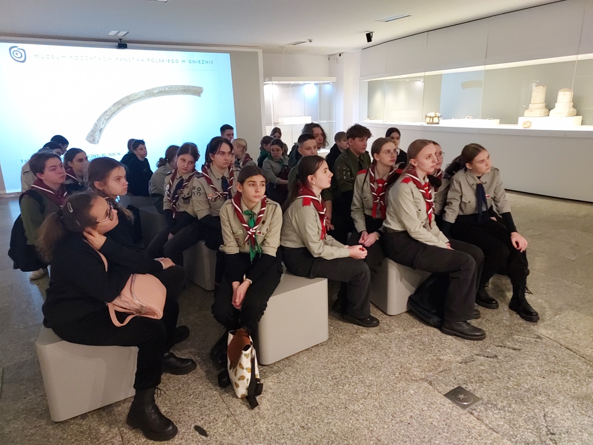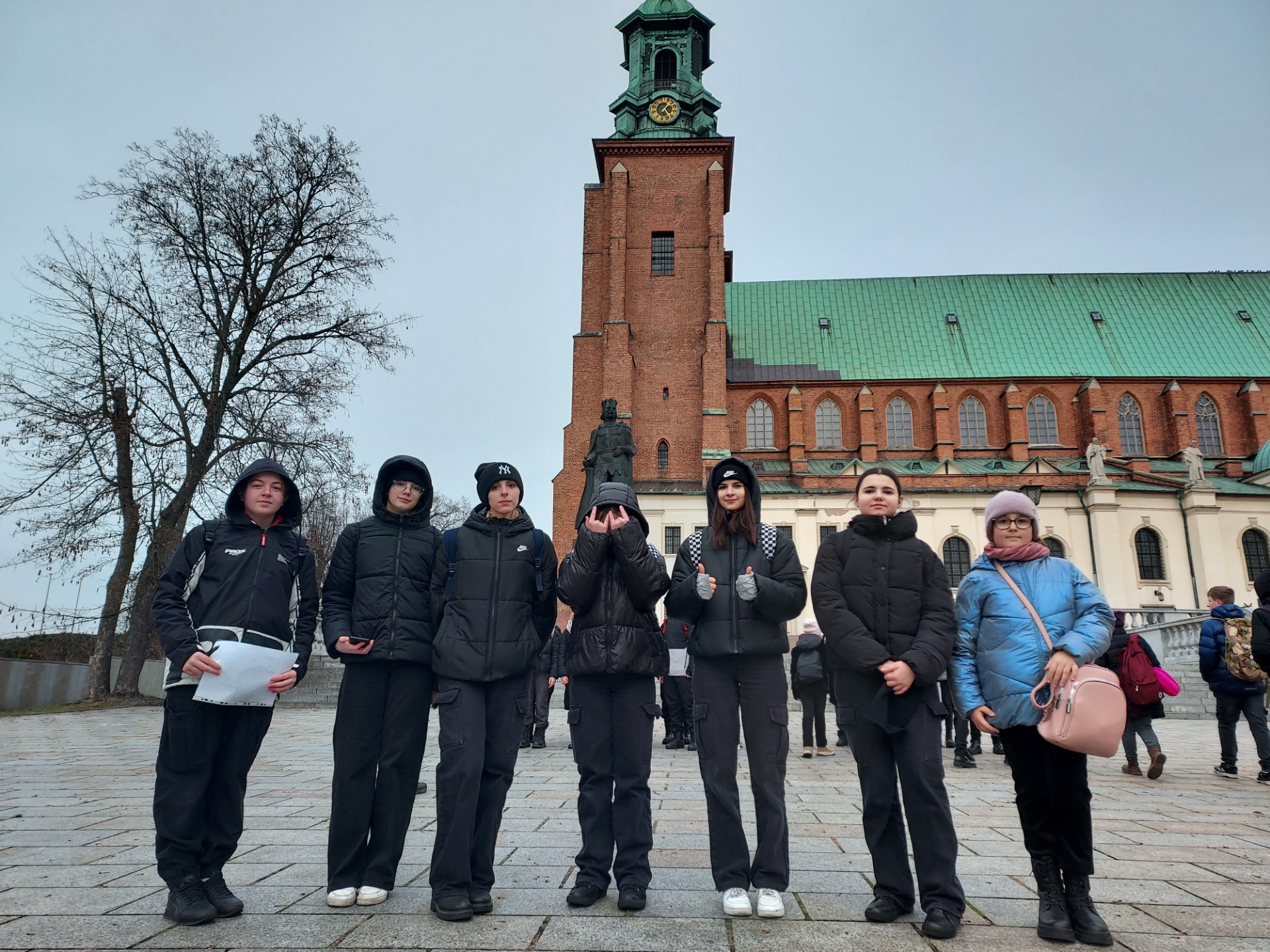W sobotę 21 grudnia 7 harcerzy z 4 DH „Dzierzby” pod opieką drużynowej wraz z innymi drużynami Hufca ZHP Powiatu Kaliskiego wzięło udział w wycieczce do Gniezna po Betlejemskie Światło Pokoju. Podczas wycieczki harcerze poznali najciekawsze atrakcje turystyczne Gniezna. Zwiedziliśmy Katedrę Gnieźnieńską na Wzgórzu Lecha ze słynnymi Drzwiami Gnieźnieńskimi. Byliśmy również w podziemiach Katedry. Następnie udaliśmy się do Muzeum Początków Państwa Polskiego, gdzie przewodnik w bardzo ciekawy sposób przeprowadził nas przez wystawy stałe i czasowe ekspozycje. Resztę wycieczki spędziliśmy w plenerze, wędrując po mieście i zdobywając punkty z aplikacją „Królika Goń”. Zrobiliśmy sobie przerwę na ciepły posiłek w jednej z pizzerii przy Rynku, a po posiłku wraz z innymi drużynami śpiewaliśmy piosenki i pląsy w sercu Gniezna. O 15.45 wszystkie drużyny spotkały się na Rynku i wspólnie oczekiwaliśmy na przekazanie BŚP przez harcerzy z Hufca Gniezno. Komendant zarządził zbiórkę i punktualnie o 16.00 dwie harcerki zjawiły się na Rynku niosąc płomień z Betlejem. Przyjęliśmy go z radością i ruszyliśmy w drogę powrotną, aby kontynuować sztafetę Światła w naszych środowiskach…