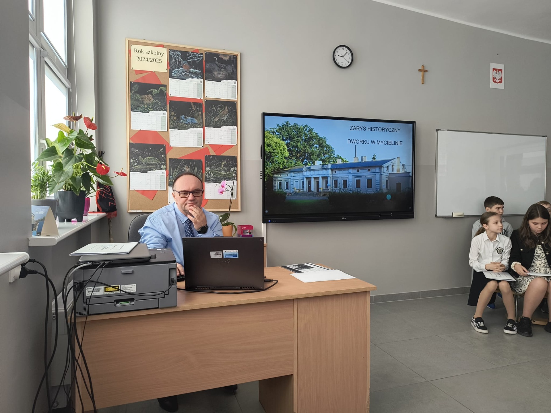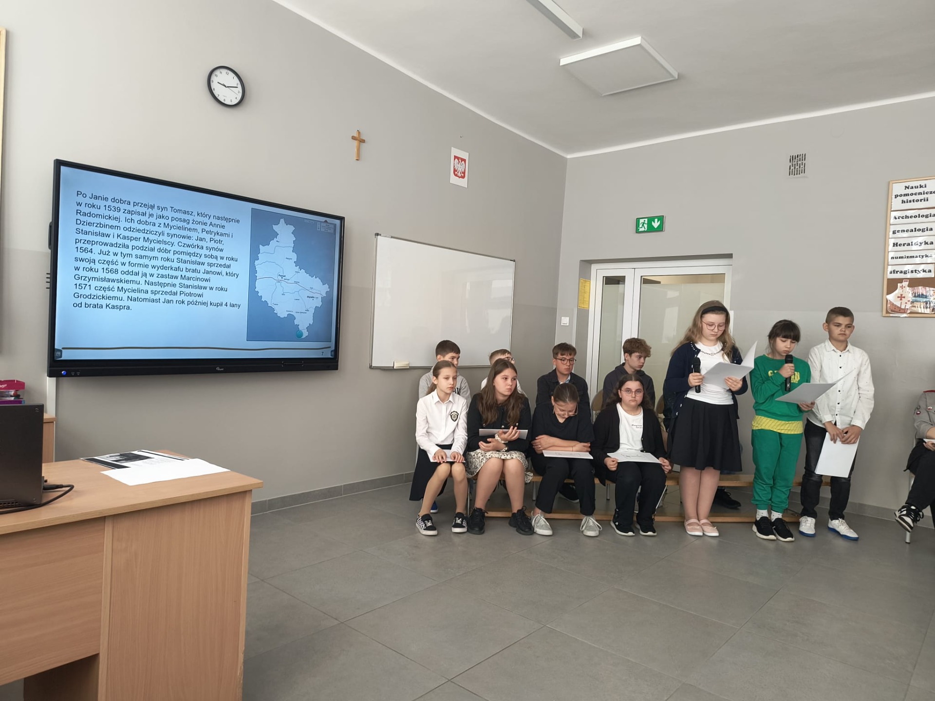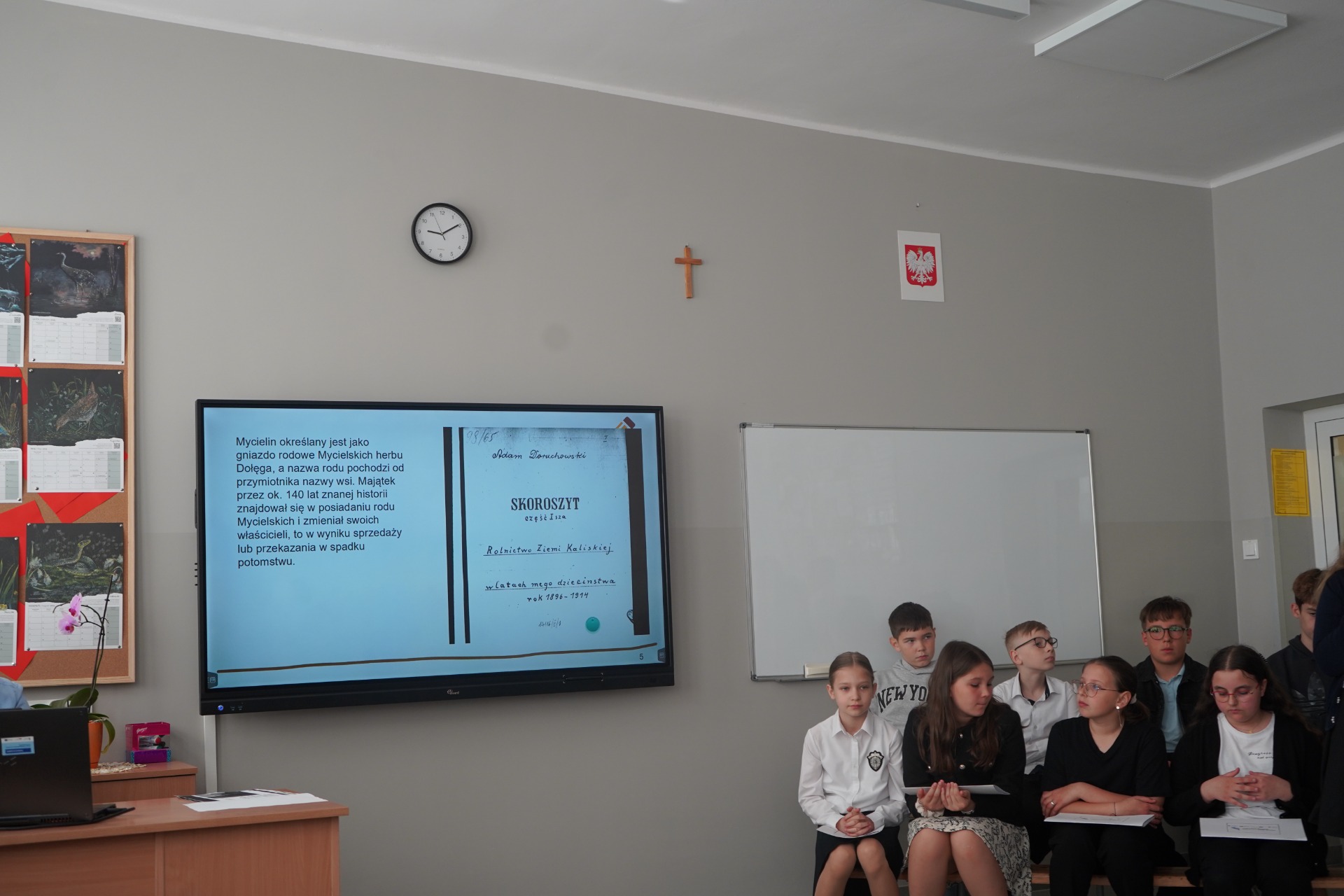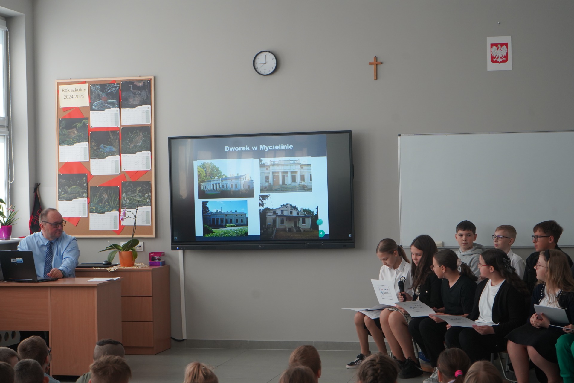 Podsumowanie projektu składało się z trzech części. W pierwszej zaprezentował się zespół p. Mirosława Dymkowskiego. Uczniowie przedstawili dwie prezentacje multimedialne. Pierwsza poświęcona była zespołowi uczniowskiemu i realizowanym przez niego działaniom. Zawierała ciekawą dokumentację fotograficzną przebiegu zajęć, wywiadów, wycieczki oraz obecnego funkcjonowania opisywanego obiektu. W drugiej prezentacji uczniowie przedstawili bogatą historię Dworku w Mycielinie.