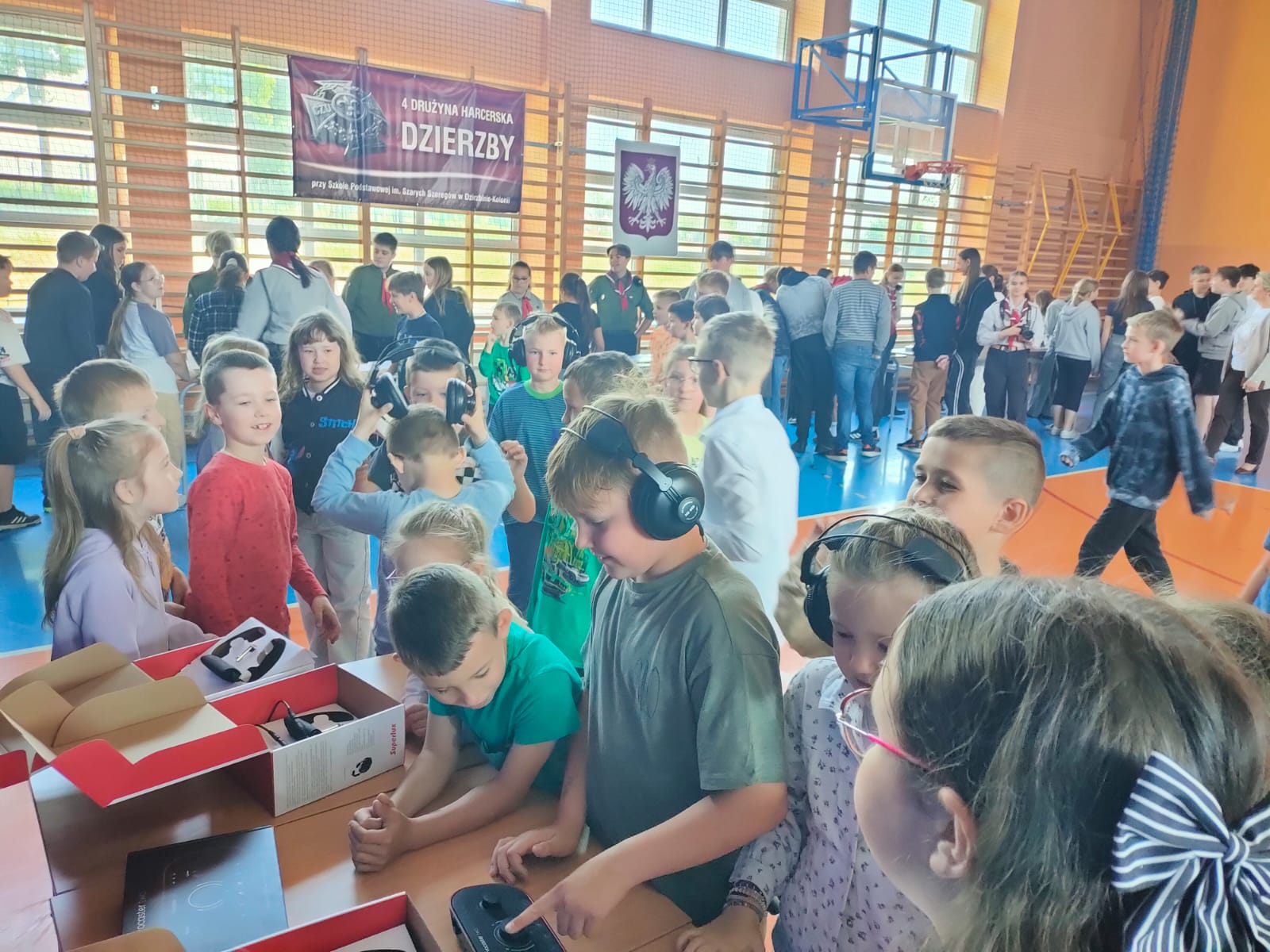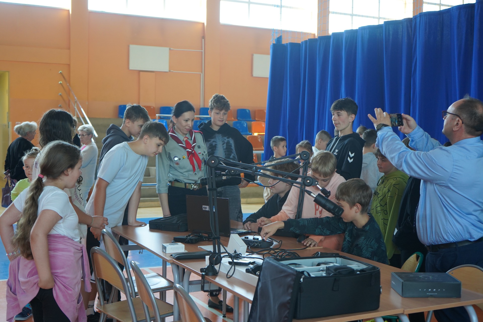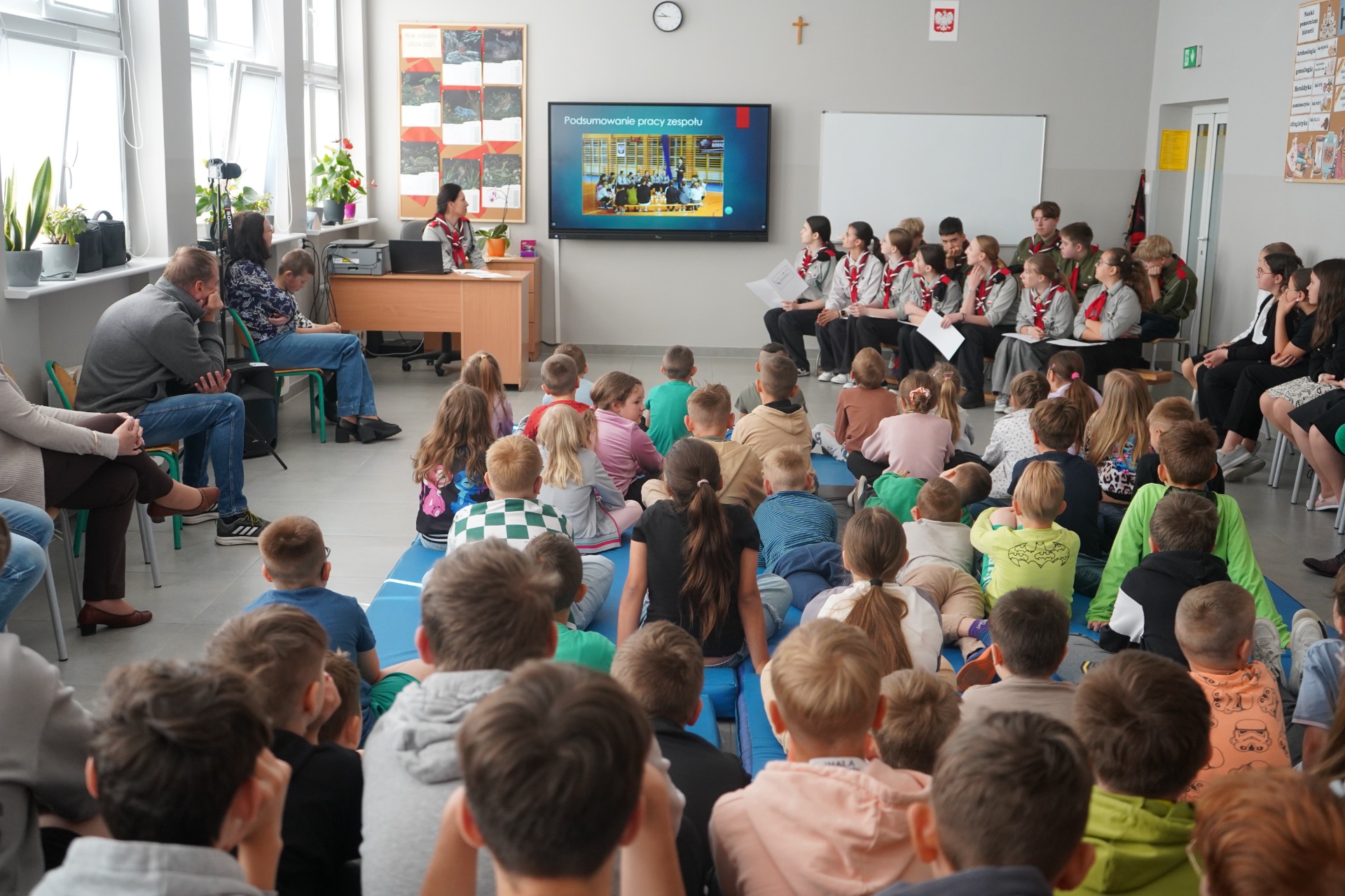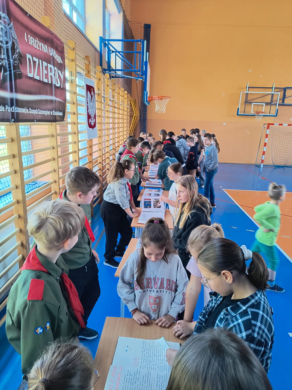 Ostatnia część podsumowania odbyła się na sali gimnastycznej, gdzie wystawiony został sprzęt pozyskany dzięki udziałowi w projekcie oraz kroniki 4 DH „Dzierzby”. Wszyscy uczniowie i nauczyciele z zainteresowaniem oglądali i testowali urządzenia, o które wzbogaciła się baza materialna szkoły. Duży entuzjazm wzbudziły również kroniki, w których uwieczniono różnorodne działania podejmowane przez szkolną drużynę harcerską.