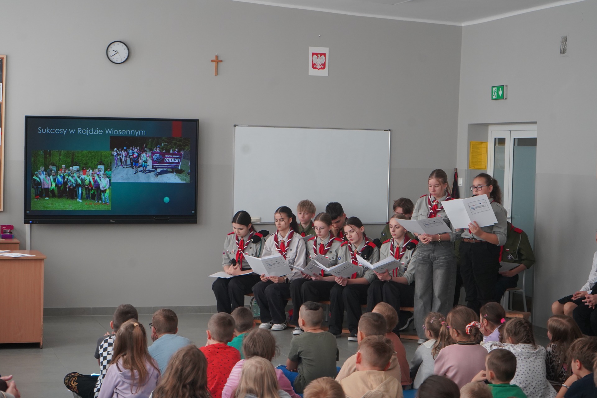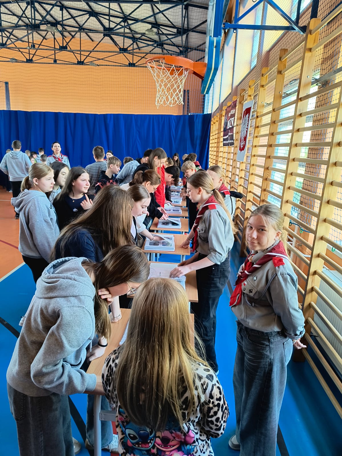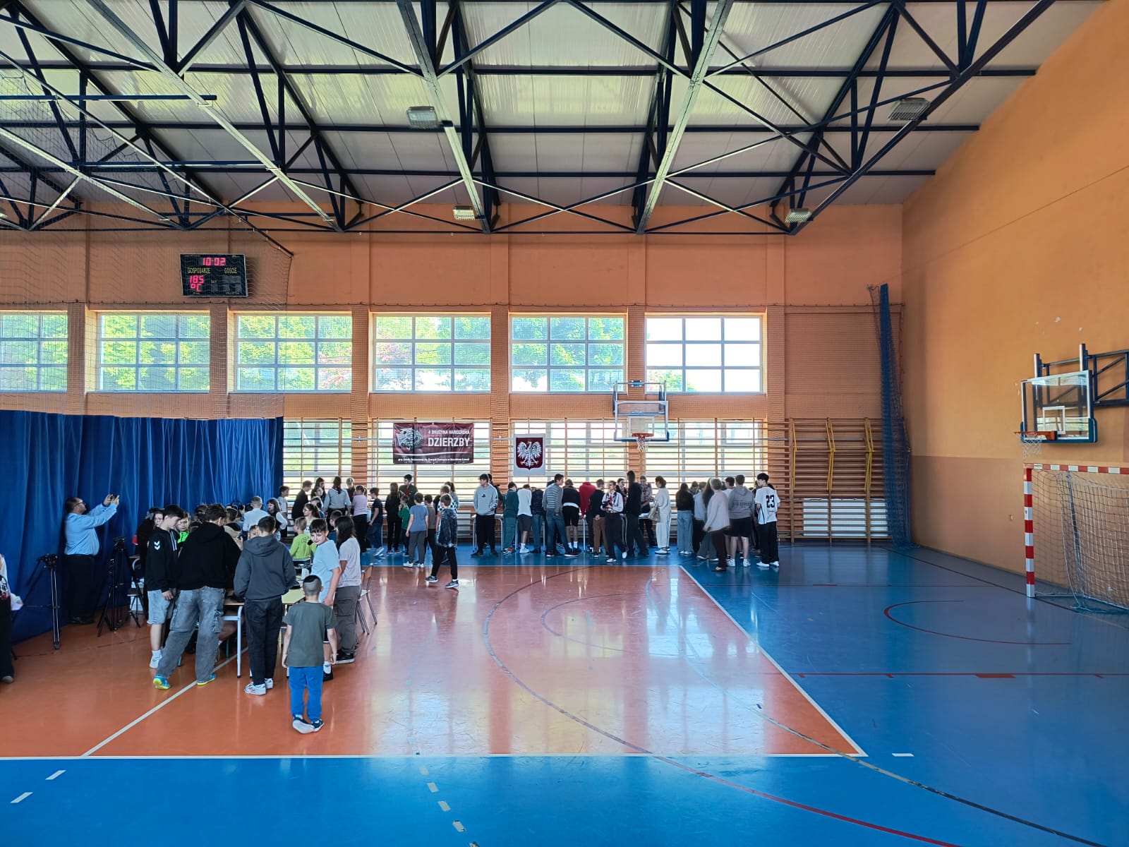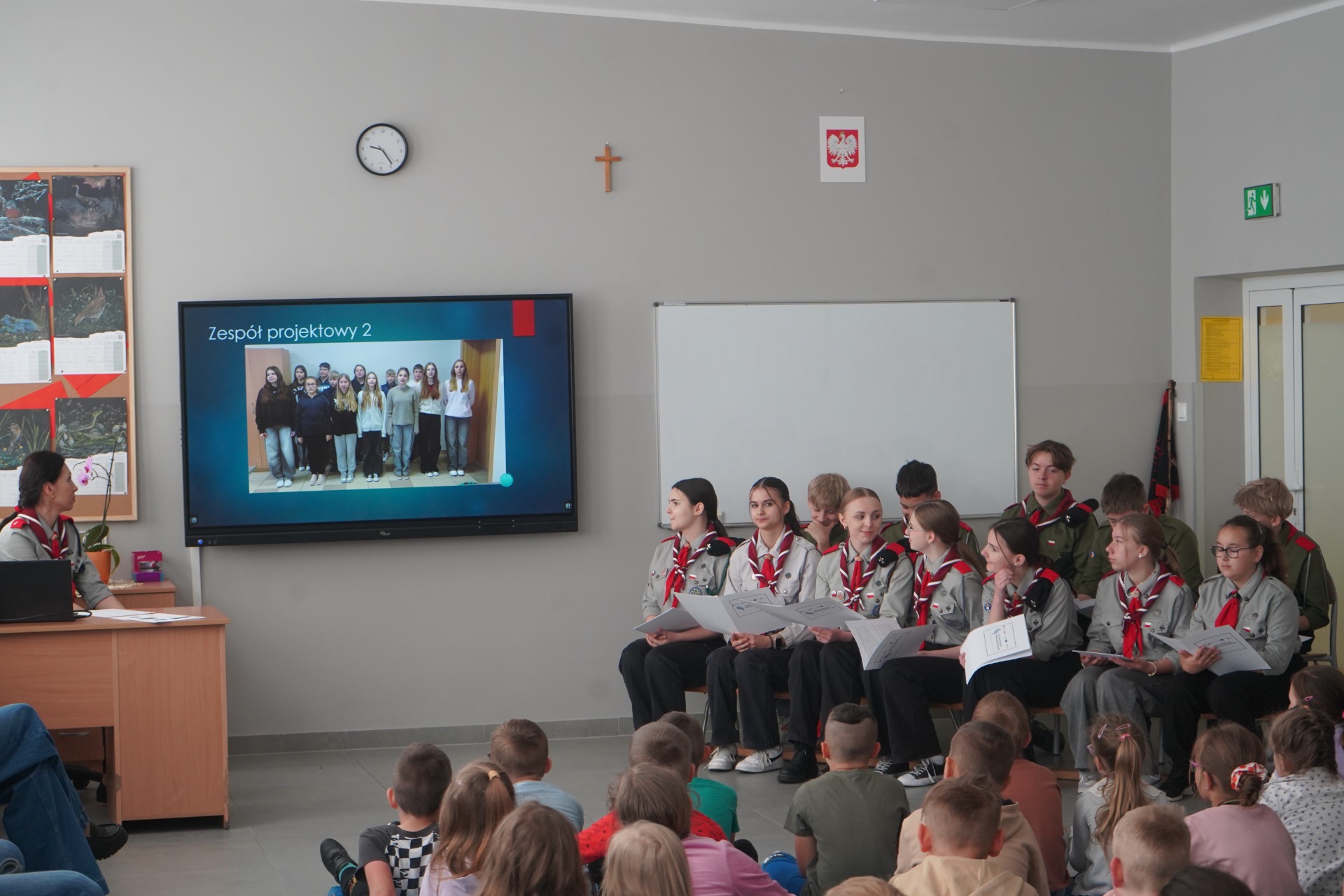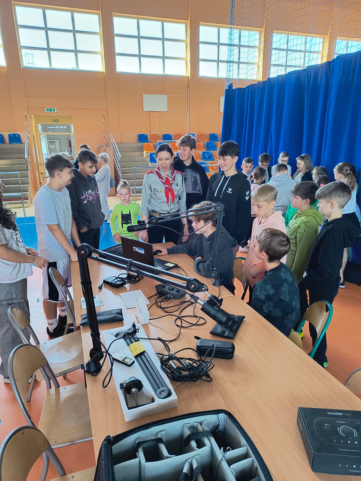 Ostatnia część podsumowania odbyła się na sali gimnastycznej, gdzie wystawiony został sprzęt pozyskany dzięki udziałowi w projekcie oraz kroniki 4 DH „Dzierzby”. Wszyscy uczniowie i nauczyciele z zainteresowaniem oglądali i testowali urządzenia, o które wzbogaciła się baza materialna szkoły. Duży entuzjazm wzbudziły również kroniki, w których uwieczniono różnorodne działania podejmowane przez szkolną drużynę harcerską.