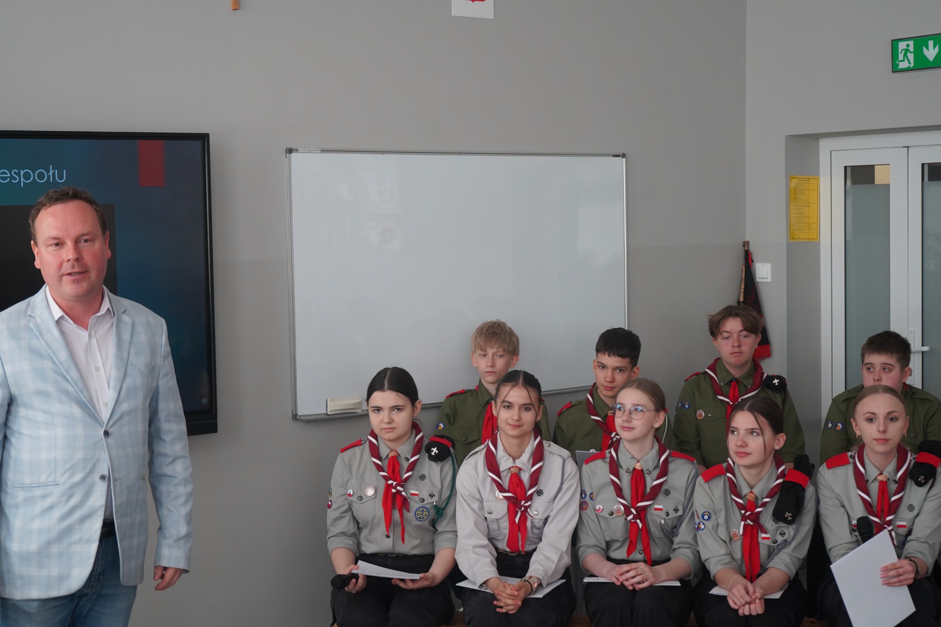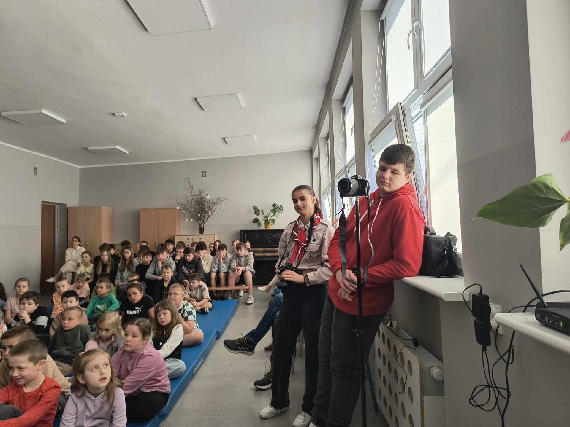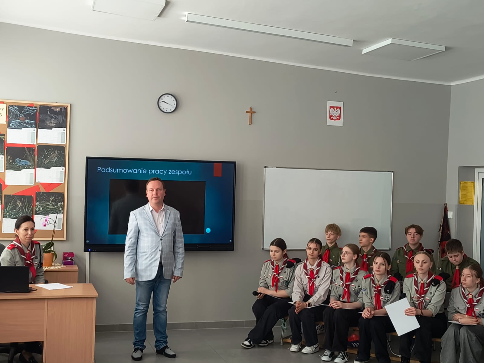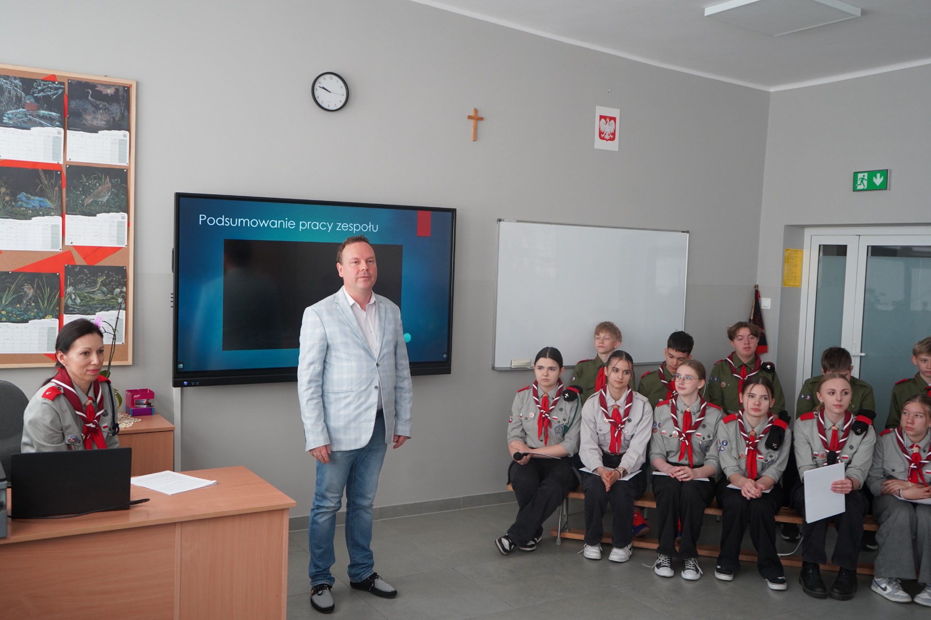 Ostatnia część podsumowania odbyła się na sali gimnastycznej, gdzie wystawiony został sprzęt pozyskany dzięki udziałowi w projekcie oraz kroniki 4 DH „Dzierzby”. Wszyscy uczniowie i nauczyciele z zainteresowaniem oglądali i testowali urządzenia, o które wzbogaciła się baza materialna szkoły. Duży entuzjazm wzbudziły również kroniki, w których uwieczniono różnorodne działania podejmowane przez szkolną drużynę harcerską.