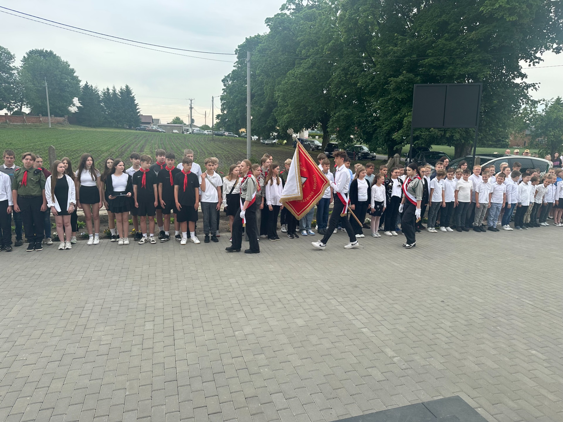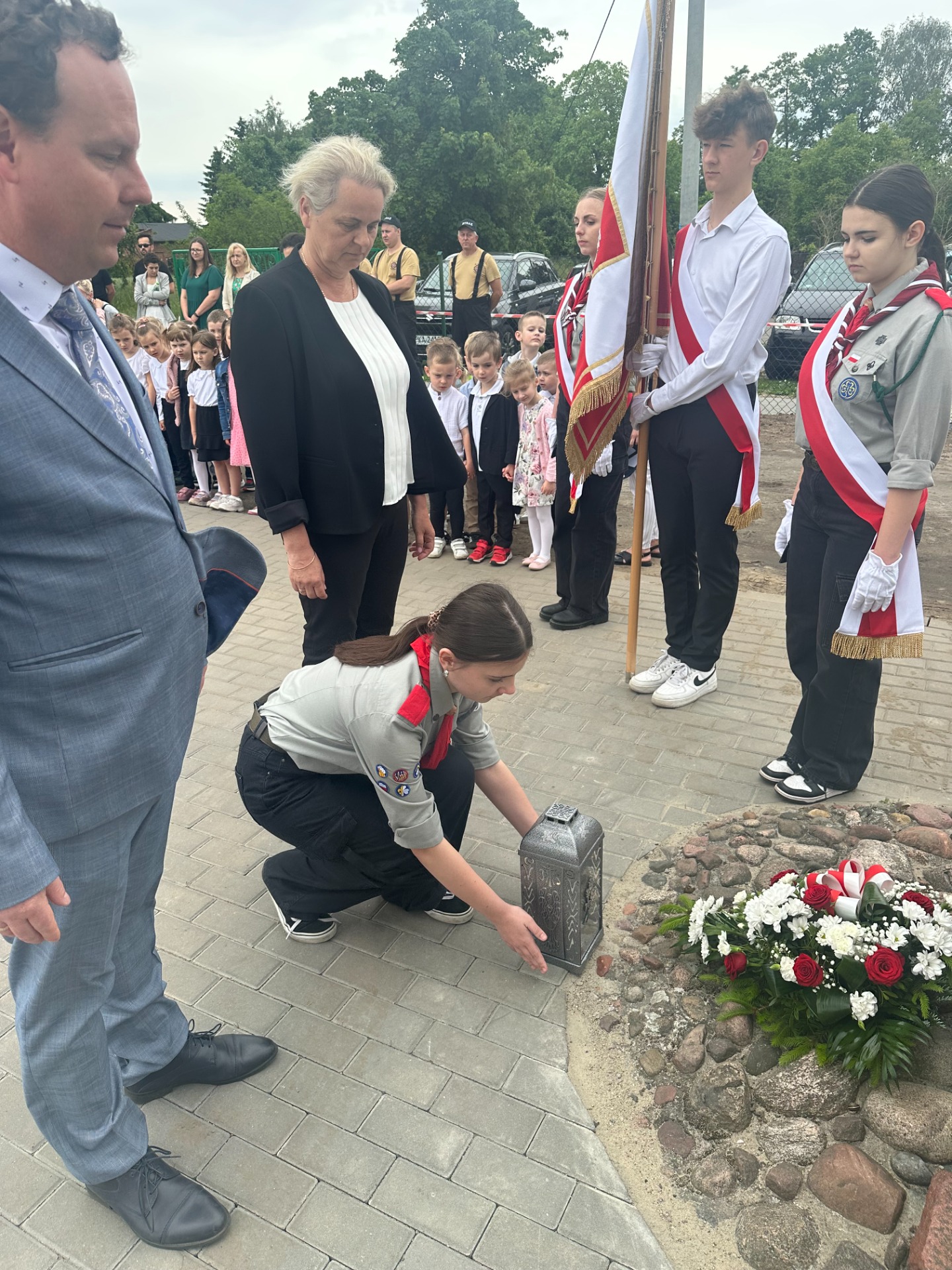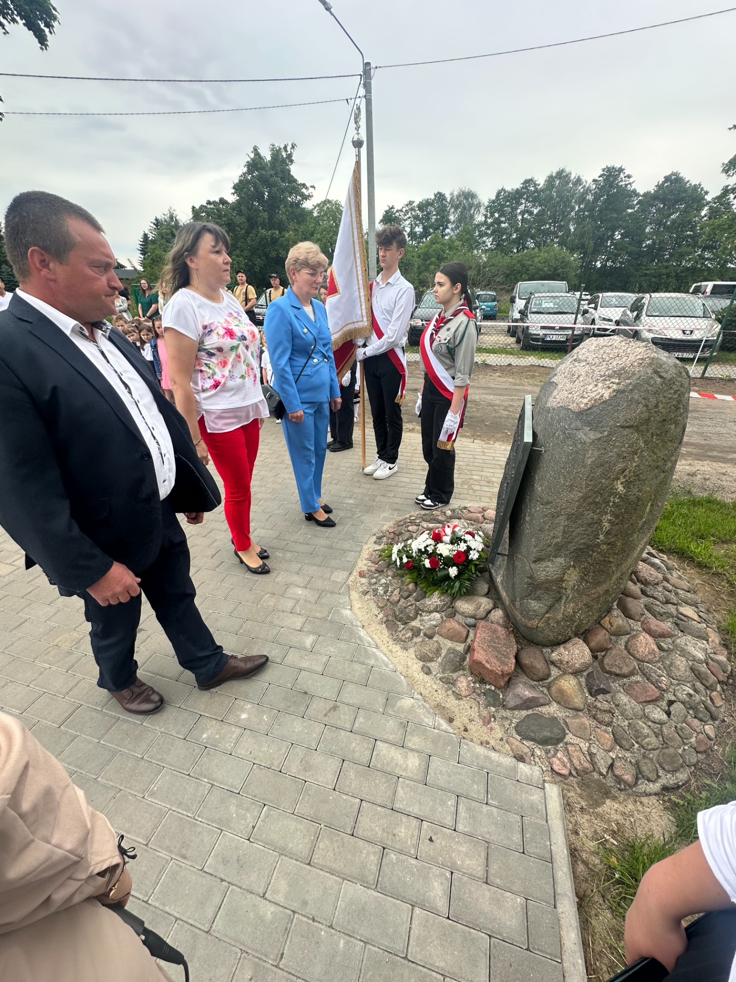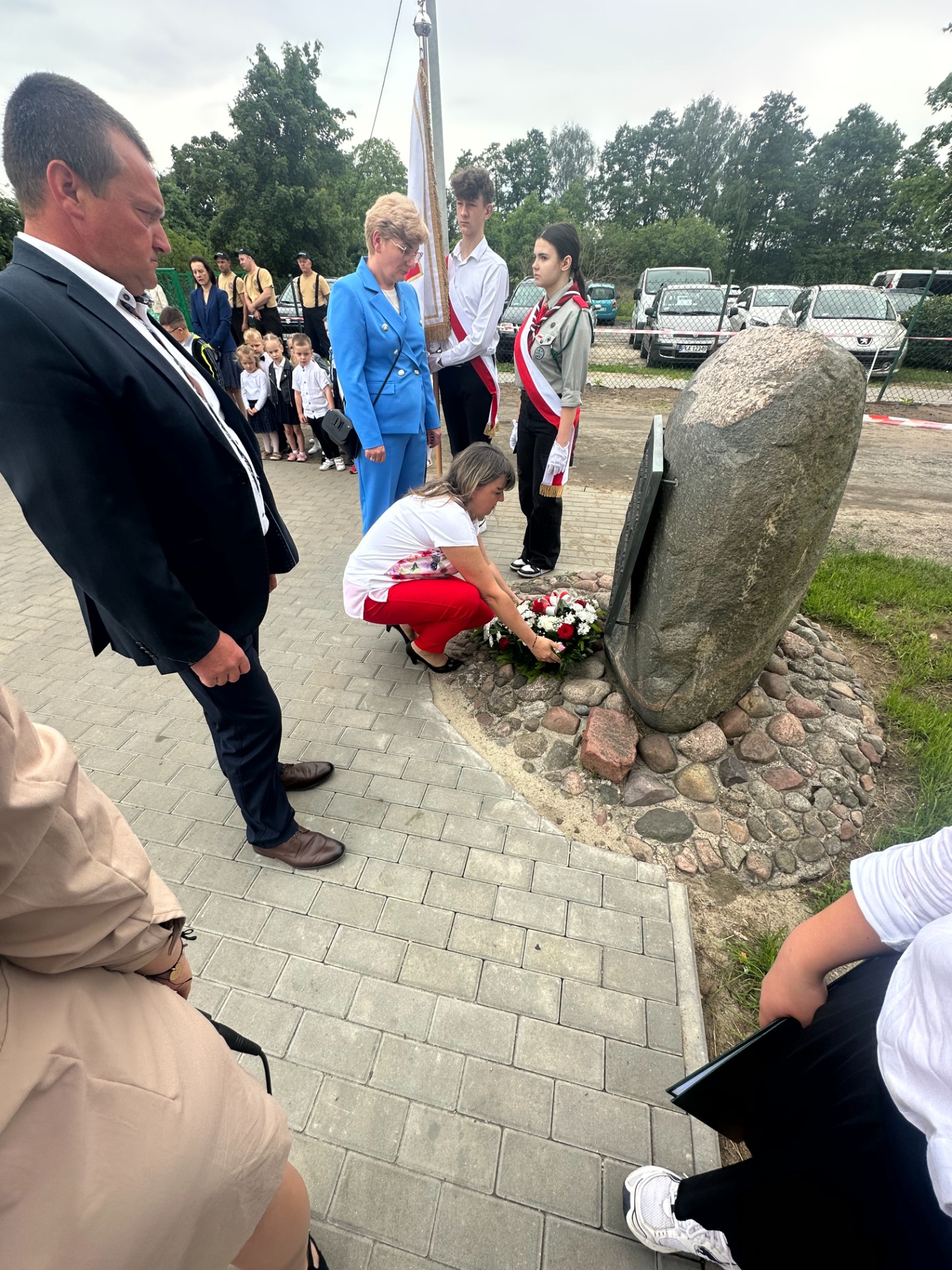 Obchody 30-lecia nadania szkole imienia rozpoczęliśmy przed budynkiem od odśpiewania hymnu narodowego. Następnie delegacje Urzędu Gminy Mycielin oraz ZSP w Dzierzbinie-Kolonii złożyły kwiaty oraz znicz przy kamieniu upamiętniającym wydarzenia, które miały miejsce trzydzieści lat wcześniej.