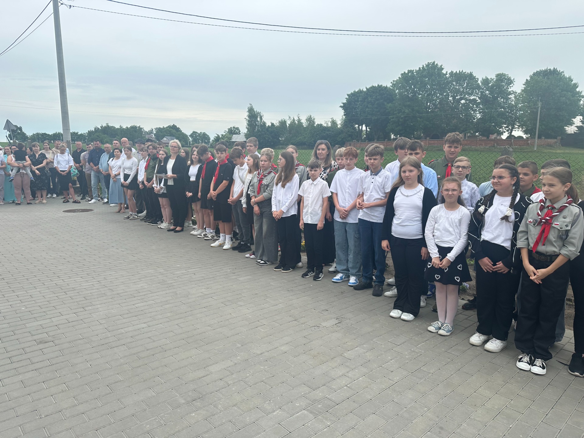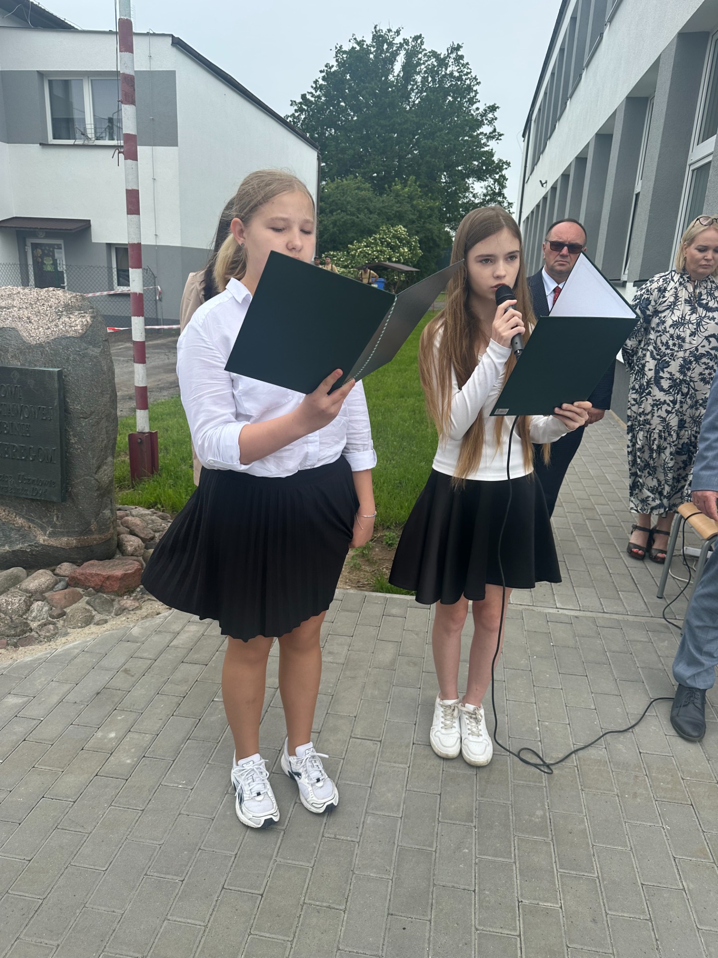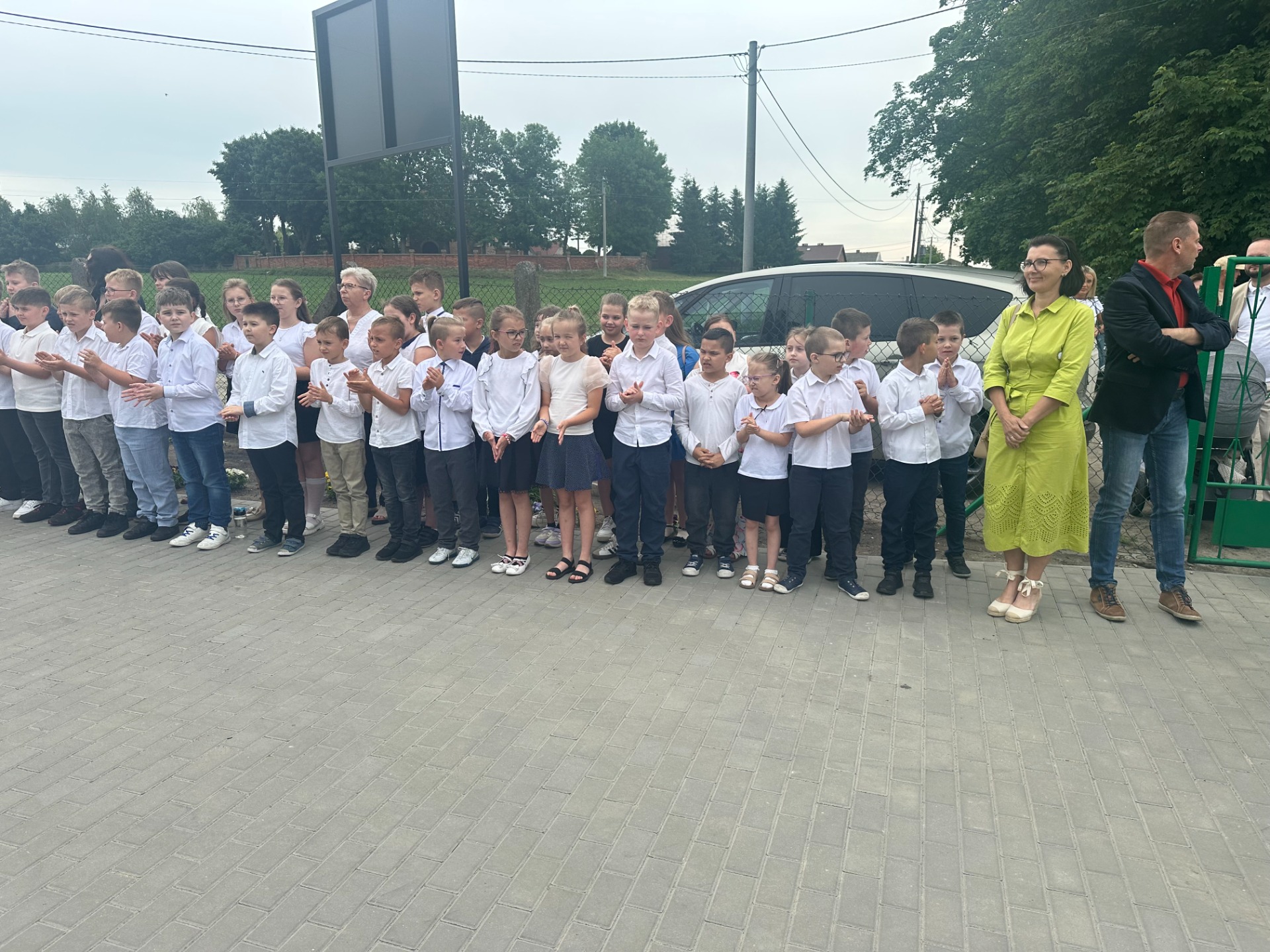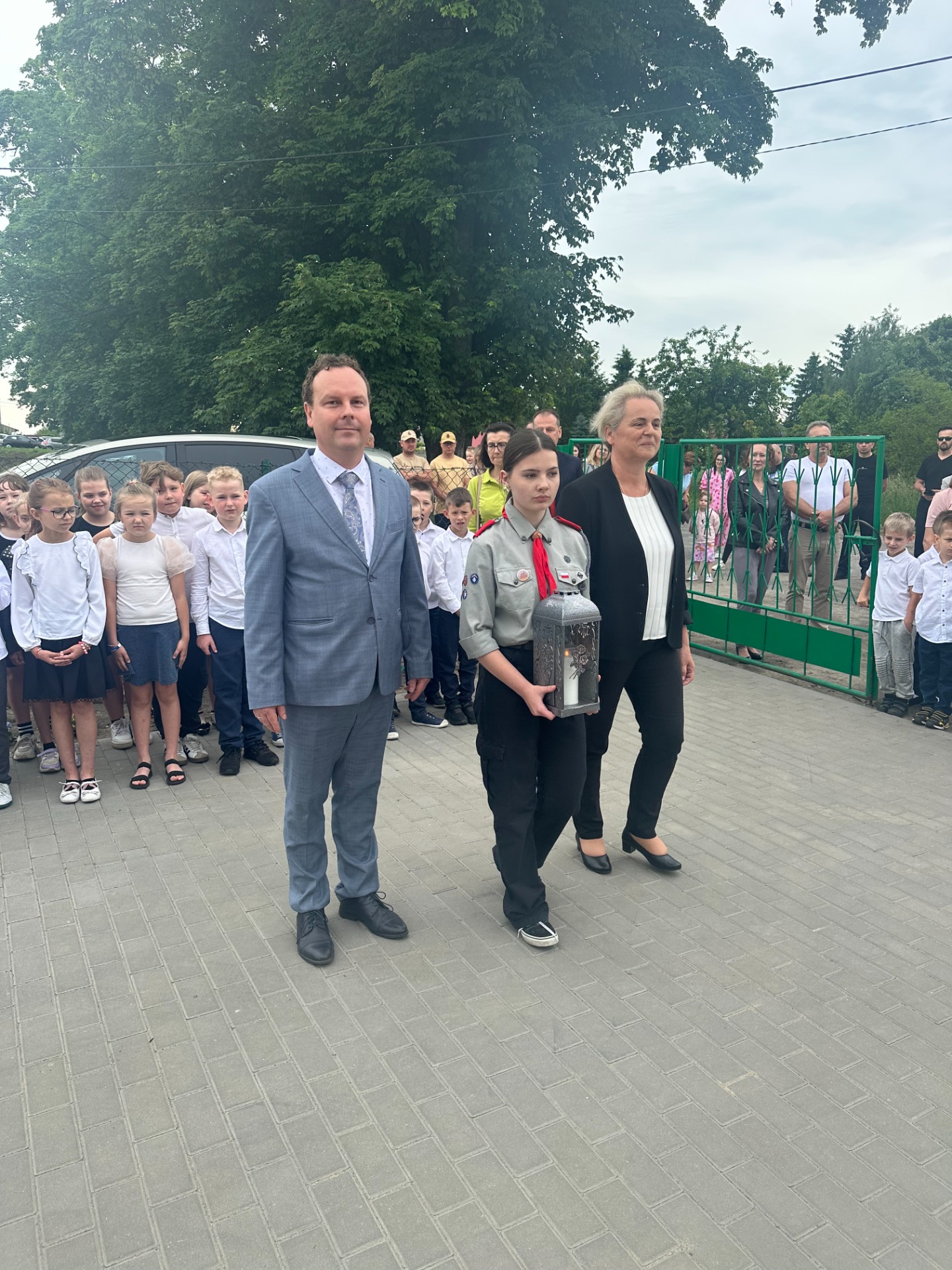 Obchody 30-lecia nadania szkole imienia rozpoczęliśmy przed budynkiem od odśpiewania hymnu narodowego. Następnie delegacje Urzędu Gminy Mycielin oraz ZSP w Dzierzbinie-Kolonii złożyły kwiaty oraz znicz przy kamieniu upamiętniającym wydarzenia, które miały miejsce trzydzieści lat wcześniej.