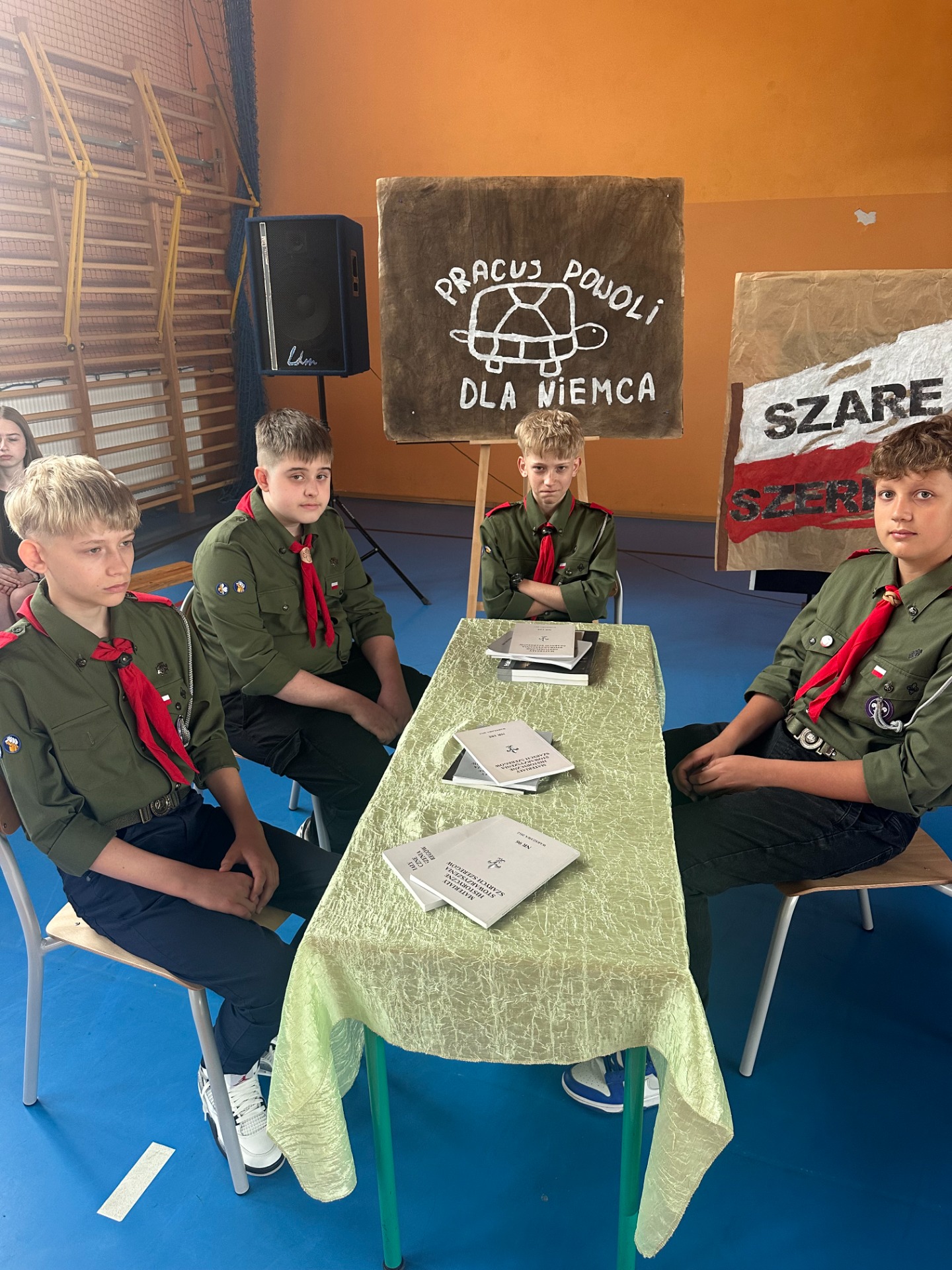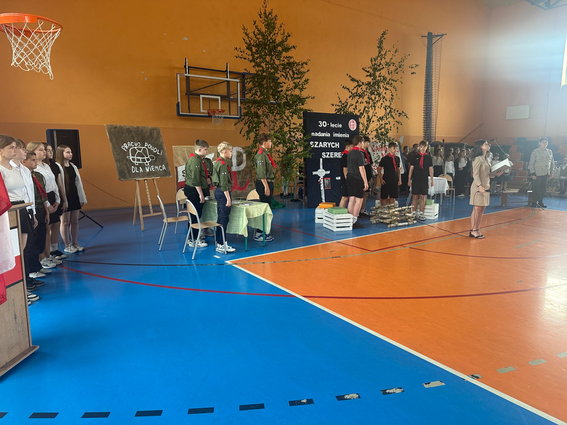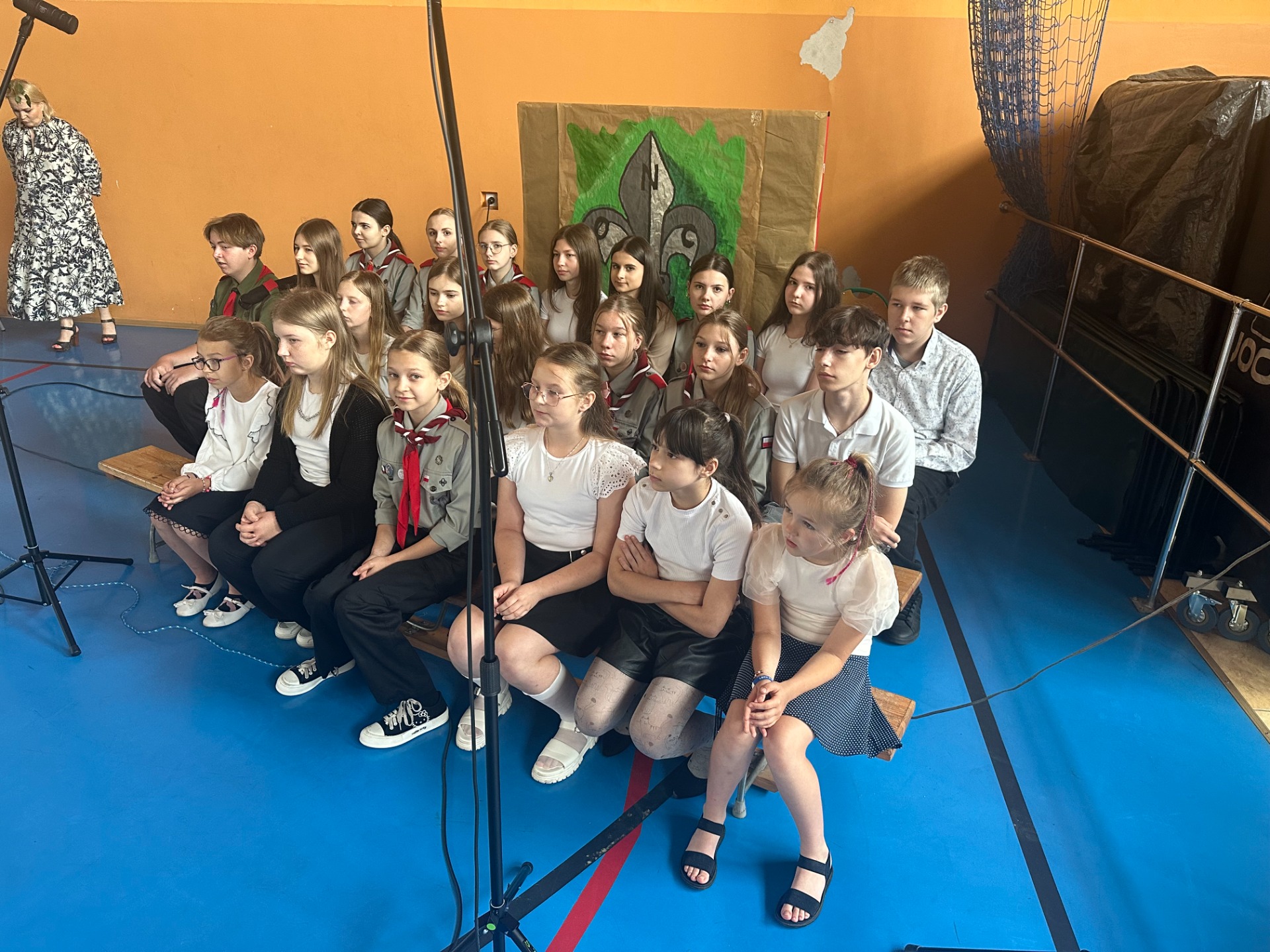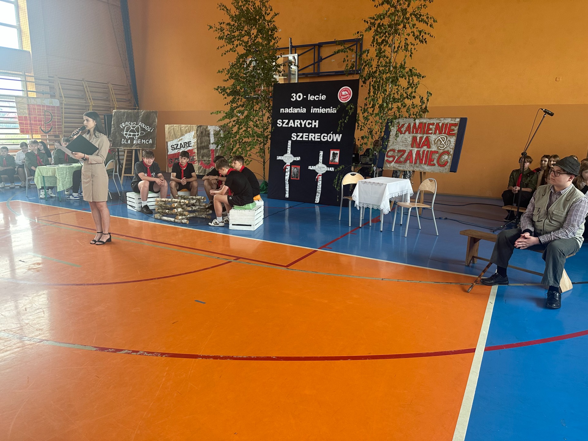 Dalsza część uroczystości odbyła się w sali gimnastycznej. Najpierw zebrani goście obejrzeli krótkie scenki obrazujące życie harcerzy w czasie II wojny światowej oraz wysłuchali piosenek harcerskich w wykonaniu chóru szkolnego.