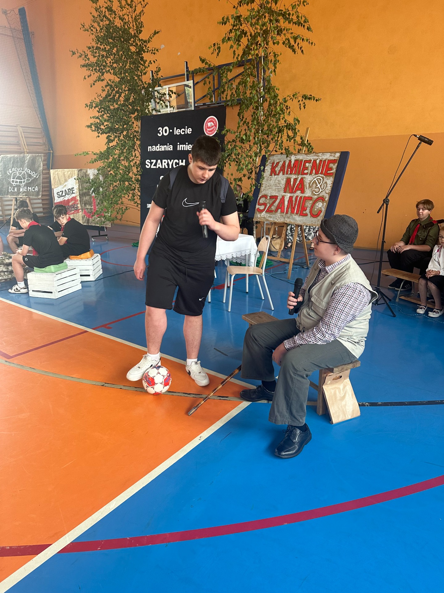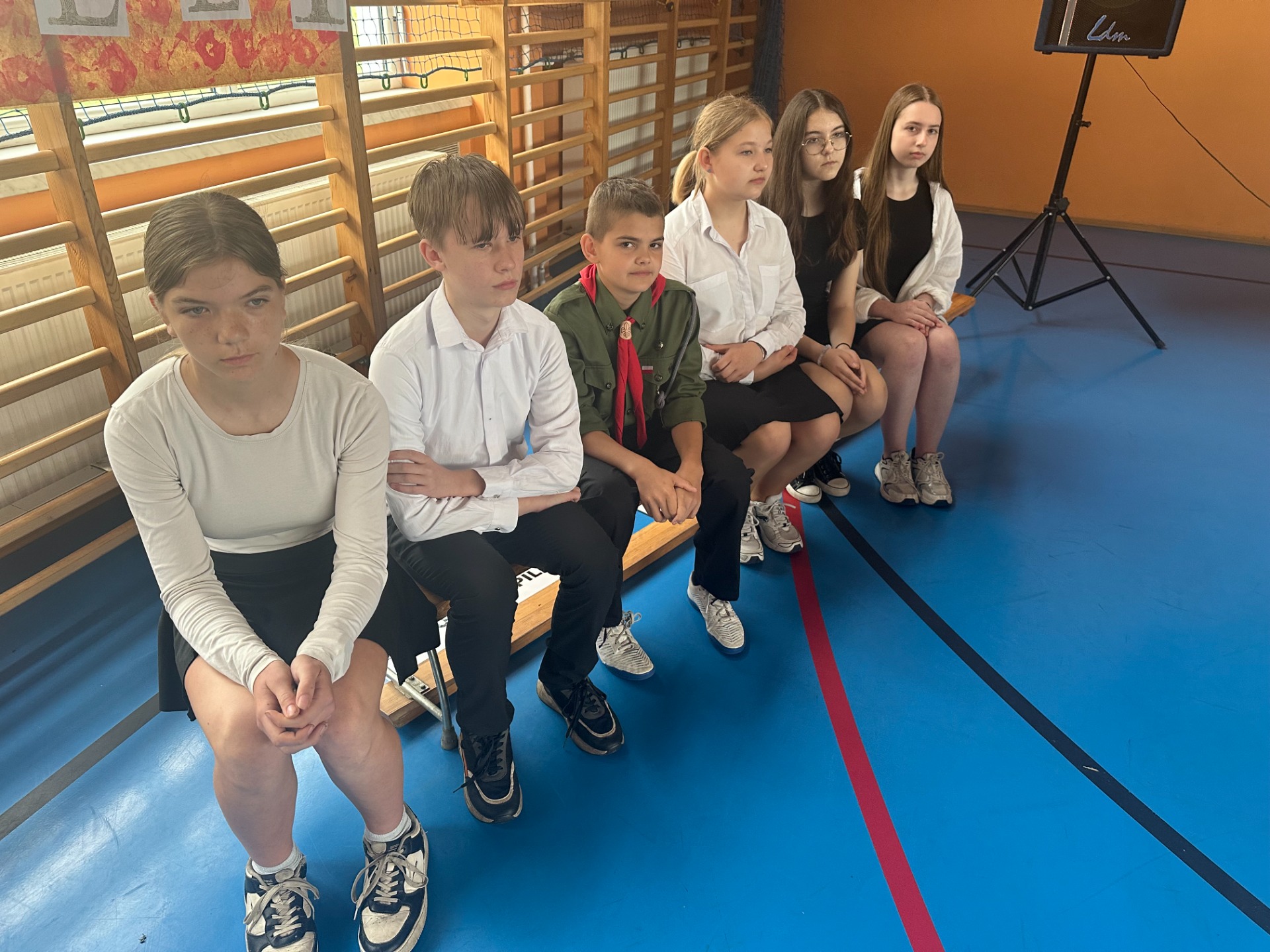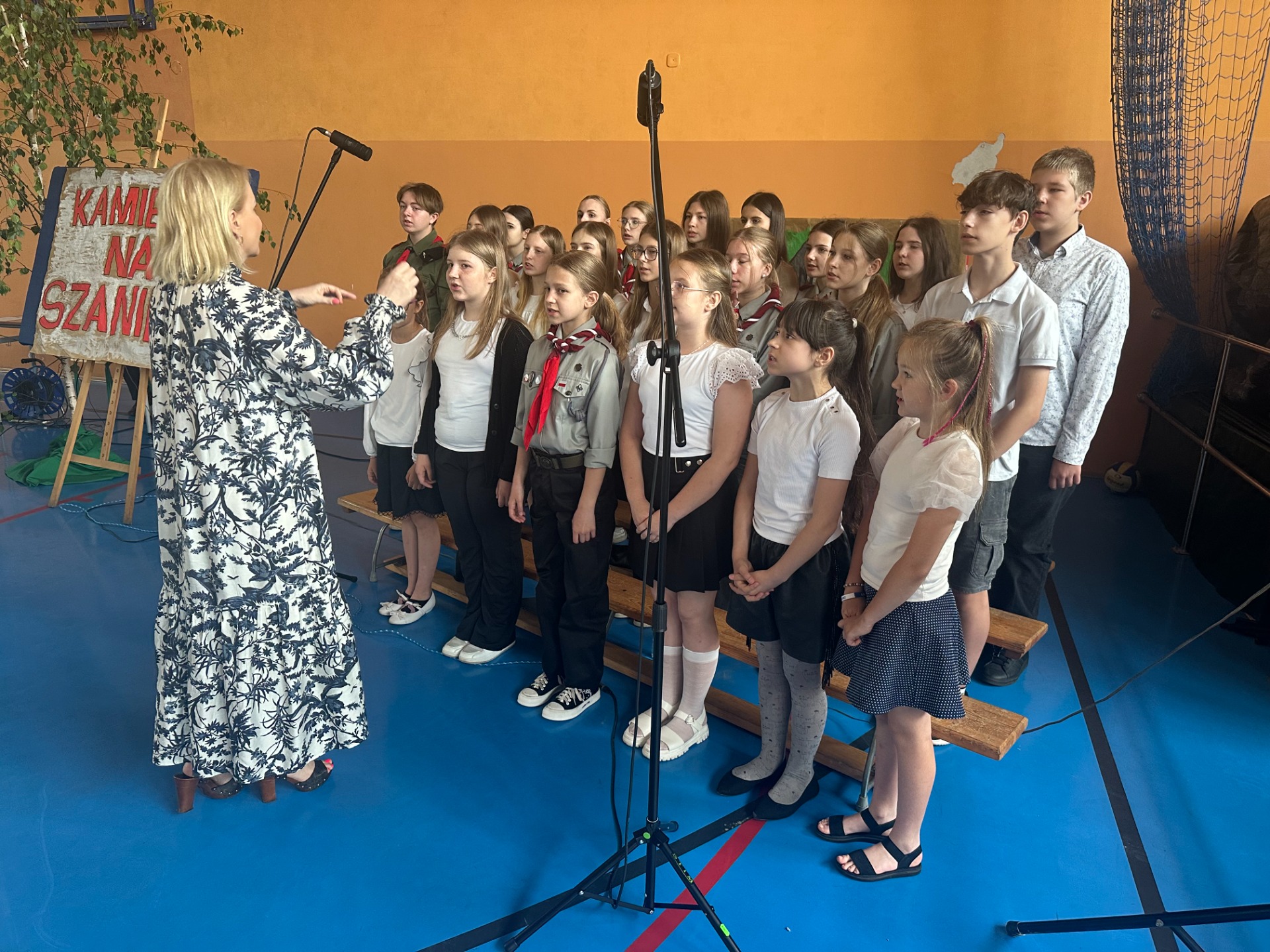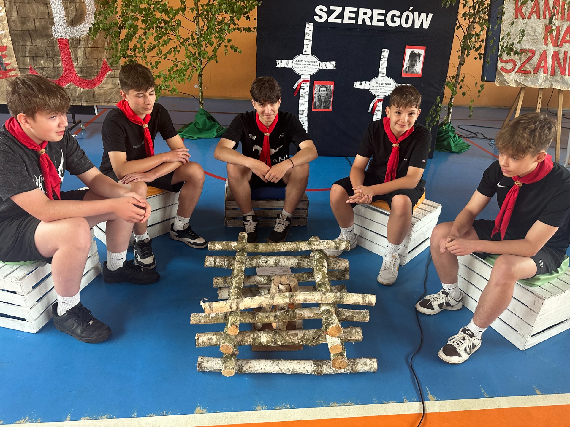 Dalsza część uroczystości odbyła się w sali gimnastycznej. Najpierw zebrani goście obejrzeli krótkie scenki obrazujące życie harcerzy w czasie II wojny światowej oraz wysłuchali piosenek harcerskich w wykonaniu chóru szkolnego.
