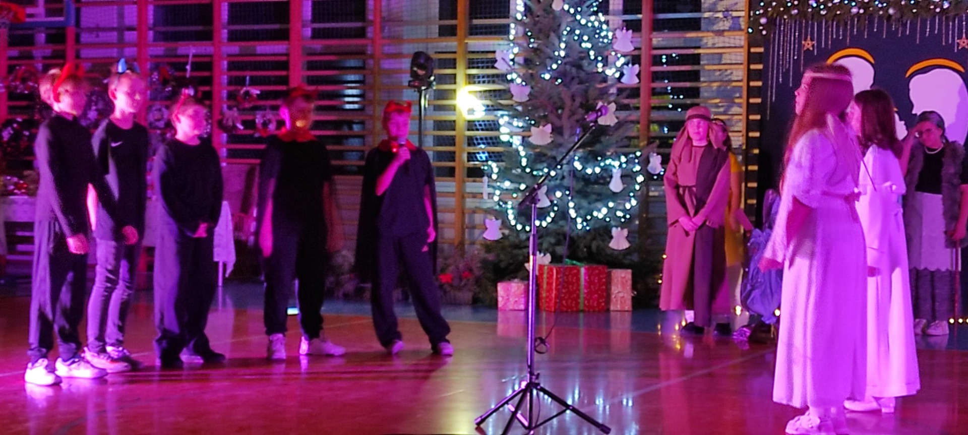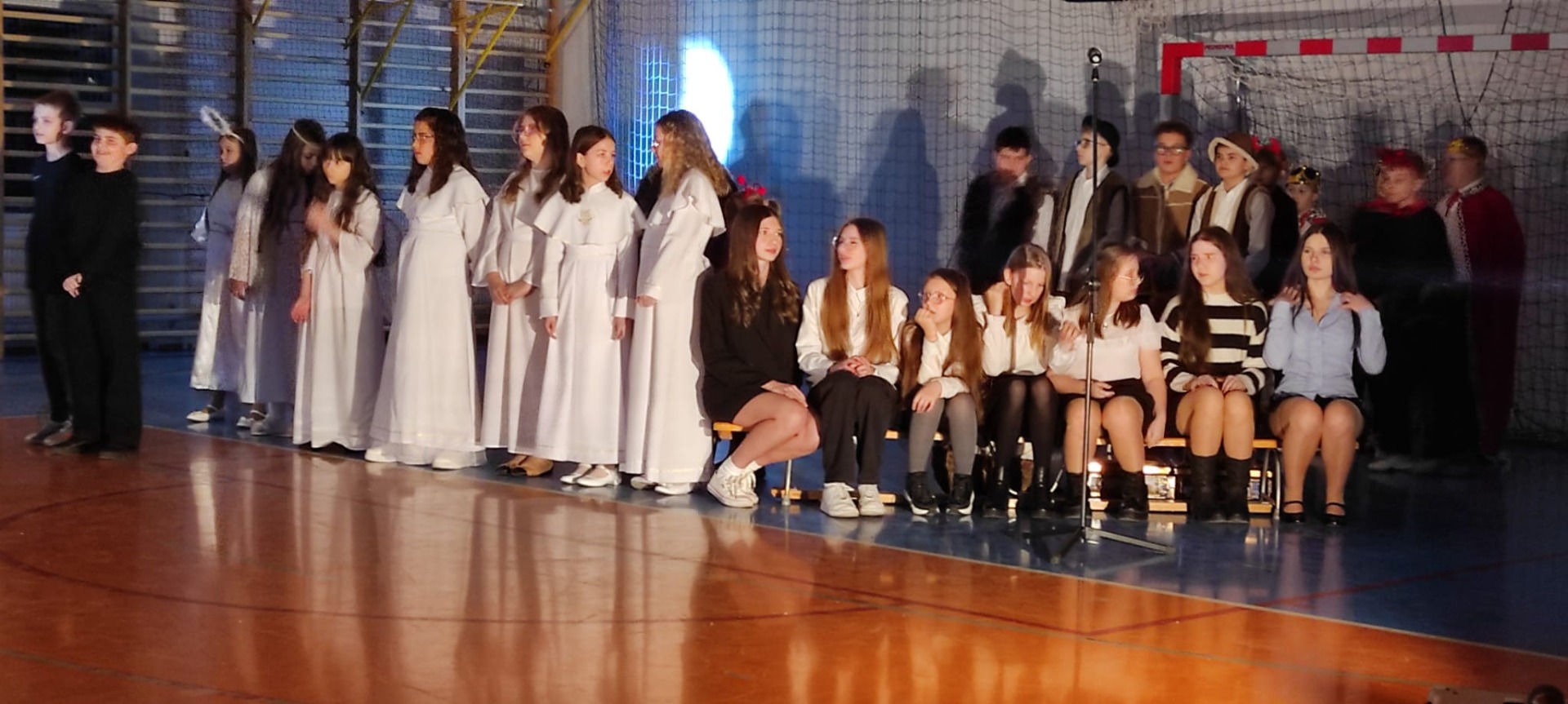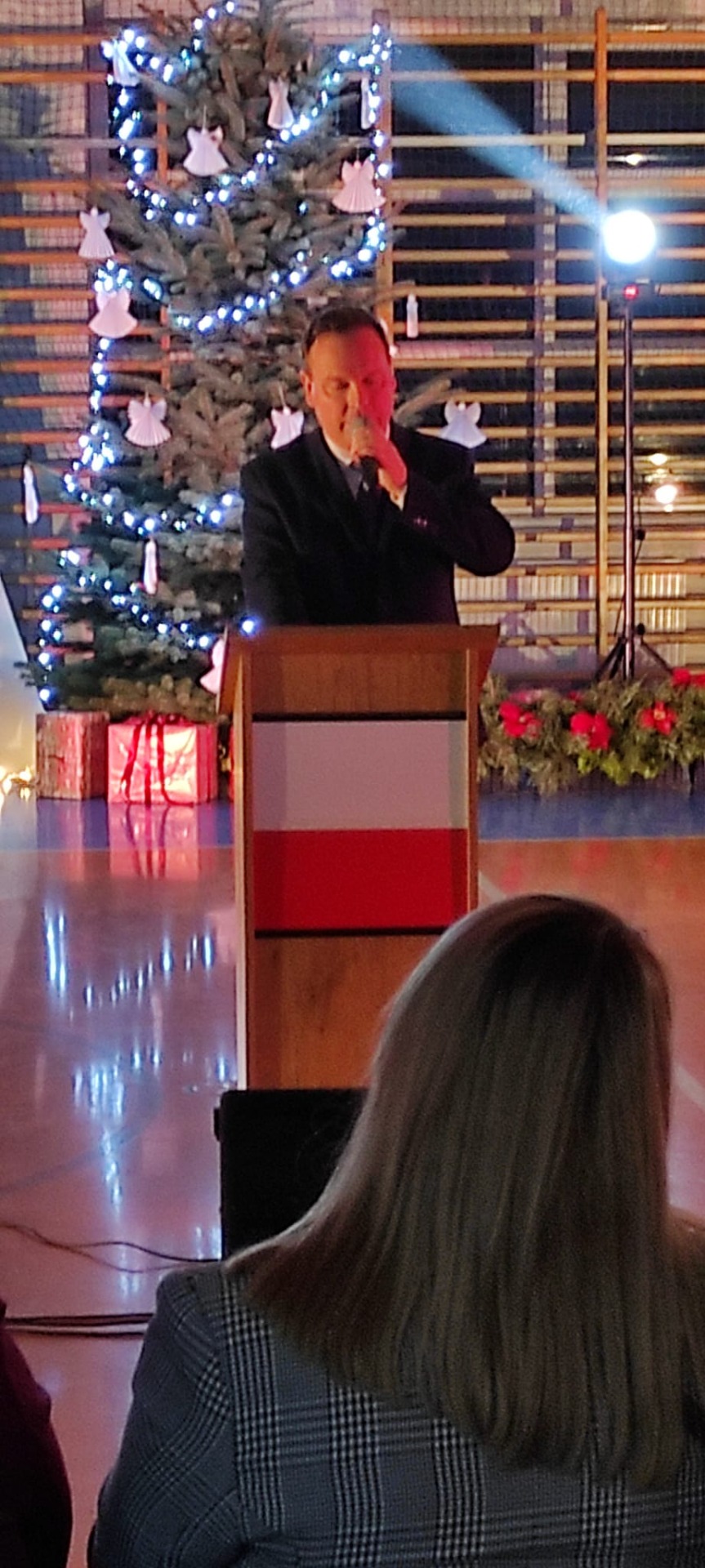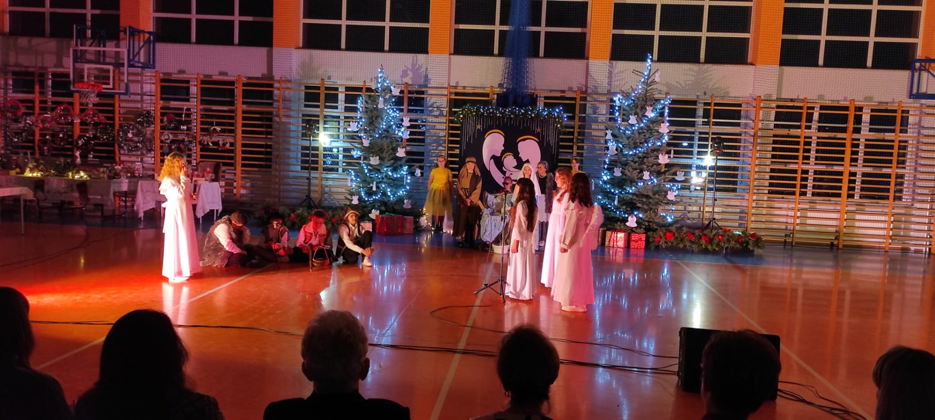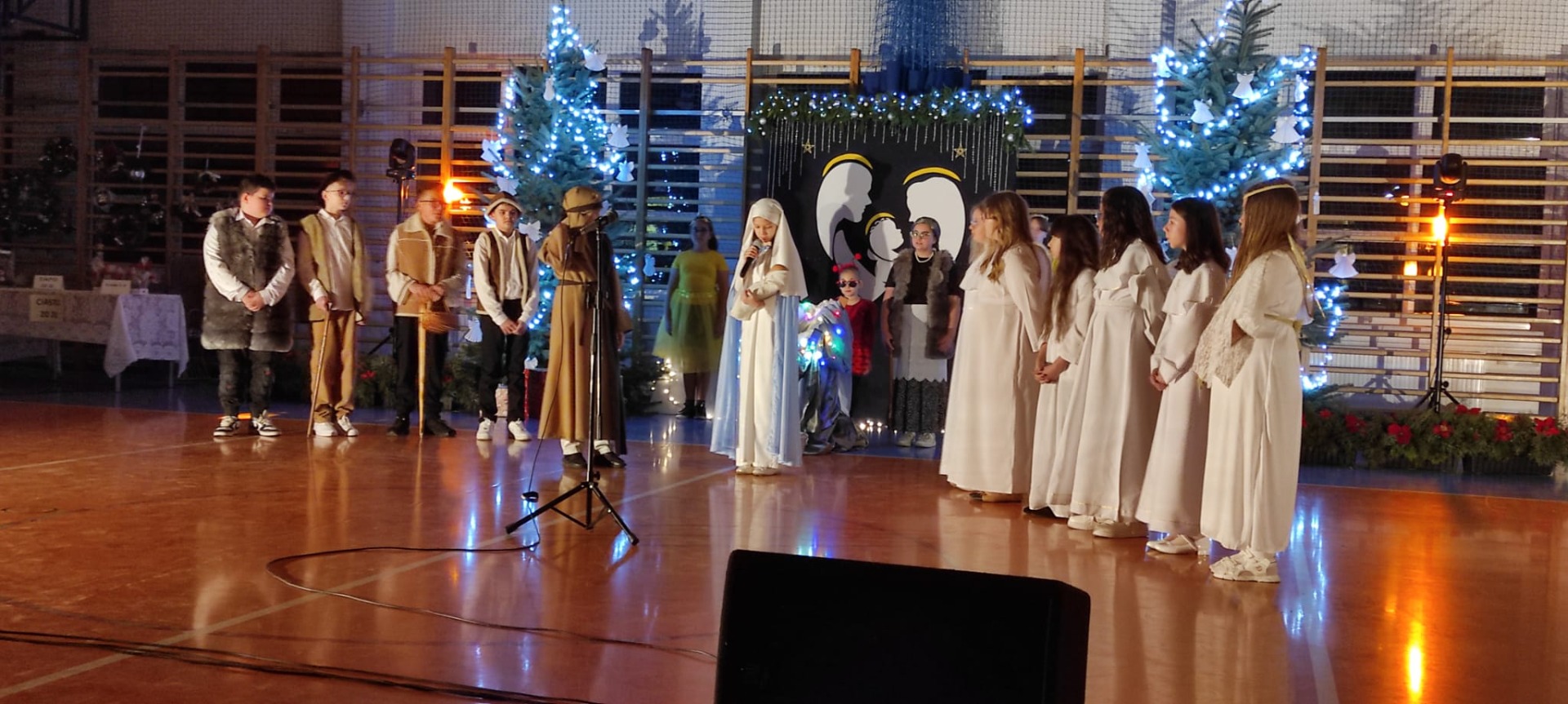 P. Dyrektor R. Wawrzyniak przywitał wszystkich gości i zaprosił do wspólnego oglądania występów szkolnych artystów. Po jasełkach, krótki koncert piosenek bożonarodzeniowych wykonali reprezentanci Orkiestry Dętej z Mycielina. Po występach głos zabrał Radny Powiatu Kaliskiego p. D. Korczyński, który w swym krótkim przemówieniu podkreślił rodzinne świętowanie Bożego Narodzenia. Następnie głos zabrał p. wójt R. Szelągowski składając życzenia wszystkim zgromadzonym na sali. P. Dyrektor podziękował wszystkim za przygotowaną uroczystość oraz zaprosił wszystkich gości na poczęstunek przygotowany przez Radę Rodziców, a także szkolne panie kucharki.