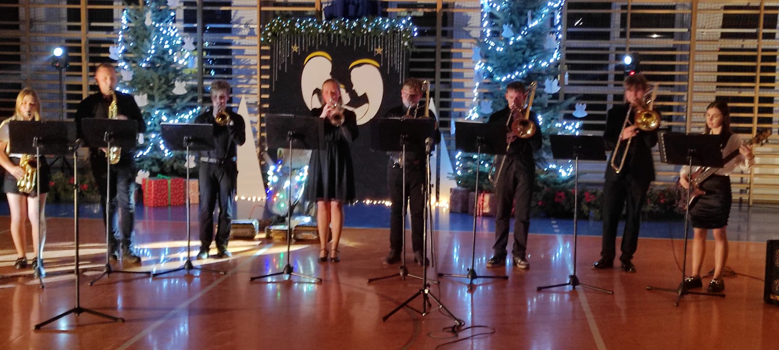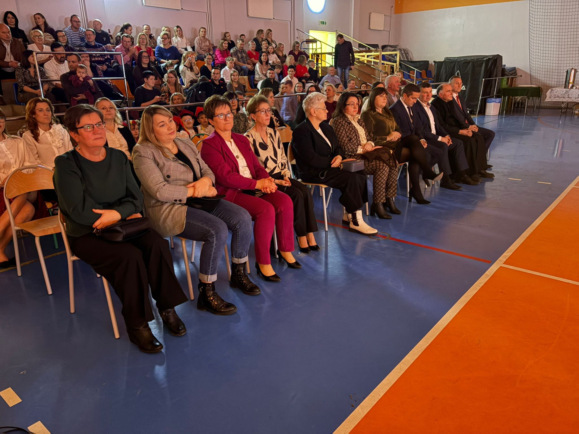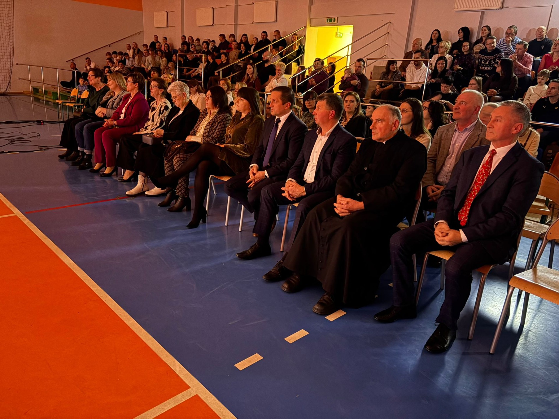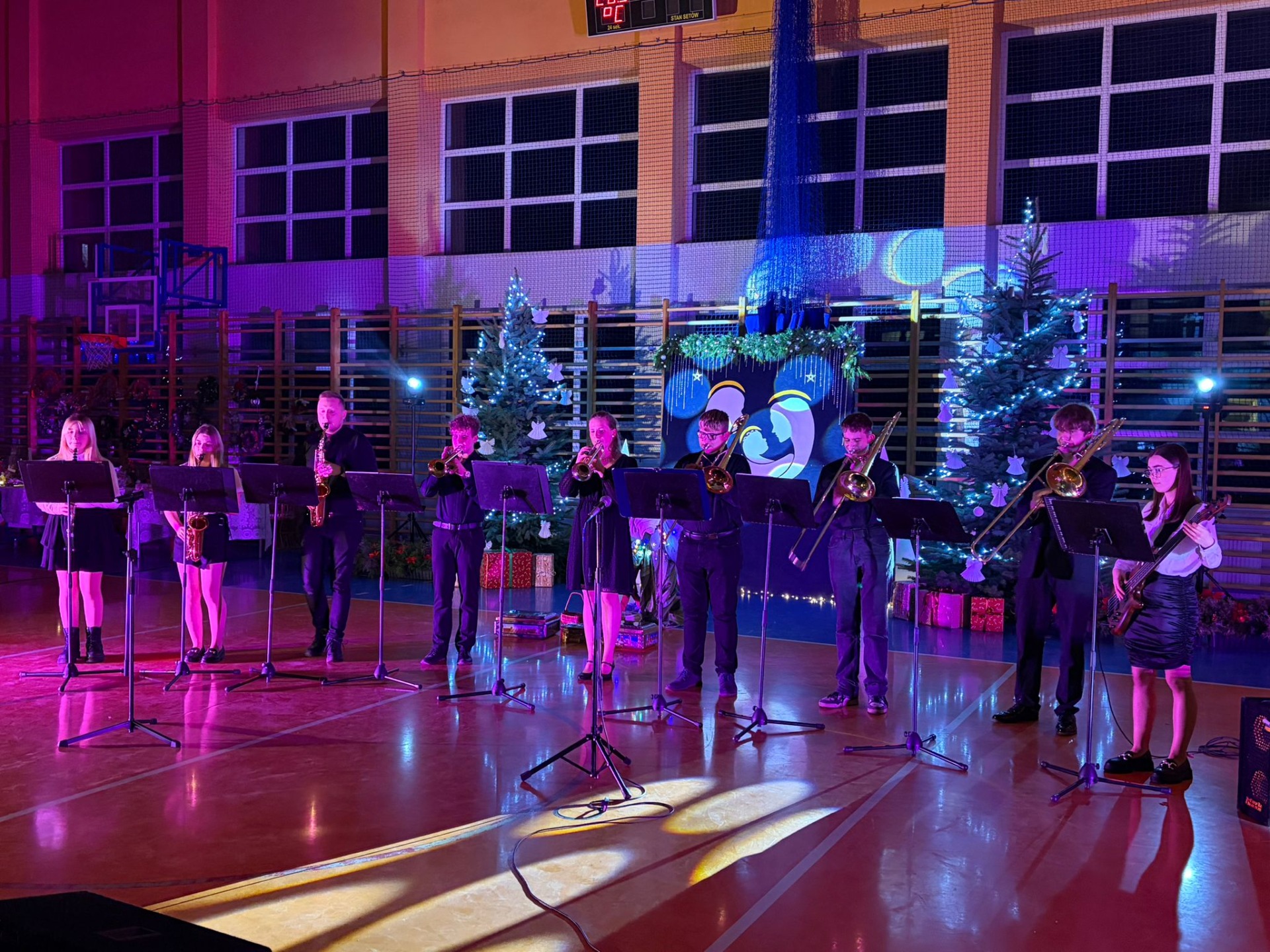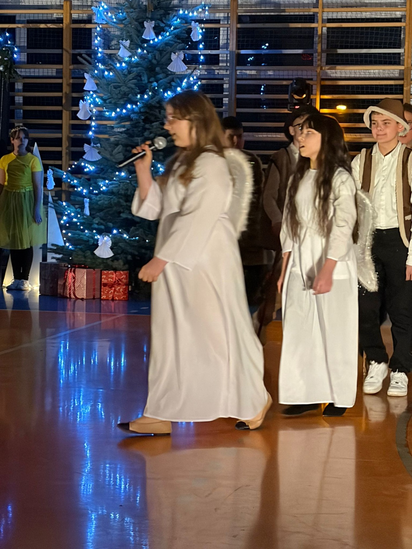 P. Dyrektor R. Wawrzyniak przywitał wszystkich gości i zaprosił do wspólnego oglądania występów szkolnych artystów. Po jasełkach, krótki koncert piosenek bożonarodzeniowych wykonali reprezentanci Orkiestry Dętej z Mycielina. Po występach głos zabrał Radny Powiatu Kaliskiego p. D. Korczyński, który w swym krótkim przemówieniu podkreślił rodzinne świętowanie Bożego Narodzenia. Następnie głos zabrał p. wójt R. Szelągowski składając życzenia wszystkim zgromadzonym na sali. P. Dyrektor podziękował wszystkim za przygotowaną uroczystość oraz zaprosił wszystkich gości na poczęstunek przygotowany przez Radę Rodziców, a także szkolne panie kucharki.