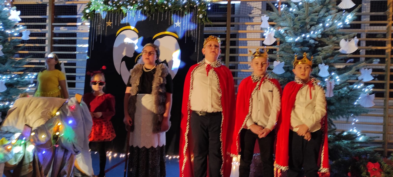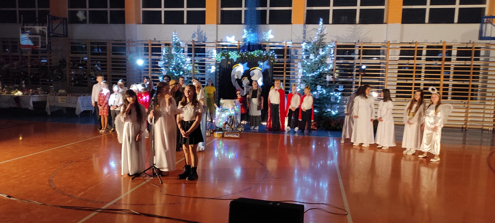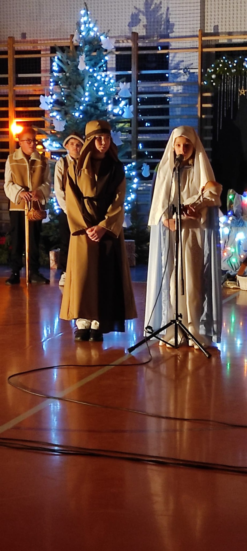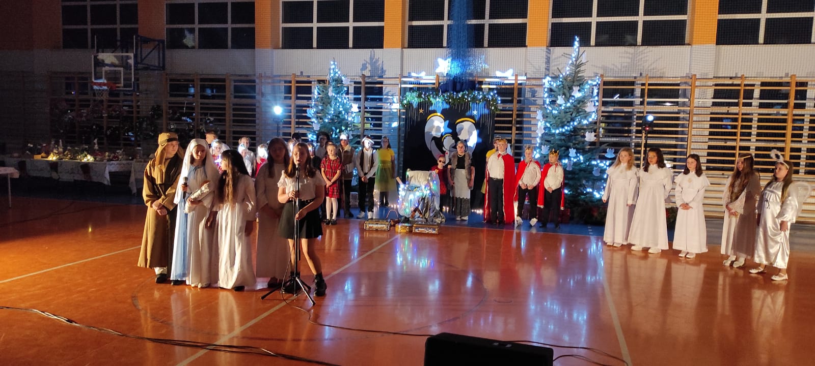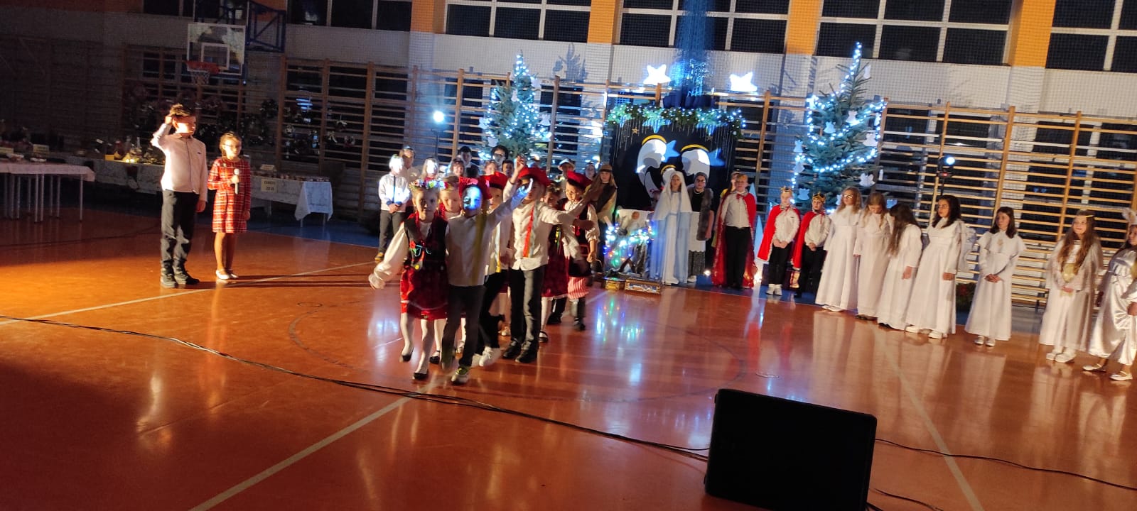 Uczniowie z kl. VI, V, IV a także z kl. I, III, II również przedszkolaki zaprezentowali jasełka pt.” Jedna jest taka noc”. Do występów uczniów przyczyniły się: p. A. Jankowska – chór i wykonania solowe małych artystów; p. Ż. Zygmunt przygotowanie tekstów , deklamację i dykcję. P. A. Chorąży wykonała dekorację przy współpracy z rodzicami i pracownikami obsługi. Piosenkę „jest taki dzień” przygotowały panie z przedszkola z dziećmi przy współudziale rodziców. Koordynatorem szkolnych wydarzeń była p. K. Milewska.