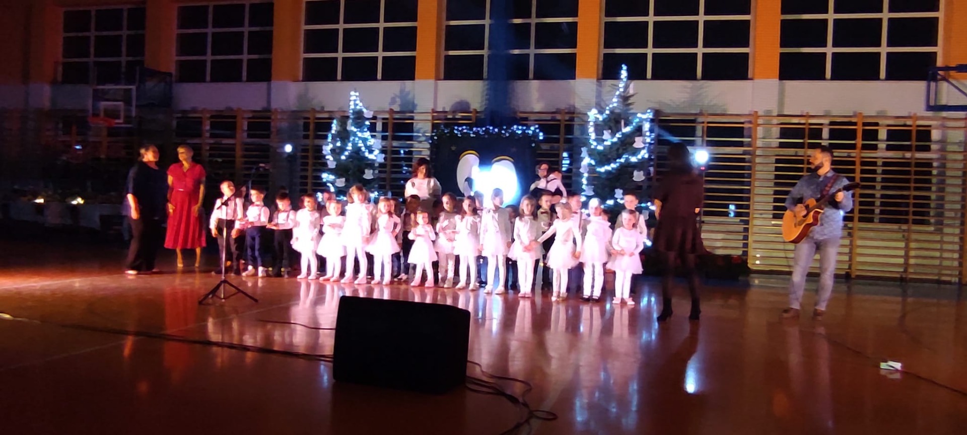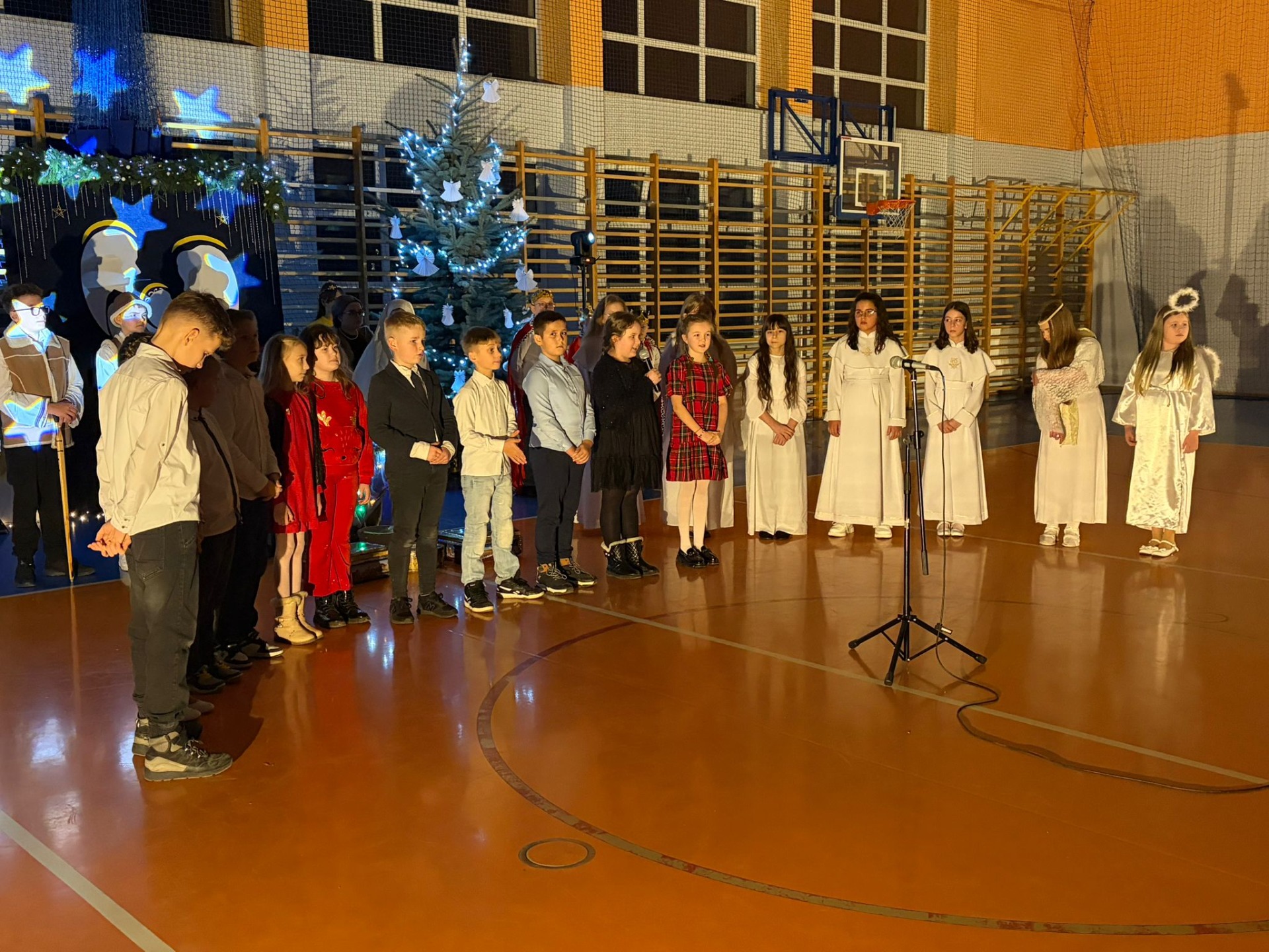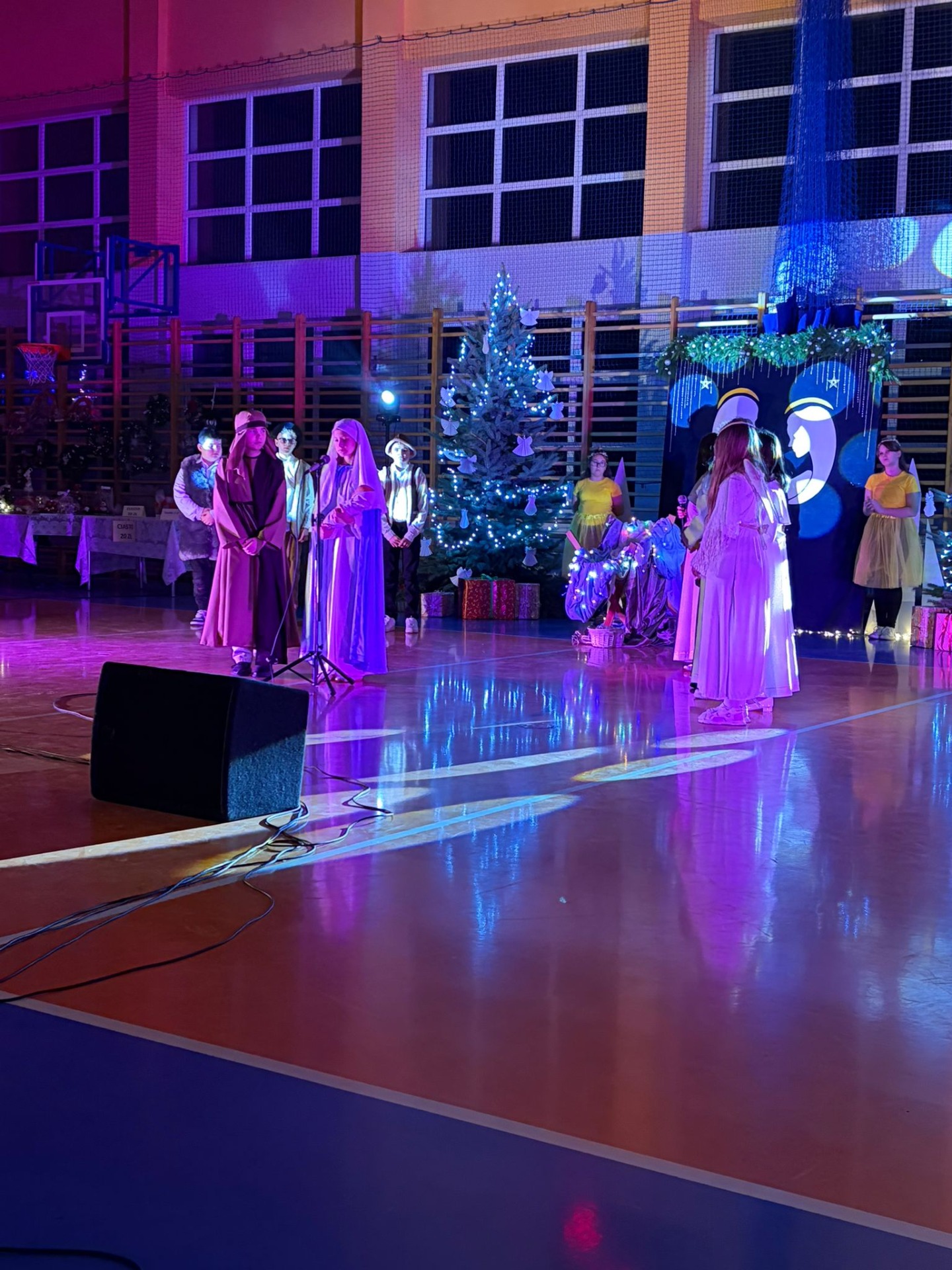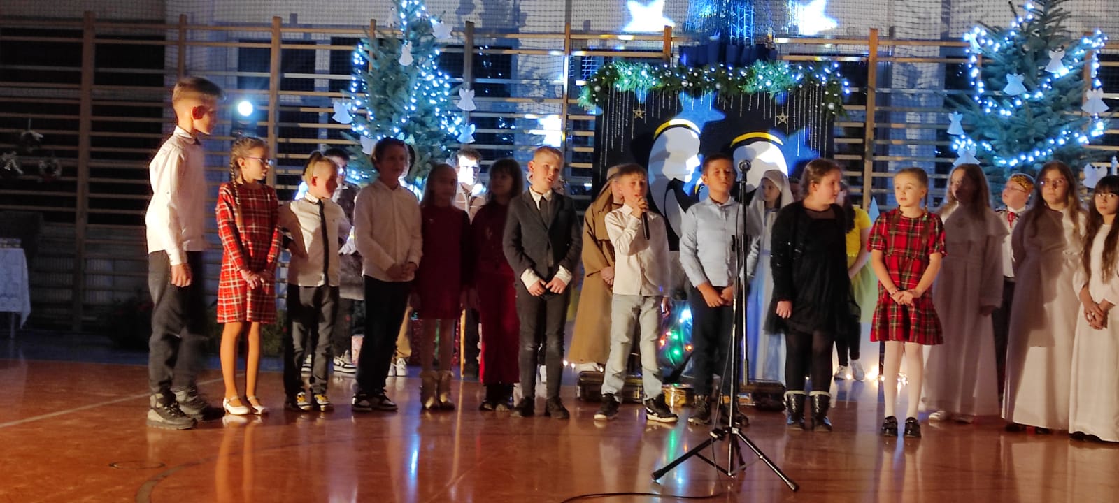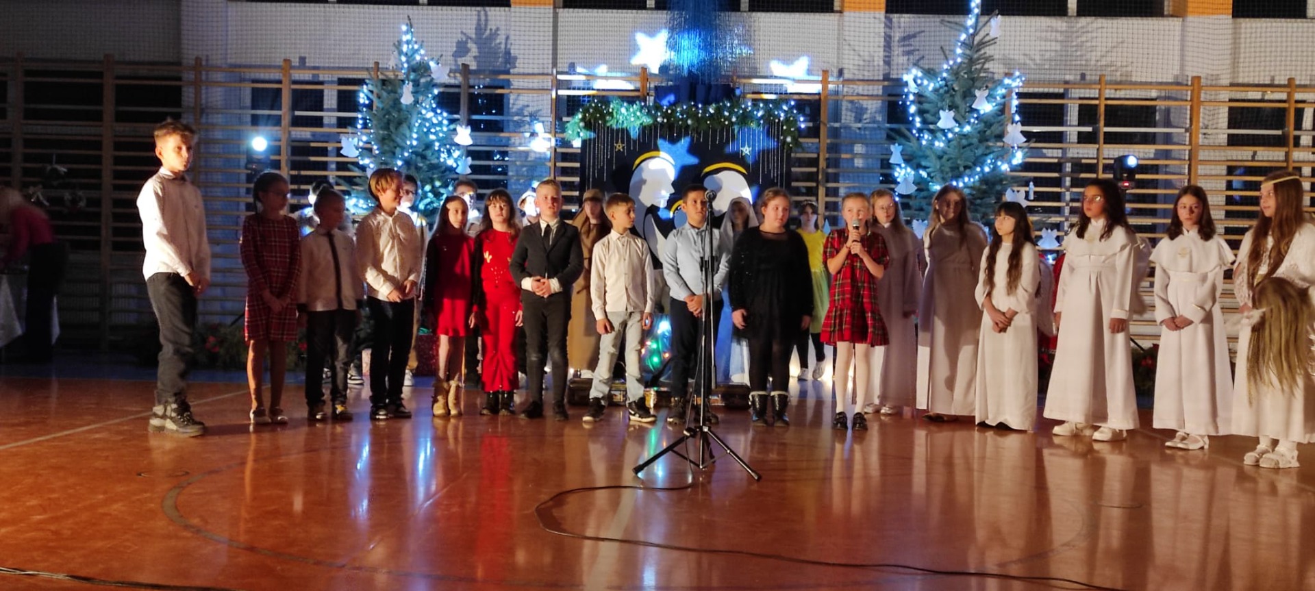 Uczniowie z kl. VI, V, IV a także z kl. I, III, II również przedszkolaki zaprezentowali jasełka pt.” Jedna jest taka noc”. Do występów uczniów przyczyniły się: p. A. Jankowska – chór i wykonania solowe małych artystów; p. Ż. Zygmunt przygotowanie tekstów , deklamację i dykcję. P. A. Chorąży wykonała dekorację przy współpracy z rodzicami i pracownikami obsługi. Piosenkę „jest taki dzień” przygotowały panie z przedszkola z dziećmi przy współudziale rodziców. Koordynatorem szkolnych wydarzeń była p. K. Milewska.
