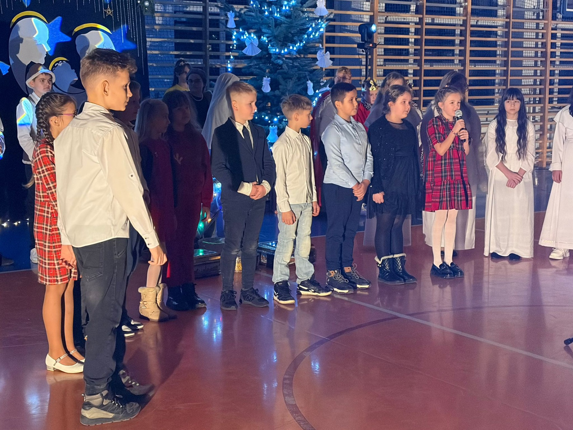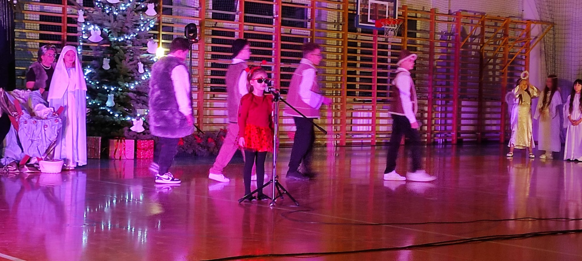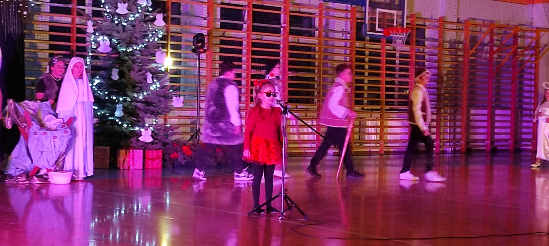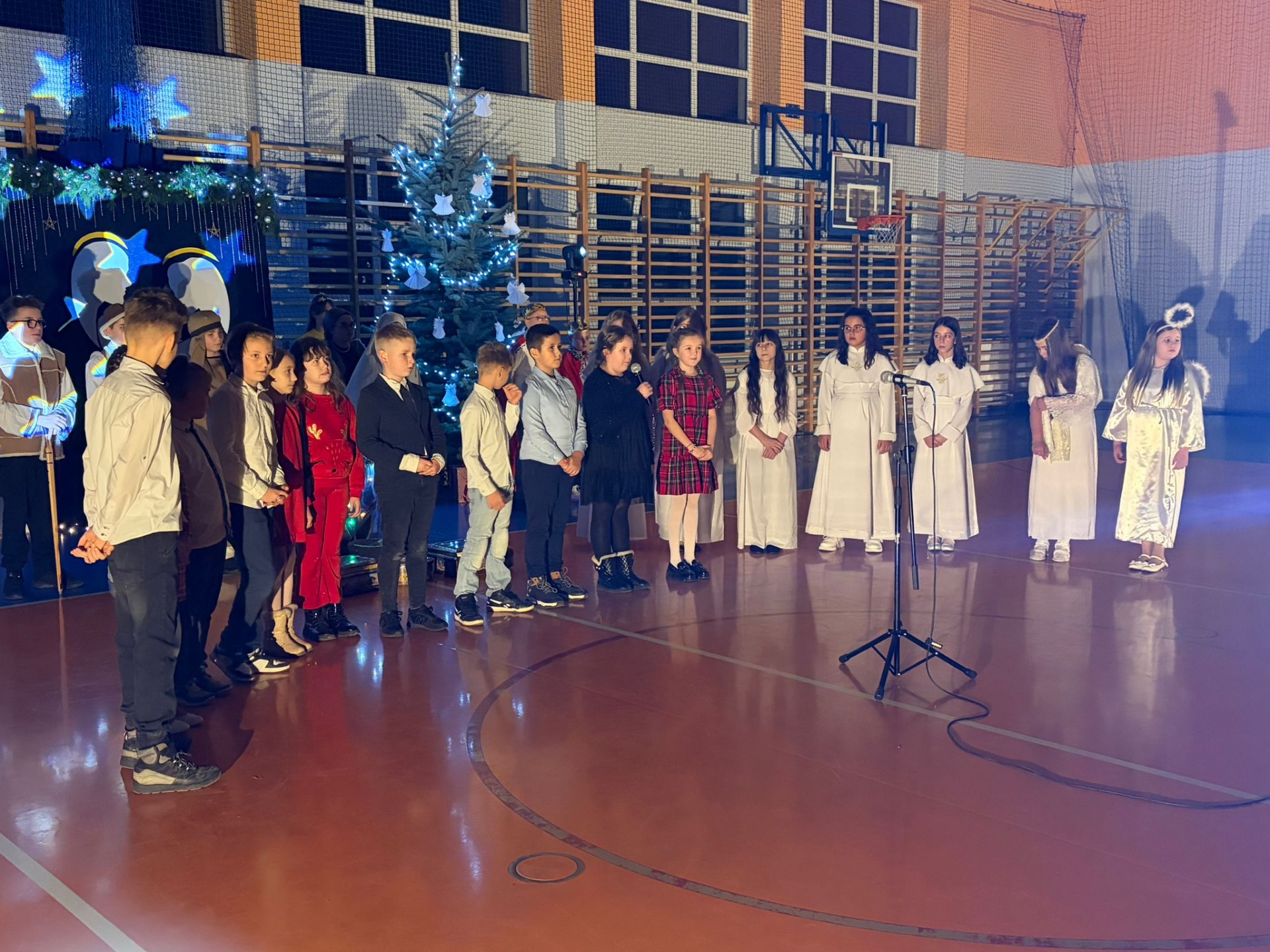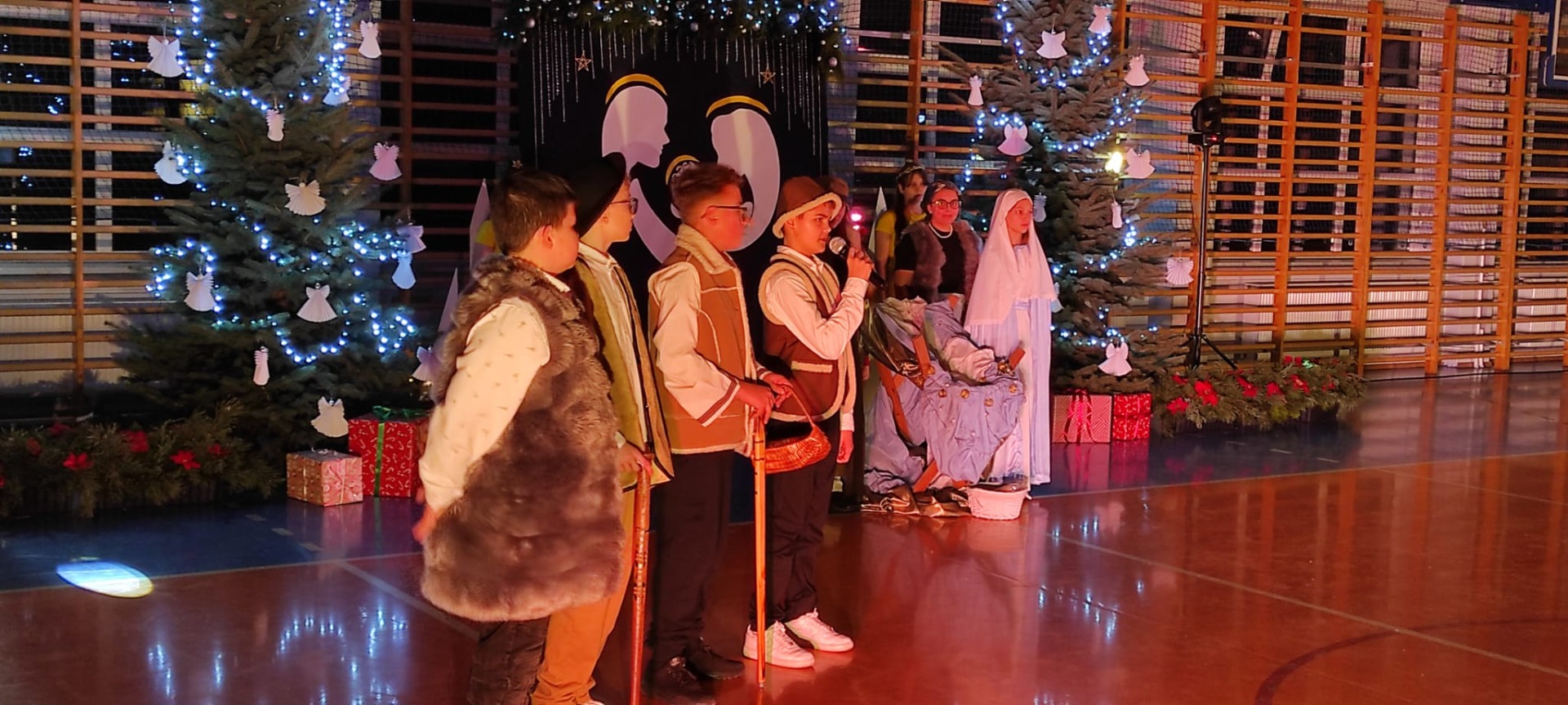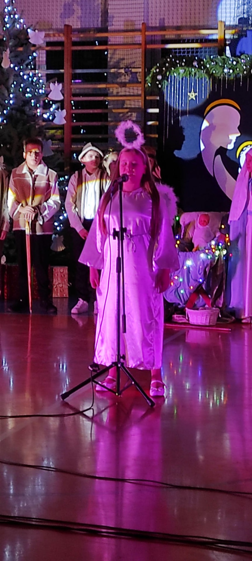 Uczniowie z kl. VI, V, IV a także z kl. I, III, II również przedszkolaki zaprezentowali jasełka pt.” Jedna jest taka noc”. Do występów uczniów przyczyniły się: p. A. Jankowska – chór i wykonania solowe małych artystów; p. Ż. Zygmunt przygotowanie tekstów , deklamację i dykcję. P. A. Chorąży wykonała dekorację przy współpracy z rodzicami i pracownikami obsługi. Piosenkę „jest taki dzień” przygotowały panie z przedszkola z dziećmi przy współudziale rodziców. Koordynatorem szkolnych wydarzeń była p. K. Milewska.