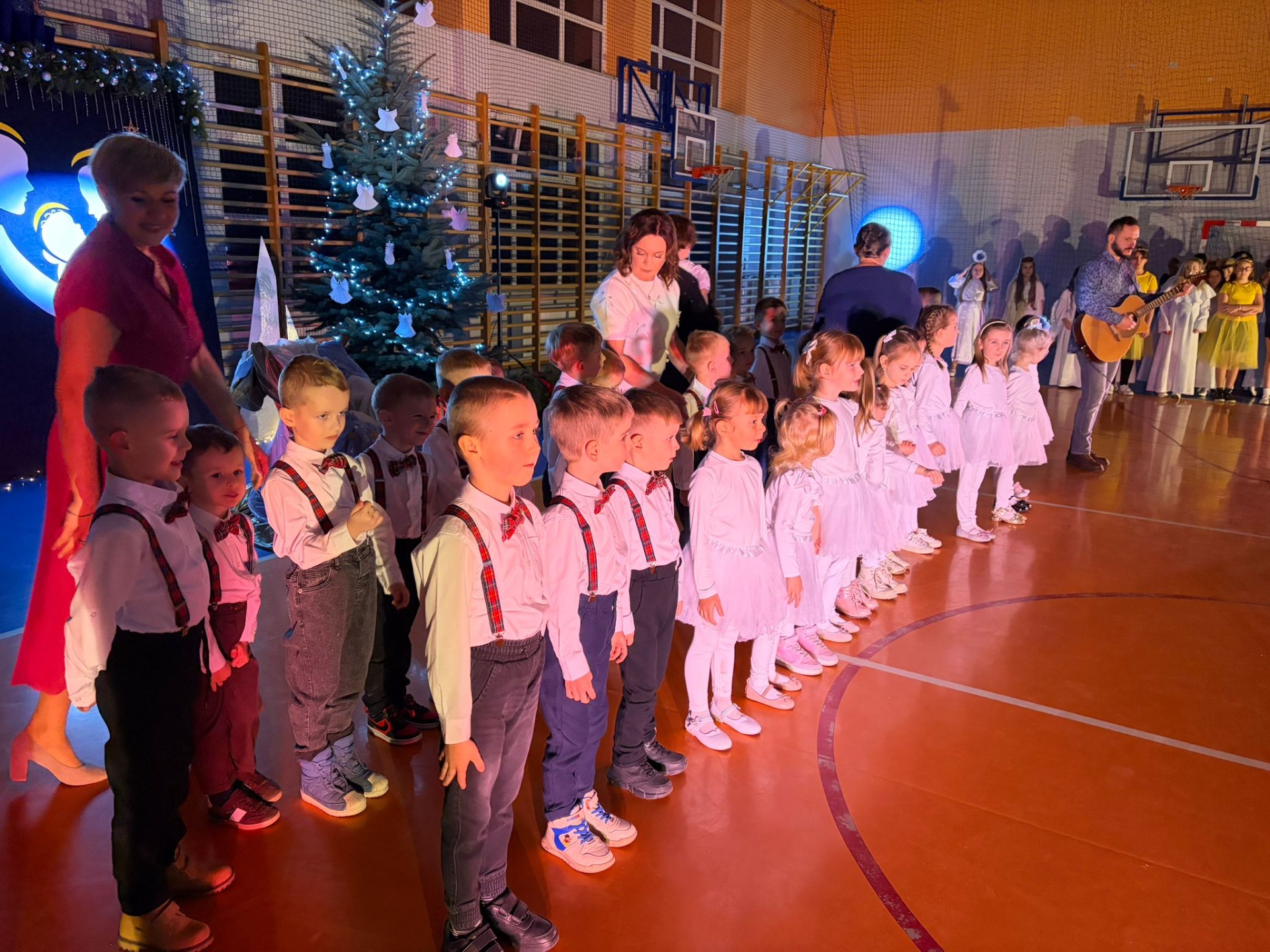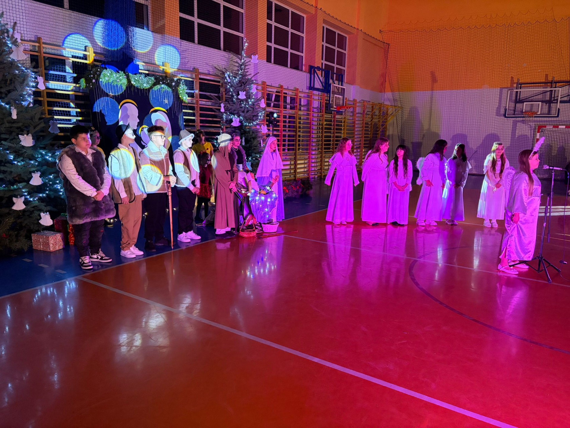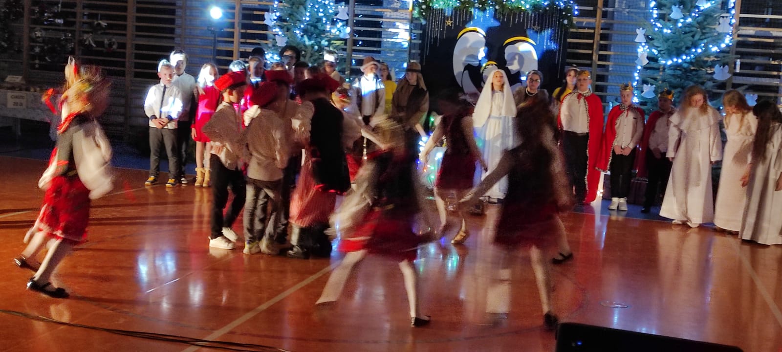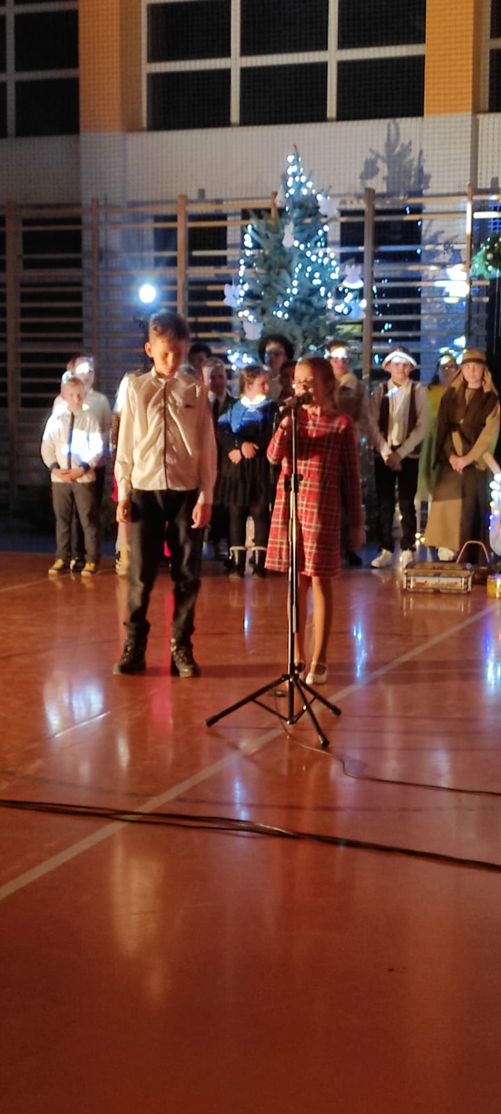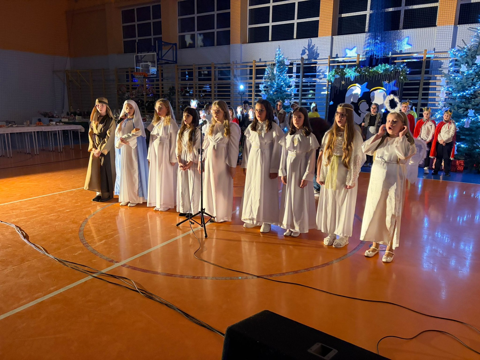 Uczniowie z kl. VI, V, IV a także z kl. I, III, II również przedszkolaki zaprezentowali jasełka pt.” Jedna jest taka noc”. Do występów uczniów przyczyniły się: p. A. Jankowska – chór i wykonania solowe małych artystów; p. Ż. Zygmunt przygotowanie tekstów , deklamację i dykcję. P. A. Chorąży wykonała dekorację przy współpracy z rodzicami i pracownikami obsługi. Piosenkę „jest taki dzień” przygotowały panie z przedszkola z dziećmi przy współudziale rodziców. Koordynatorem szkolnych wydarzeń była p. K. Milewska.