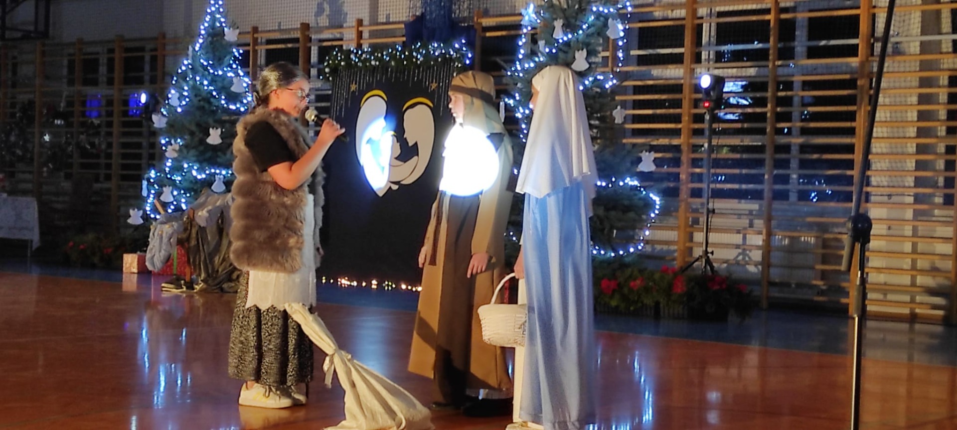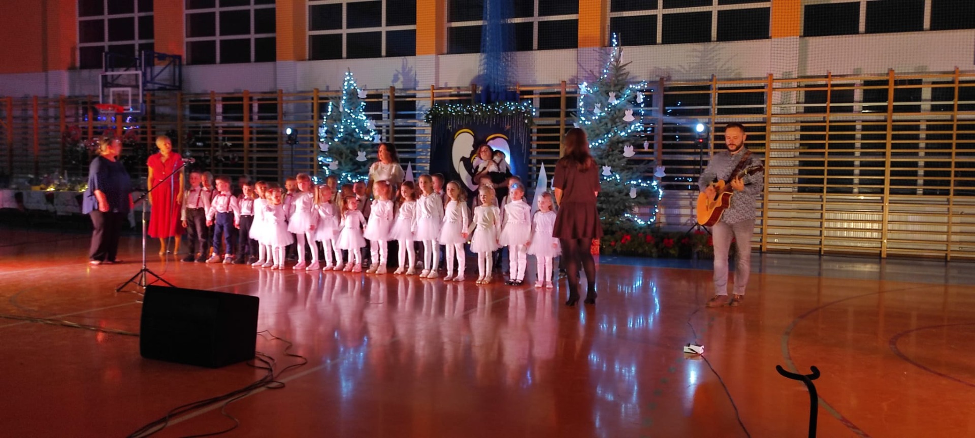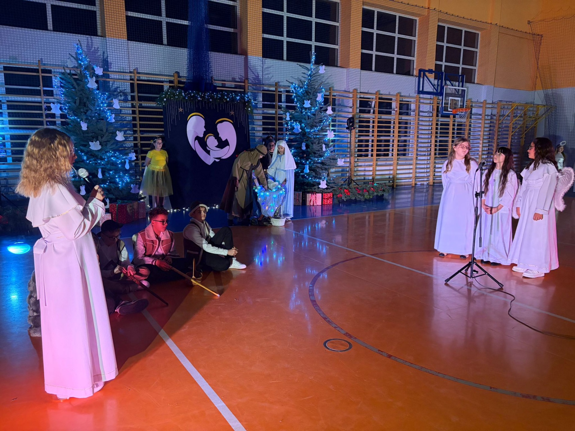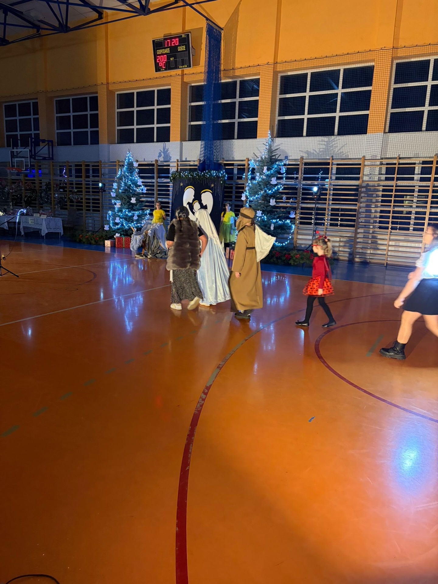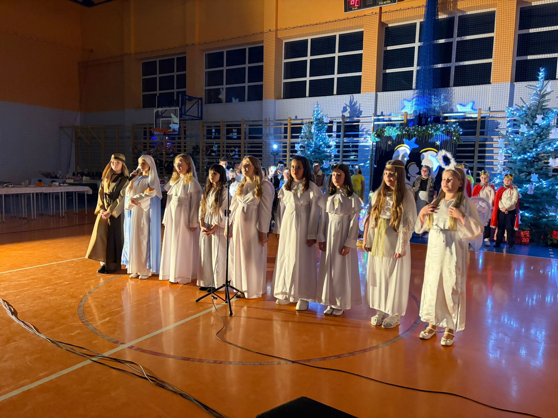 Uczniowie z kl. VI, V, IV a także z kl. I, III, II również przedszkolaki zaprezentowali jasełka pt.” Jedna jest taka noc”. Do występów uczniów przyczyniły się: p. A. Jankowska – chór i wykonania solowe małych artystów; p. Ż. Zygmunt przygotowanie tekstów , deklamację i dykcję. P. A. Chorąży wykonała dekorację przy współpracy z rodzicami i pracownikami obsługi. Piosenkę „jest taki dzień” przygotowały panie z przedszkola z dziećmi przy współudziale rodziców. Koordynatorem szkolnych wydarzeń była p. K. Milewska.