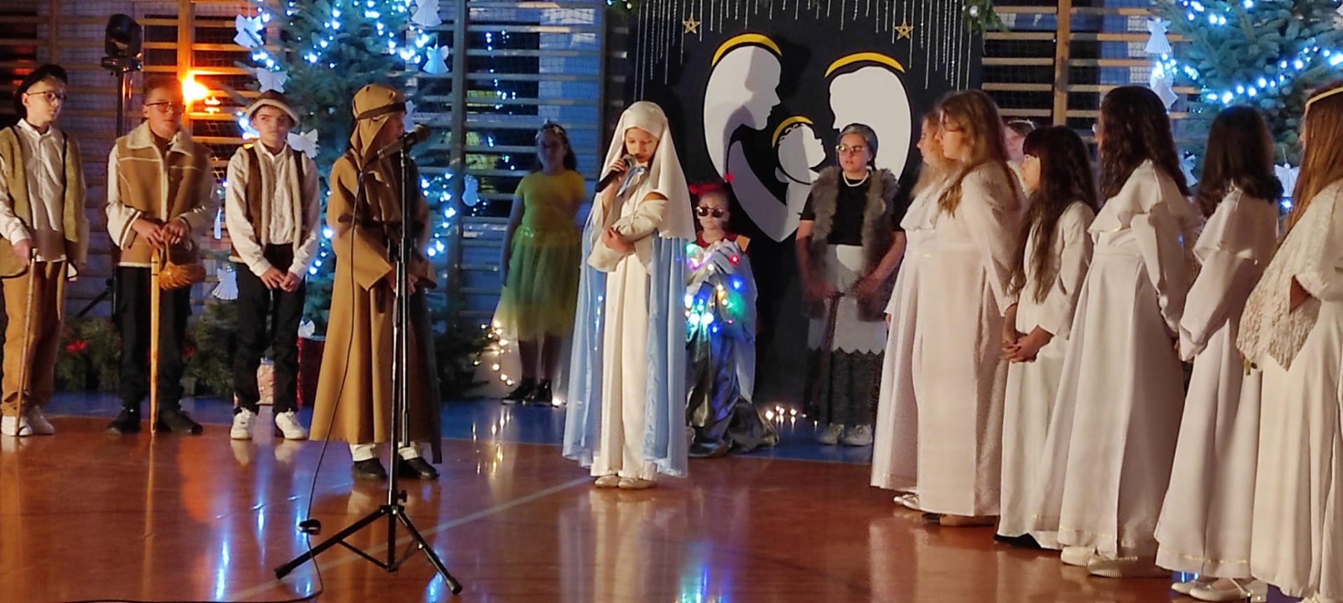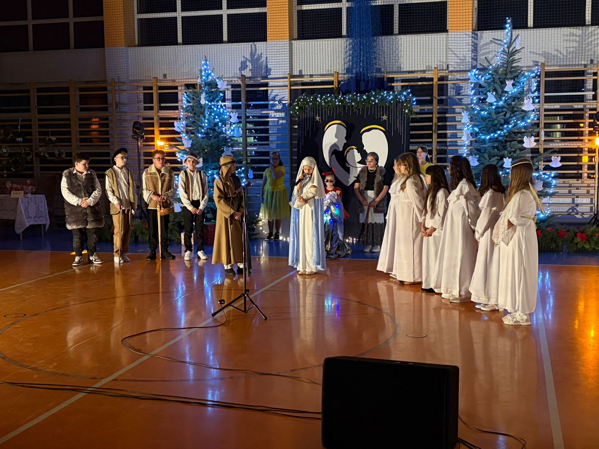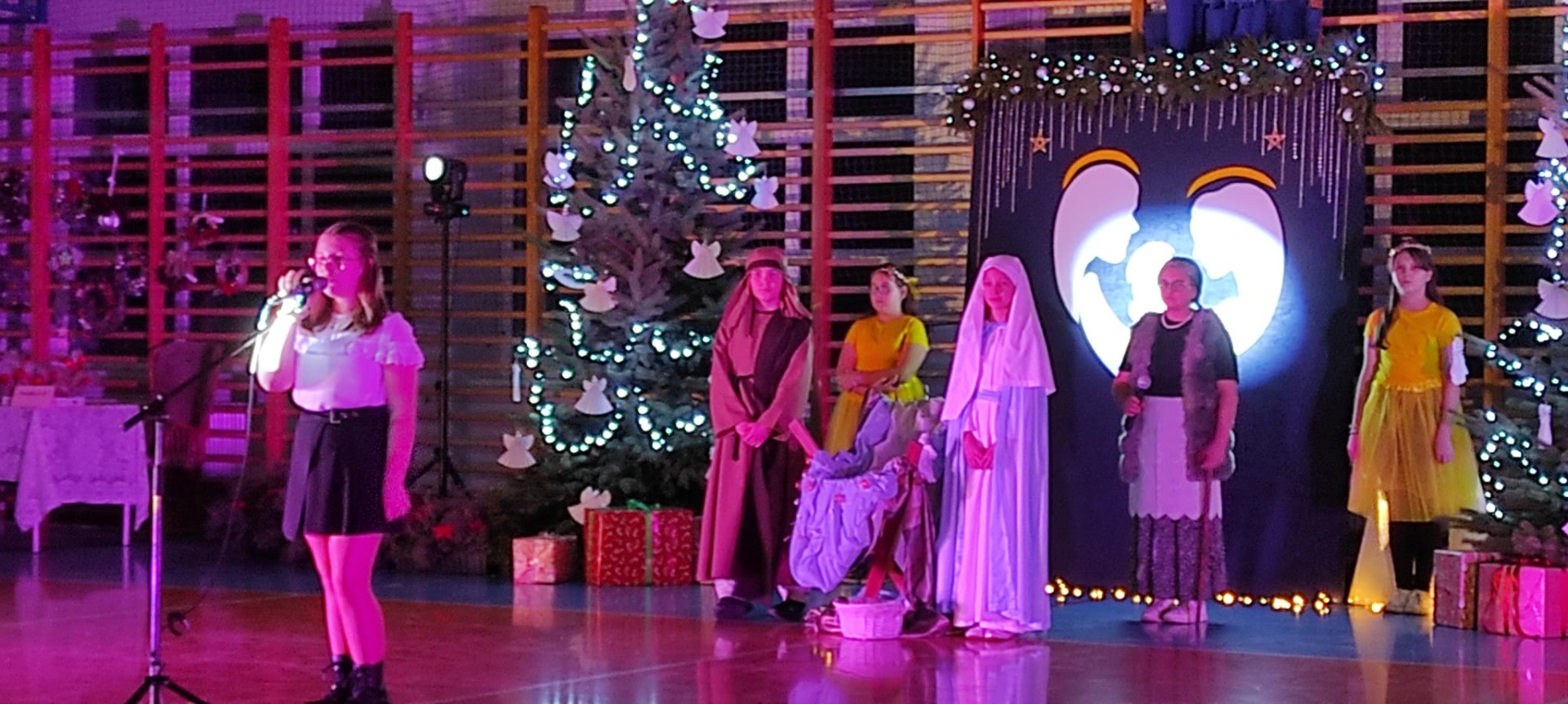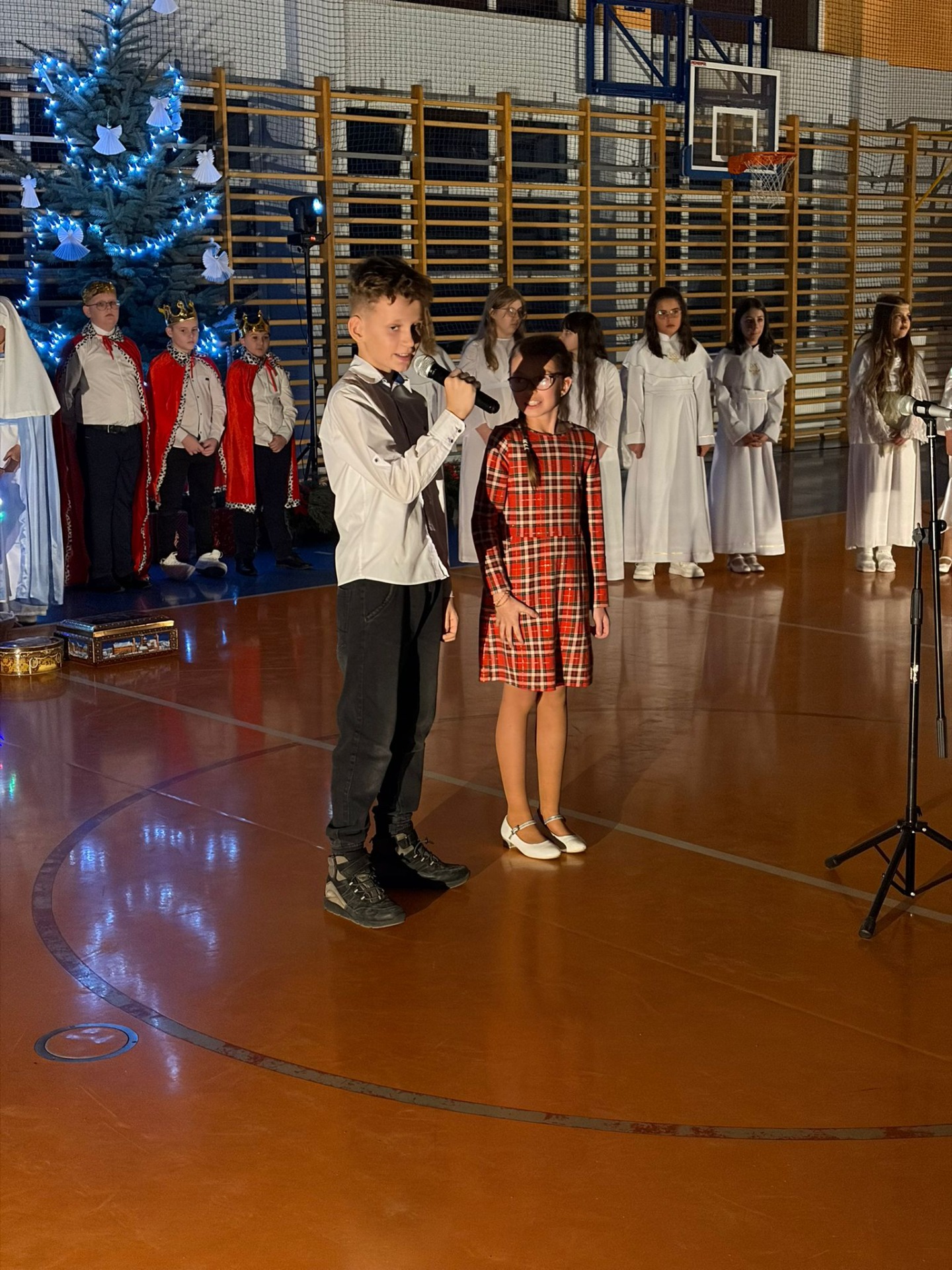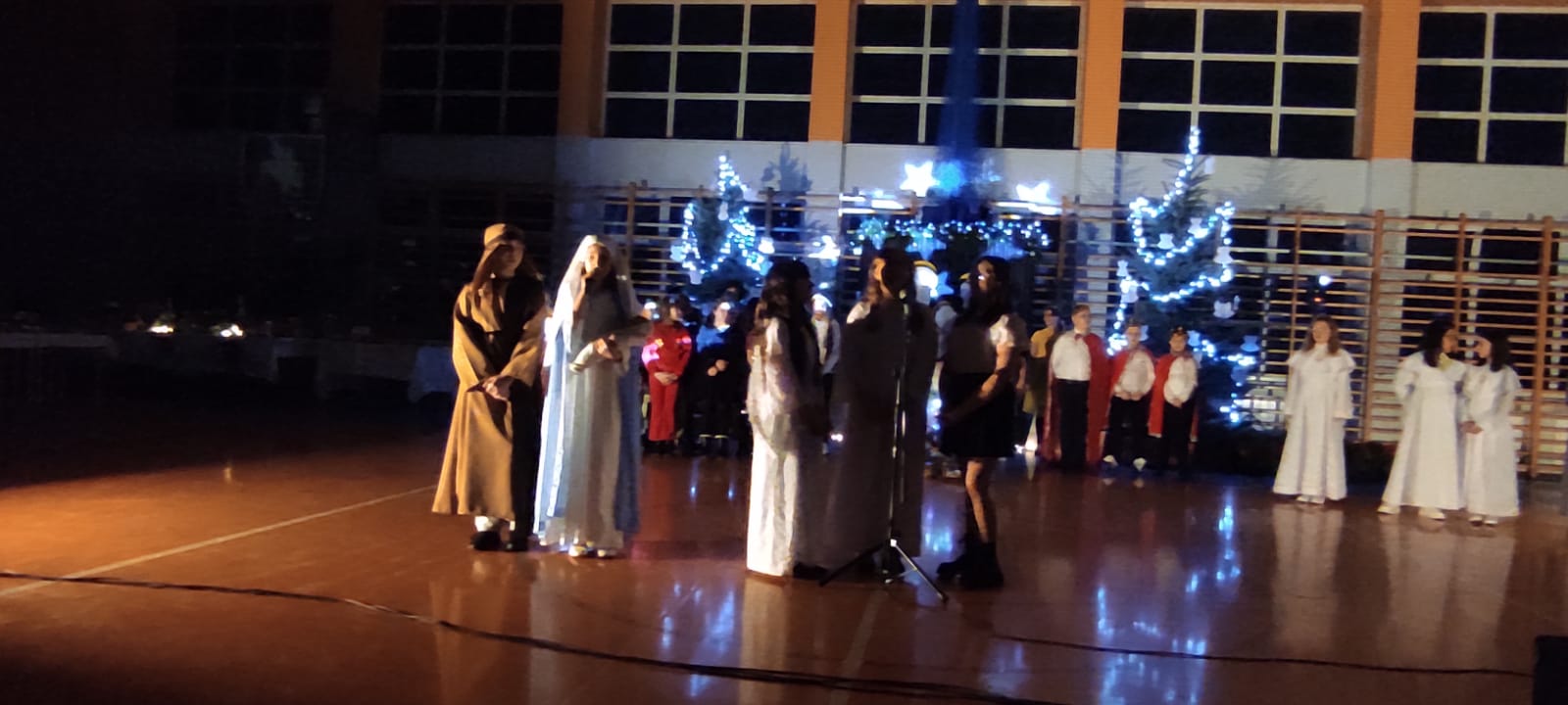 Uczniowie z kl. VI, V, IV a także z kl. I, III, II również przedszkolaki zaprezentowali jasełka pt.” Jedna jest taka noc”. Do występów uczniów przyczyniły się: p. A. Jankowska – chór i wykonania solowe małych artystów; p. Ż. Zygmunt przygotowanie tekstów , deklamację i dykcję. P. A. Chorąży wykonała dekorację przy współpracy z rodzicami i pracownikami obsługi. Piosenkę „jest taki dzień” przygotowały panie z przedszkola z dziećmi przy współudziale rodziców. Koordynatorem szkolnych wydarzeń była p. K. Milewska.