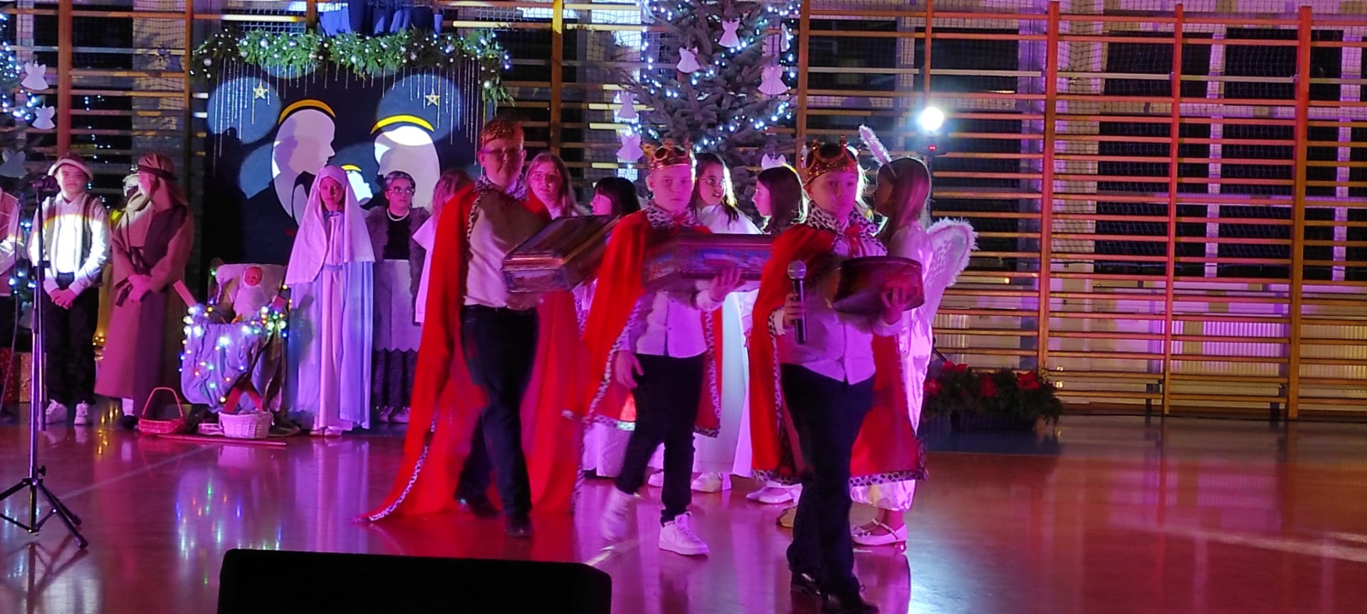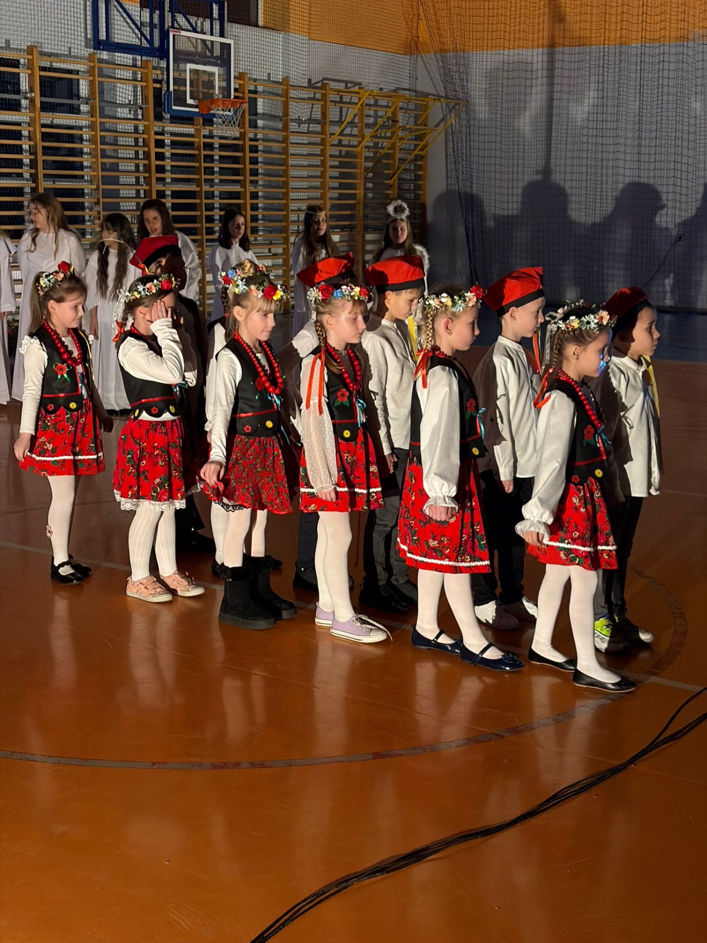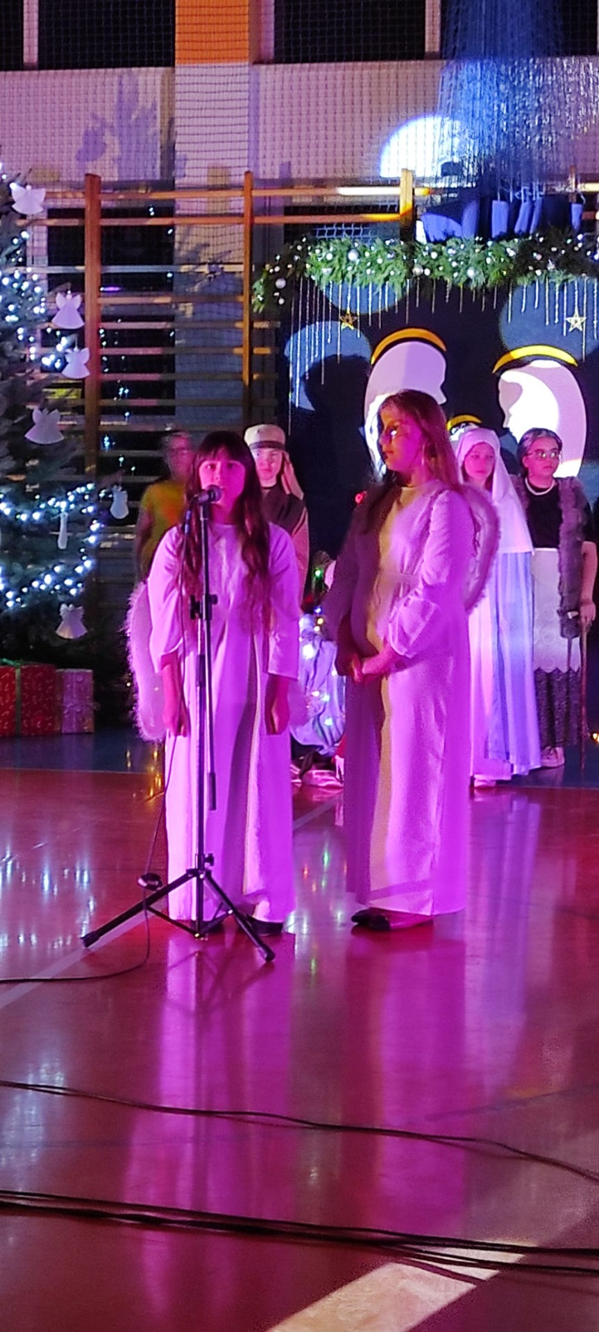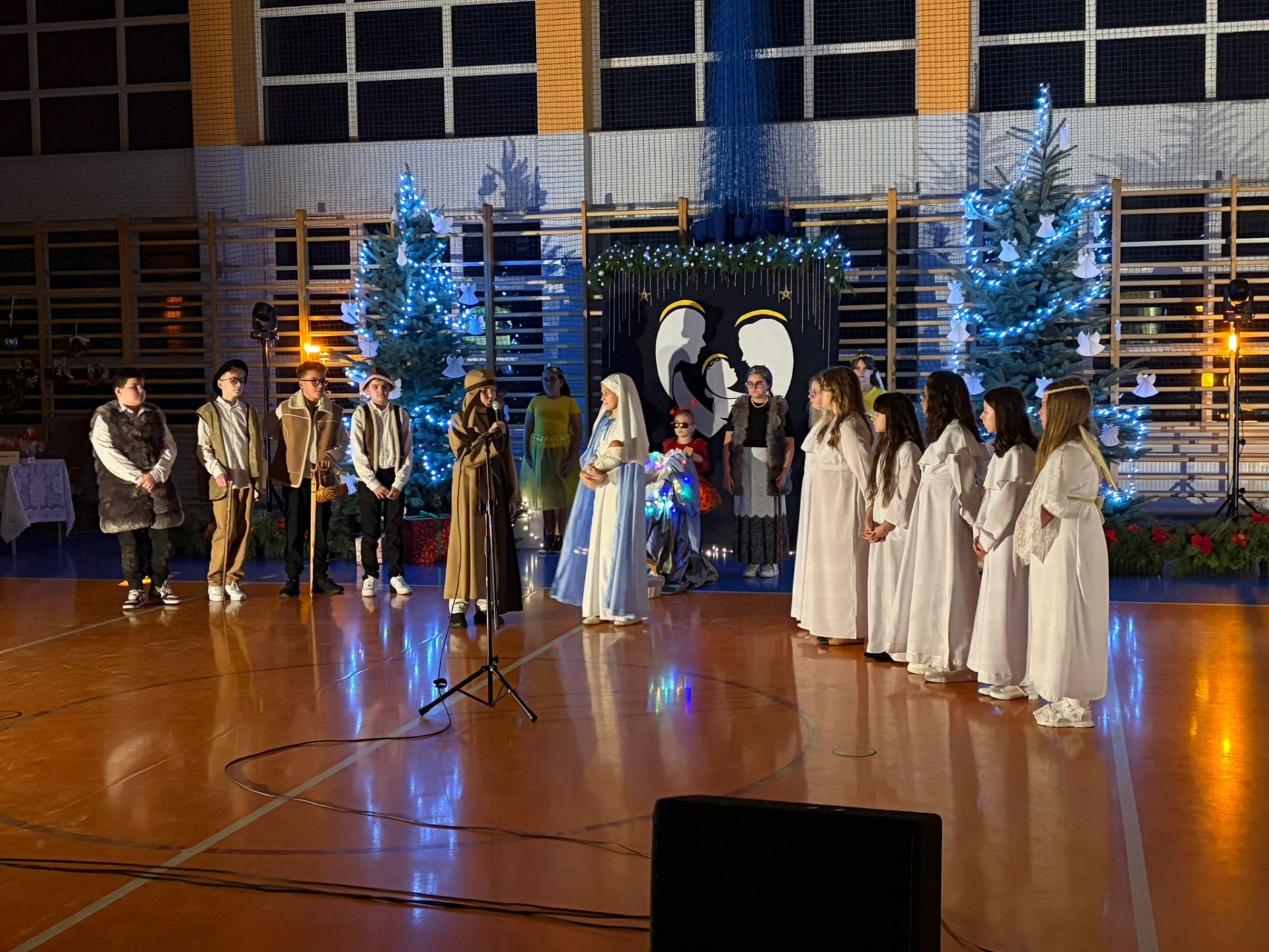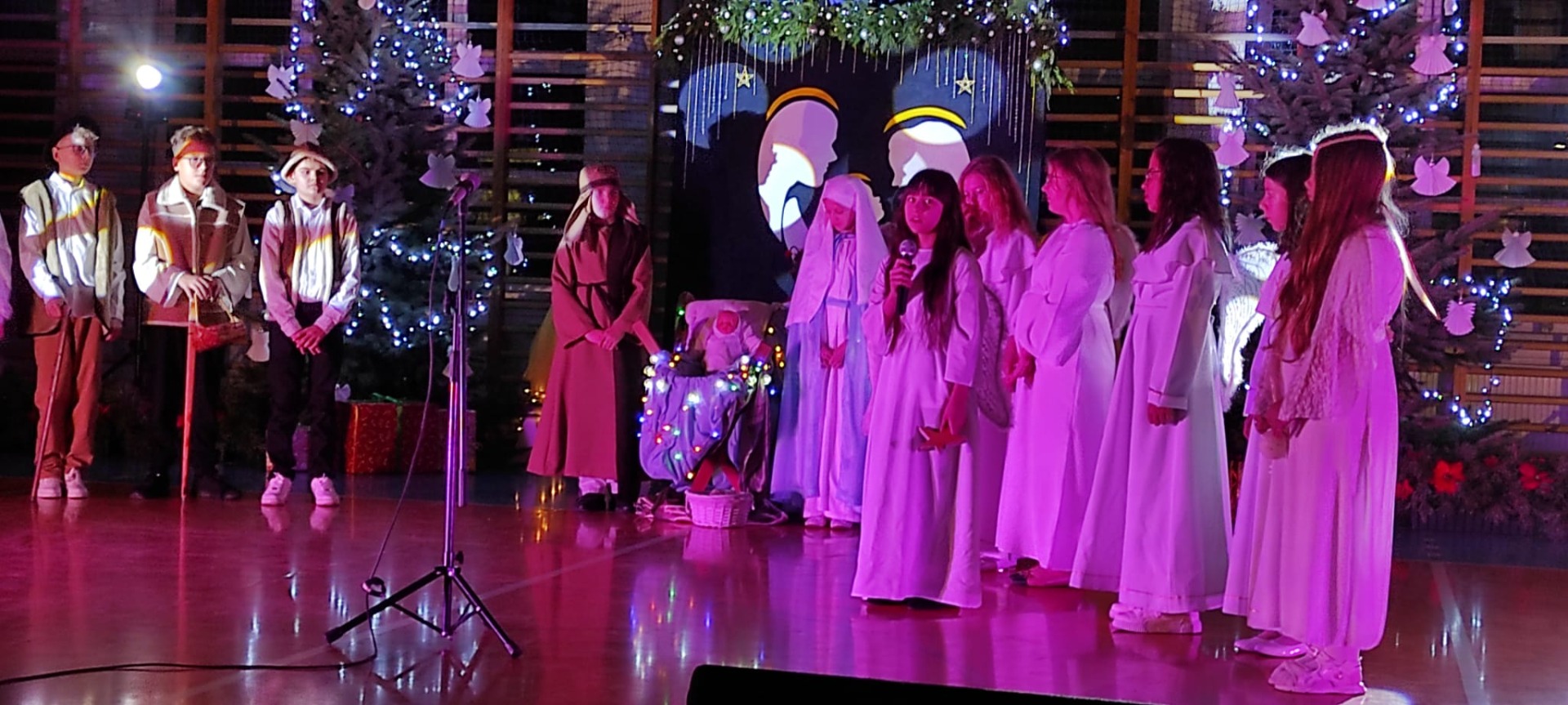 Uczniowie z kl. VI, V, IV a także z kl. I, III, II również przedszkolaki zaprezentowali jasełka pt.” Jedna jest taka noc”. Do występów uczniów przyczyniły się: p. A. Jankowska – chór i wykonania solowe małych artystów; p. Ż. Zygmunt przygotowanie tekstów , deklamację i dykcję. P. A. Chorąży wykonała dekorację przy współpracy z rodzicami i pracownikami obsługi. Piosenkę „jest taki dzień” przygotowały panie z przedszkola z dziećmi przy współudziale rodziców. Koordynatorem szkolnych wydarzeń była p. K. Milewska.