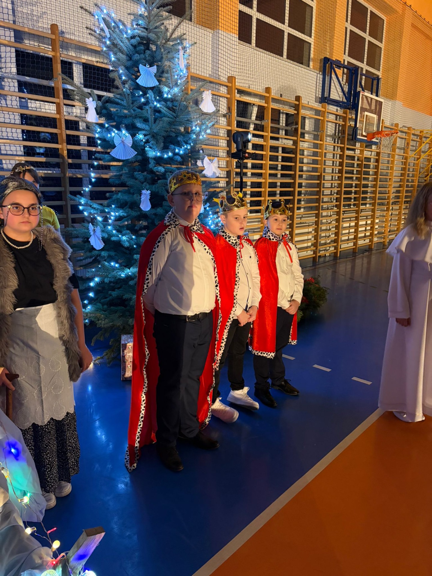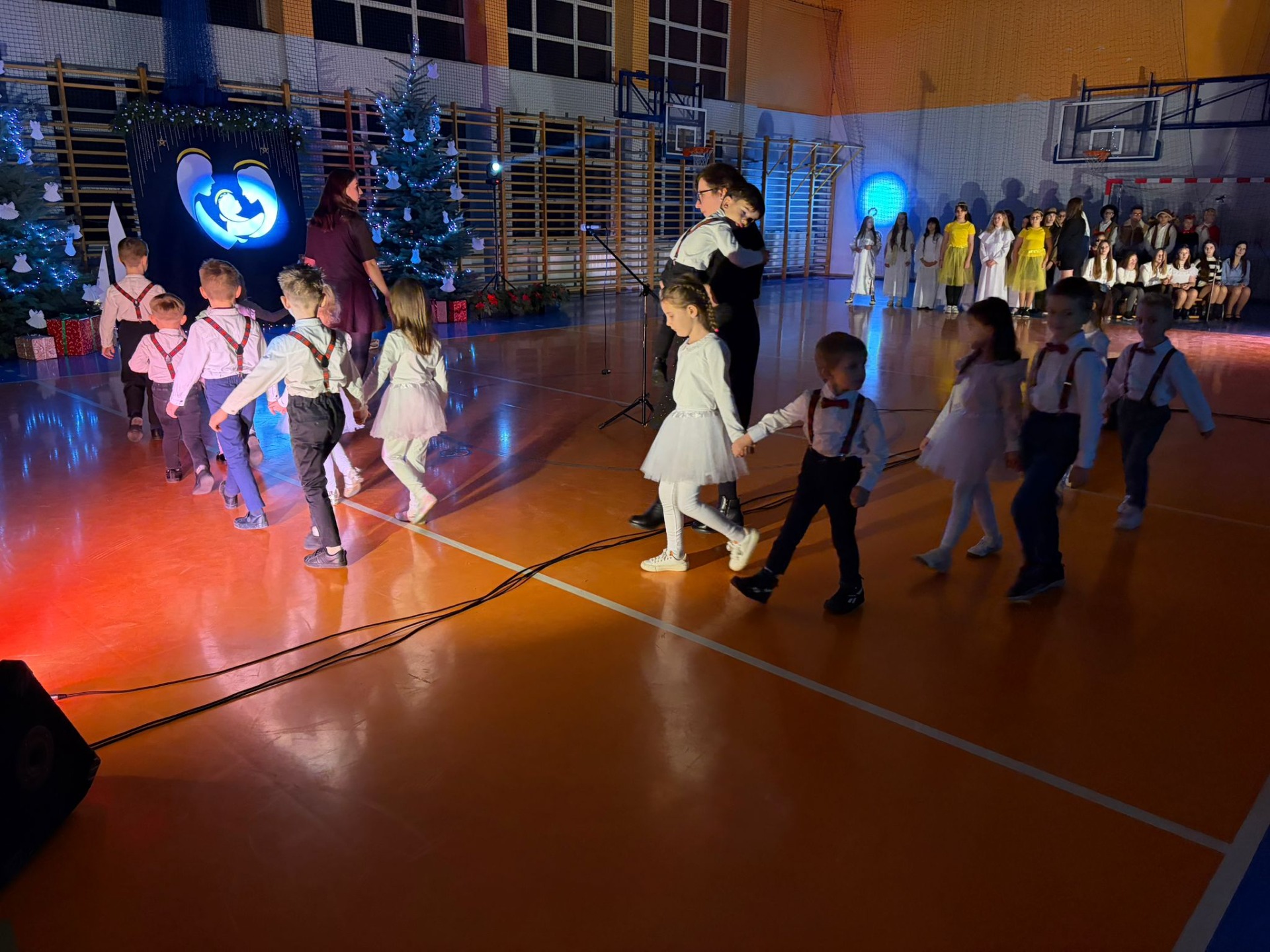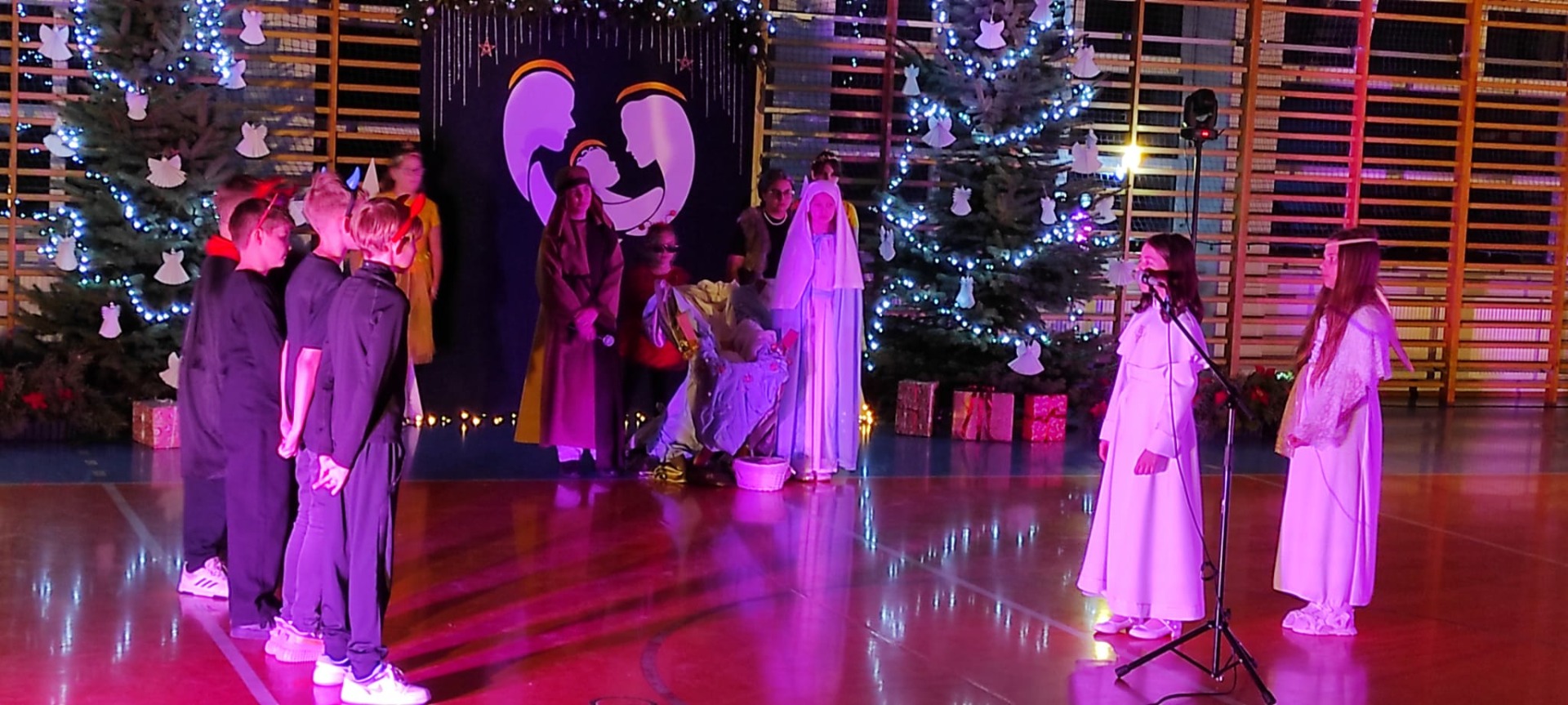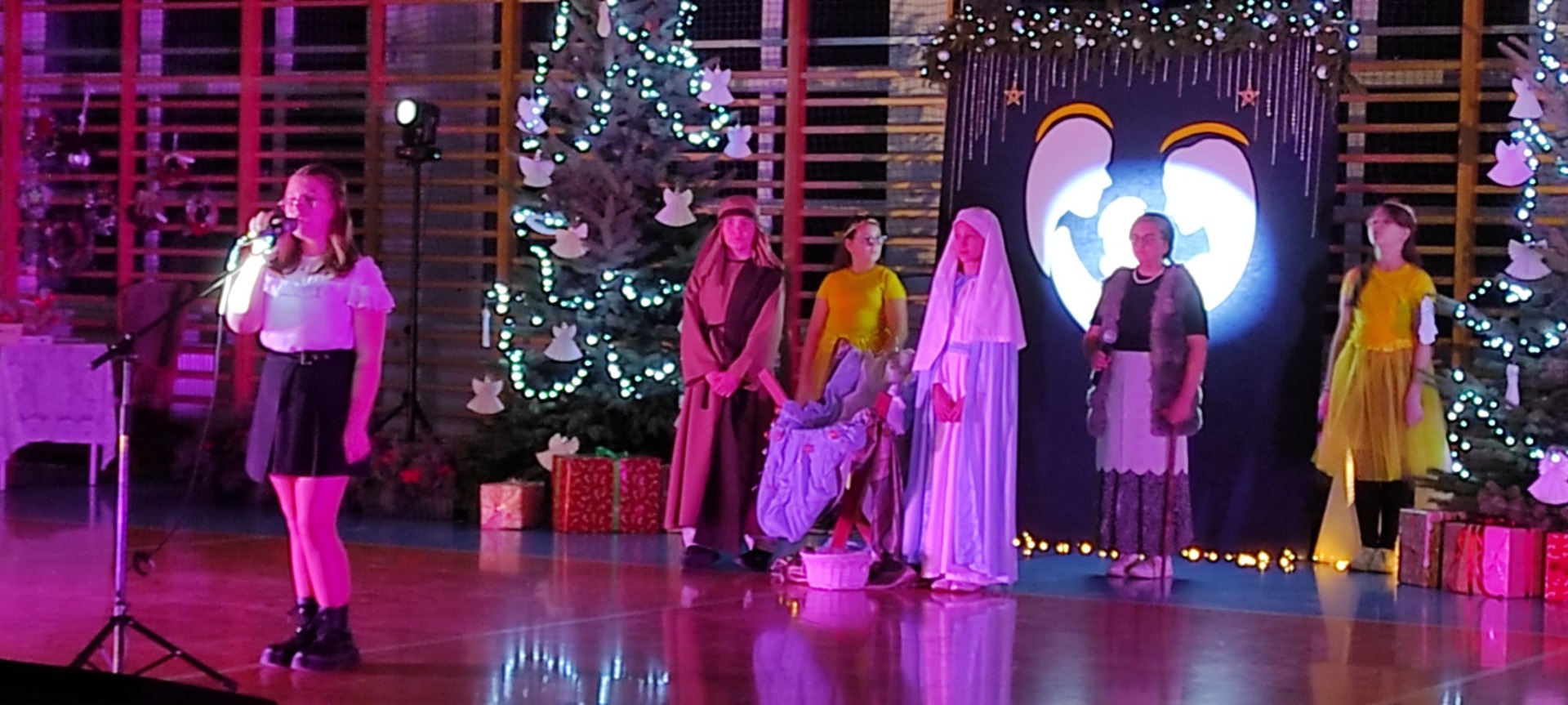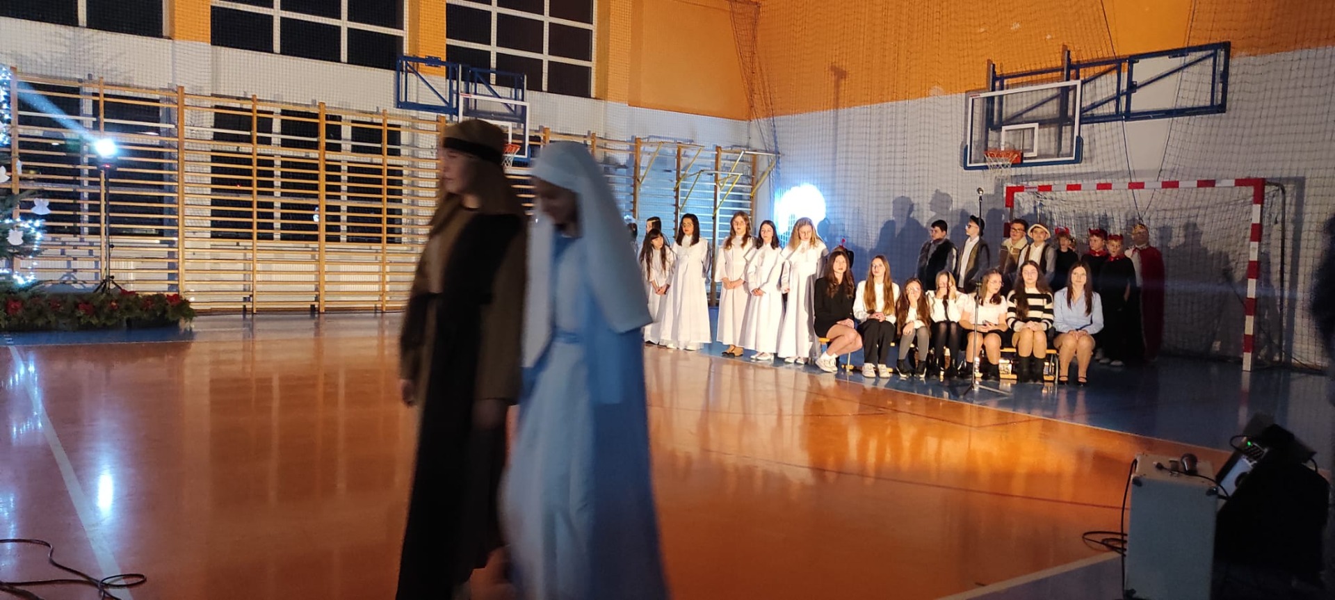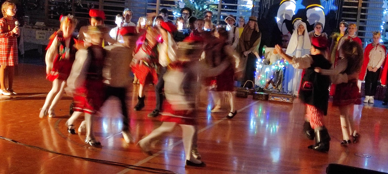 Uczniowie z kl. VI, V, IV a także z kl. I, III, II również przedszkolaki zaprezentowali jasełka pt.” Jedna jest taka noc”. Do występów uczniów przyczyniły się: p. A. Jankowska – chór i wykonania solowe małych artystów; p. Ż. Zygmunt przygotowanie tekstów , deklamację i dykcję. P. A. Chorąży wykonała dekorację przy współpracy z rodzicami i pracownikami obsługi. Piosenkę „jest taki dzień” przygotowały panie z przedszkola z dziećmi przy współudziale rodziców. Koordynatorem szkolnych wydarzeń była p. K. Milewska.