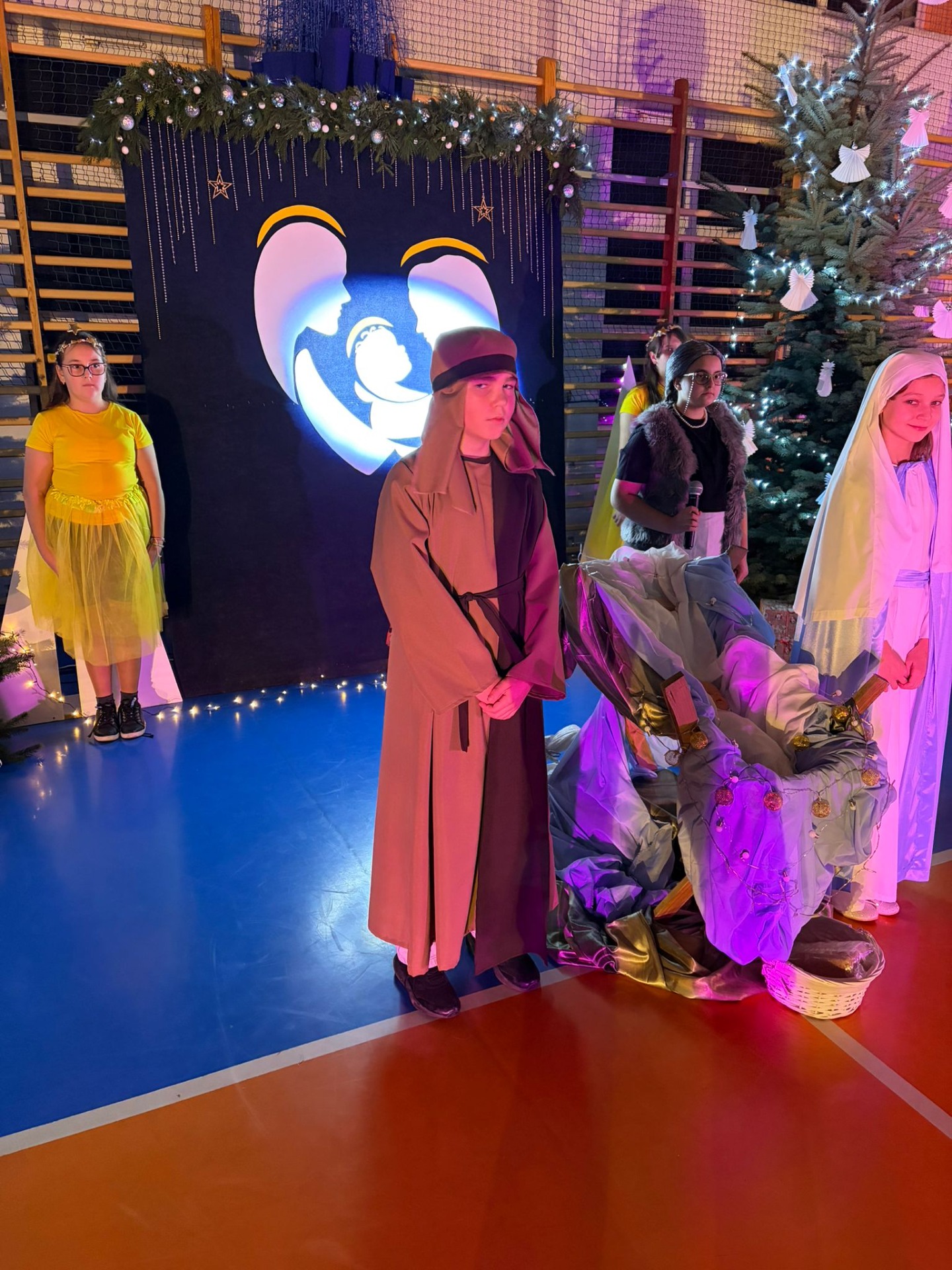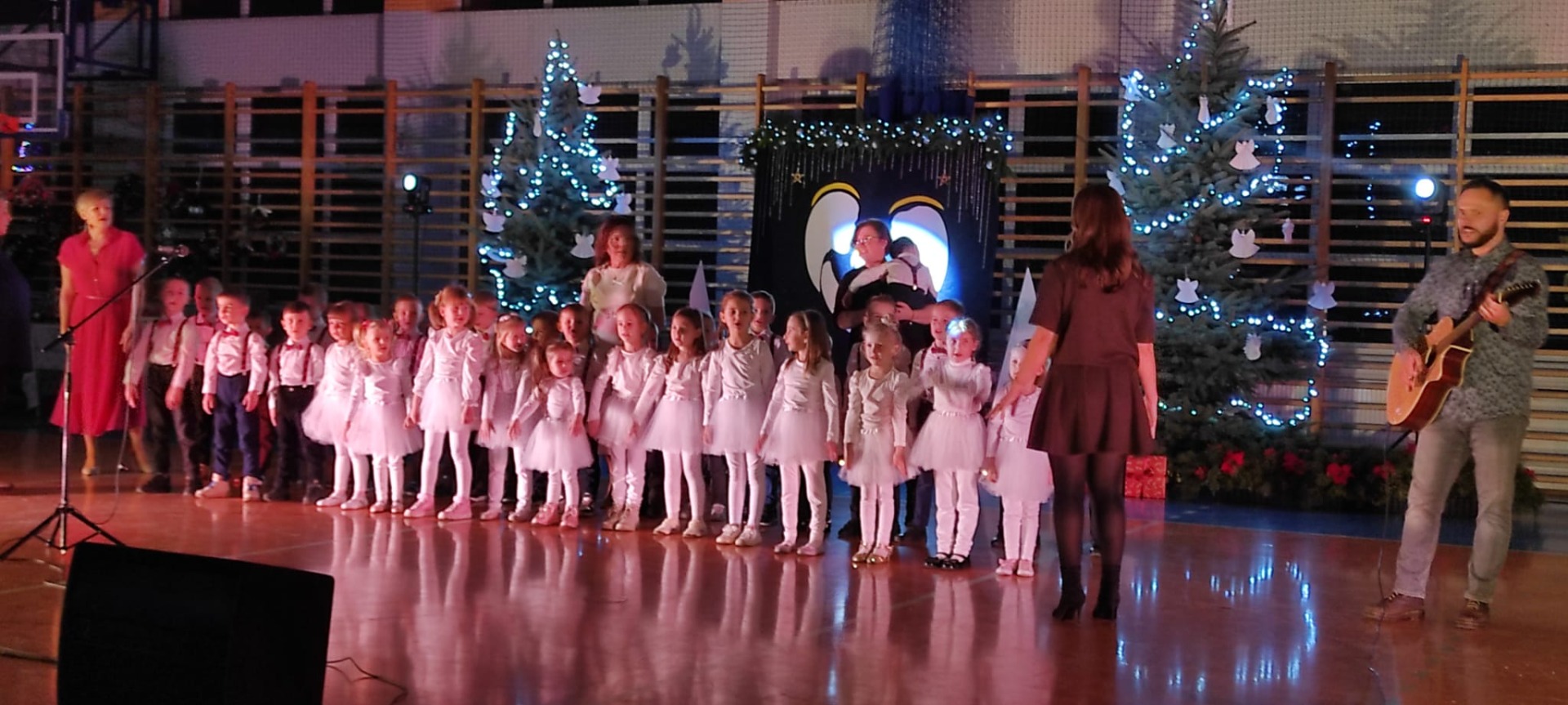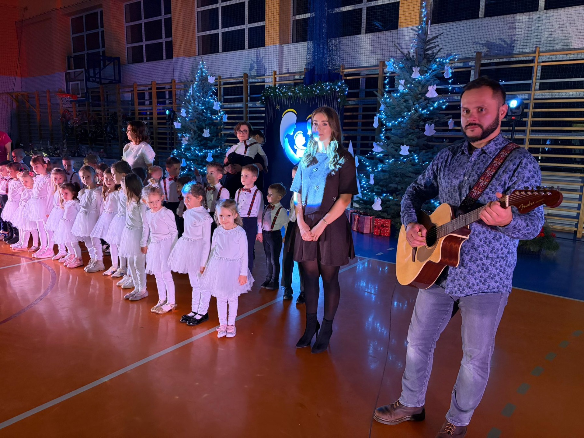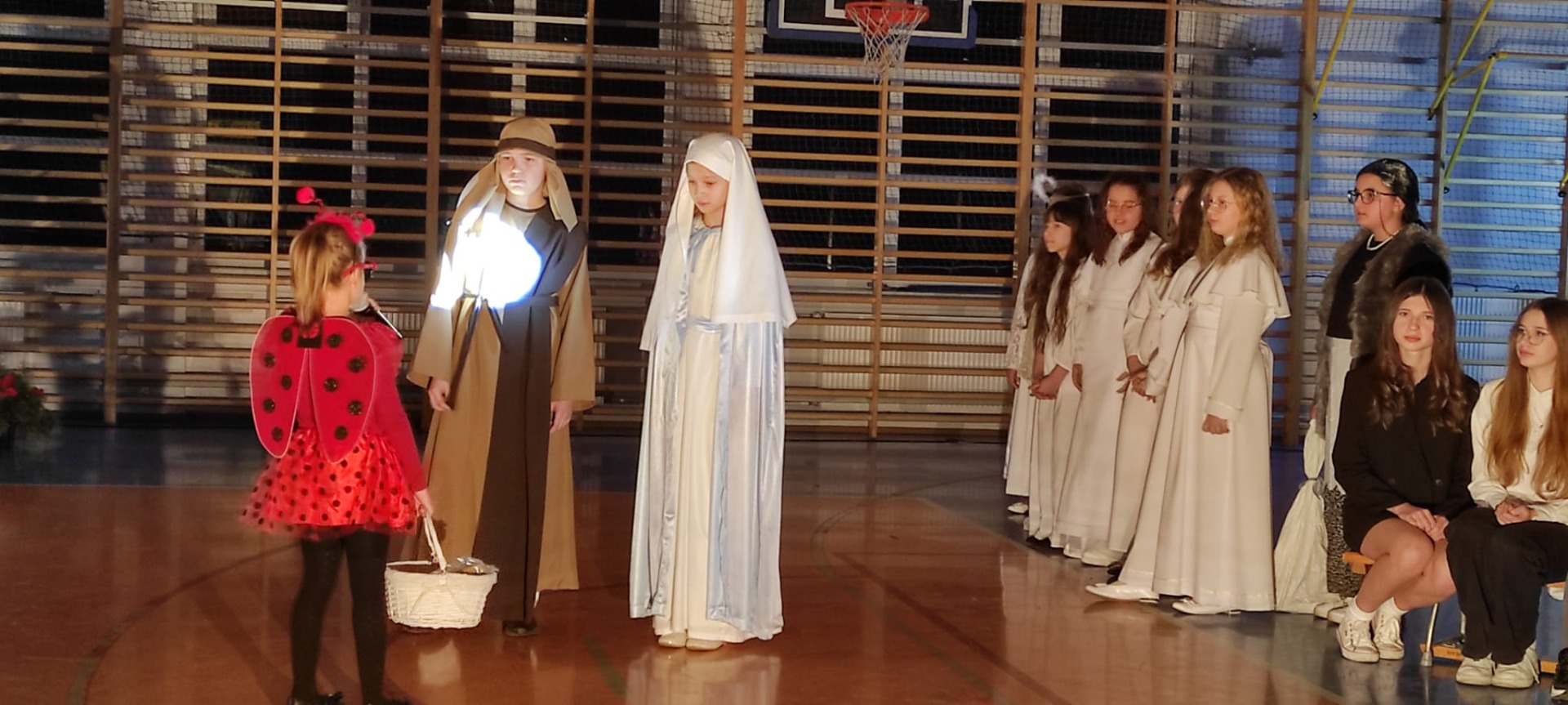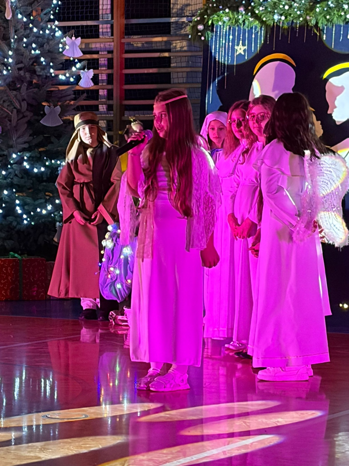 Uczniowie z kl. VI, V, IV a także z kl. I, III, II również przedszkolaki zaprezentowali jasełka pt.” Jedna jest taka noc”. Do występów uczniów przyczyniły się: p. A. Jankowska – chór i wykonania solowe małych artystów; p. Ż. Zygmunt przygotowanie tekstów , deklamację i dykcję. P. A. Chorąży wykonała dekorację przy współpracy z rodzicami i pracownikami obsługi. Piosenkę „jest taki dzień” przygotowały panie z przedszkola z dziećmi przy współudziale rodziców. Koordynatorem szkolnych wydarzeń była p. K. Milewska.