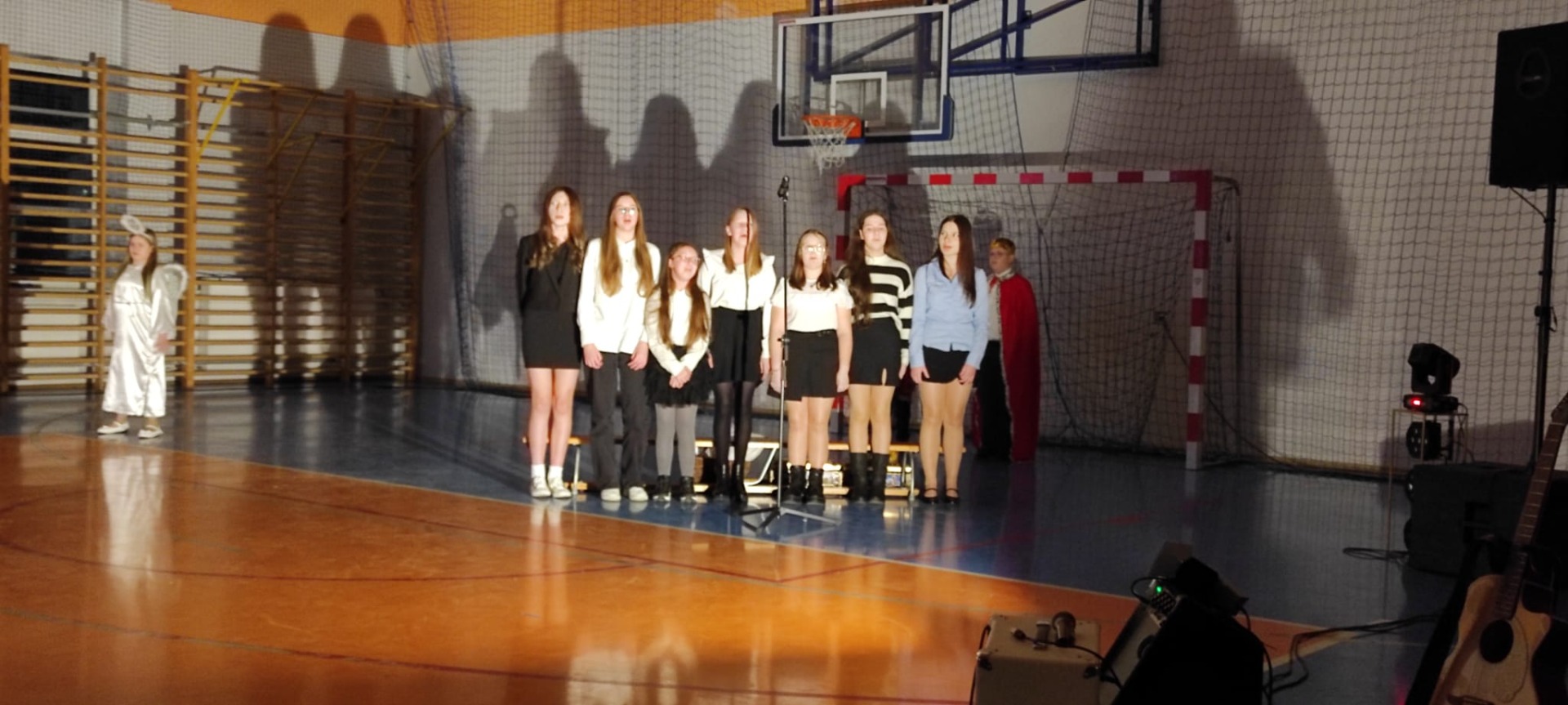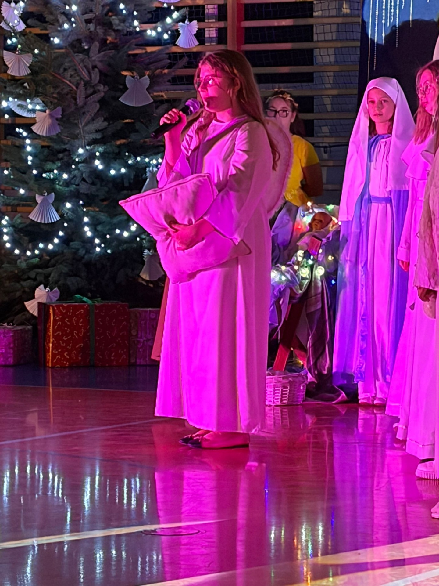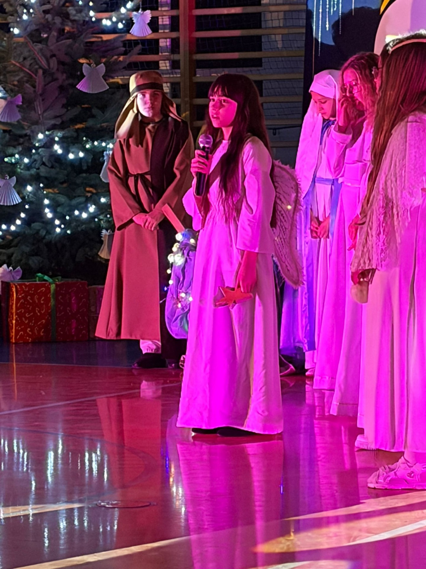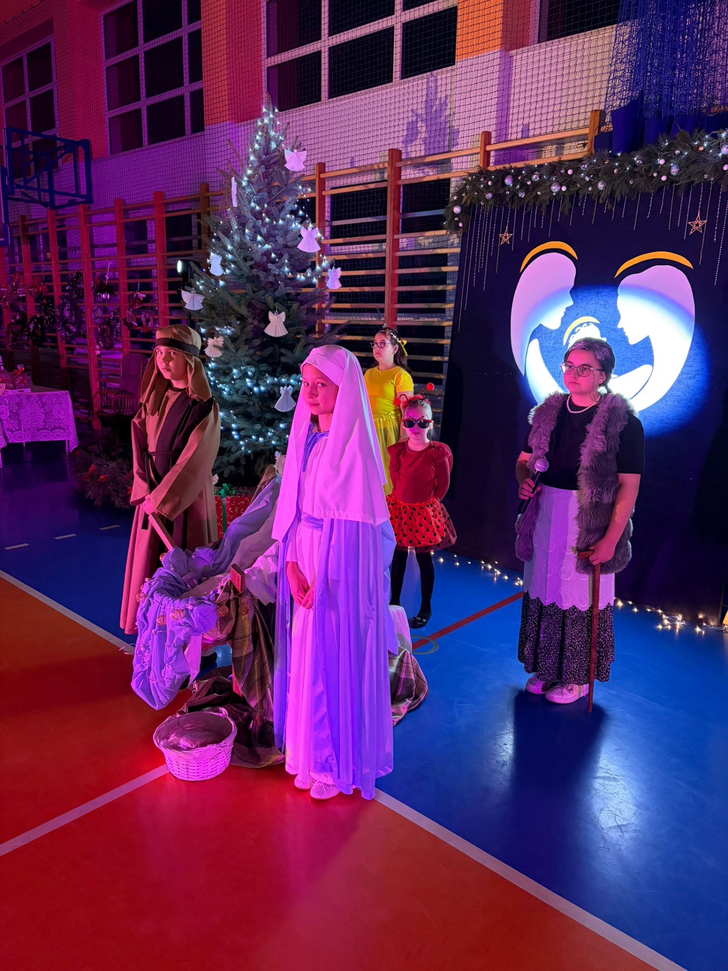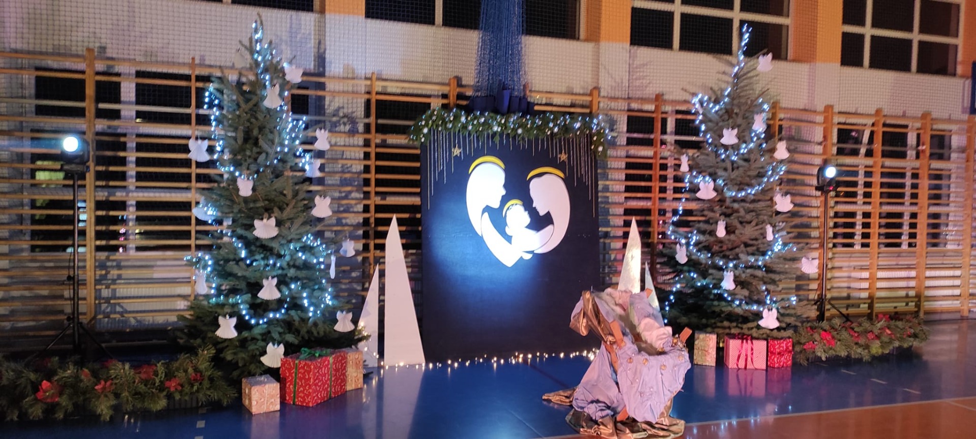 Uczniowie z kl. VI, V, IV a także z kl. I, III, II również przedszkolaki zaprezentowali jasełka pt.” Jedna jest taka noc”. Do występów uczniów przyczyniły się: p. A. Jankowska – chór i wykonania solowe małych artystów; p. Ż. Zygmunt przygotowanie tekstów , deklamację i dykcję. P. A. Chorąży wykonała dekorację przy współpracy z rodzicami i pracownikami obsługi. Piosenkę „jest taki dzień” przygotowały panie z przedszkola z dziećmi przy współudziale rodziców. Koordynatorem szkolnych wydarzeń była p. K. Milewska.
